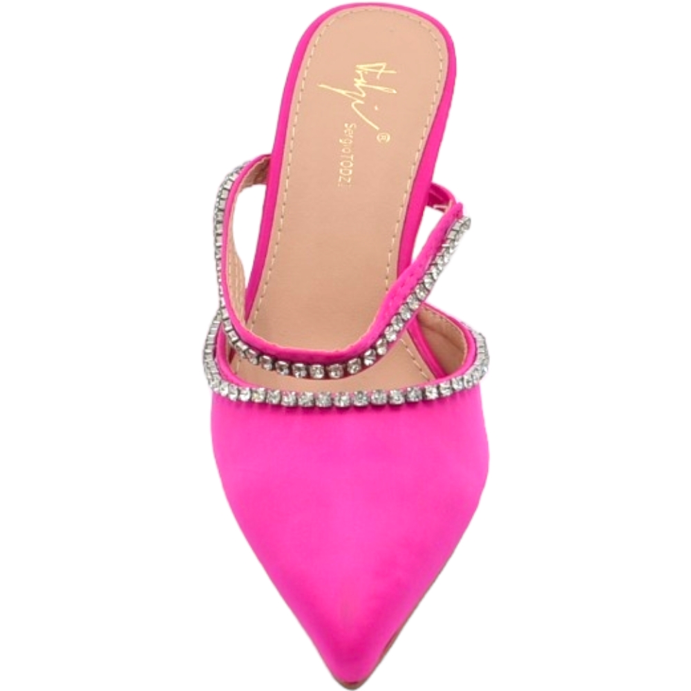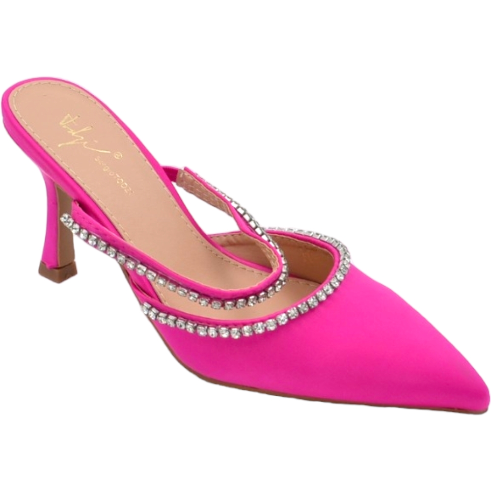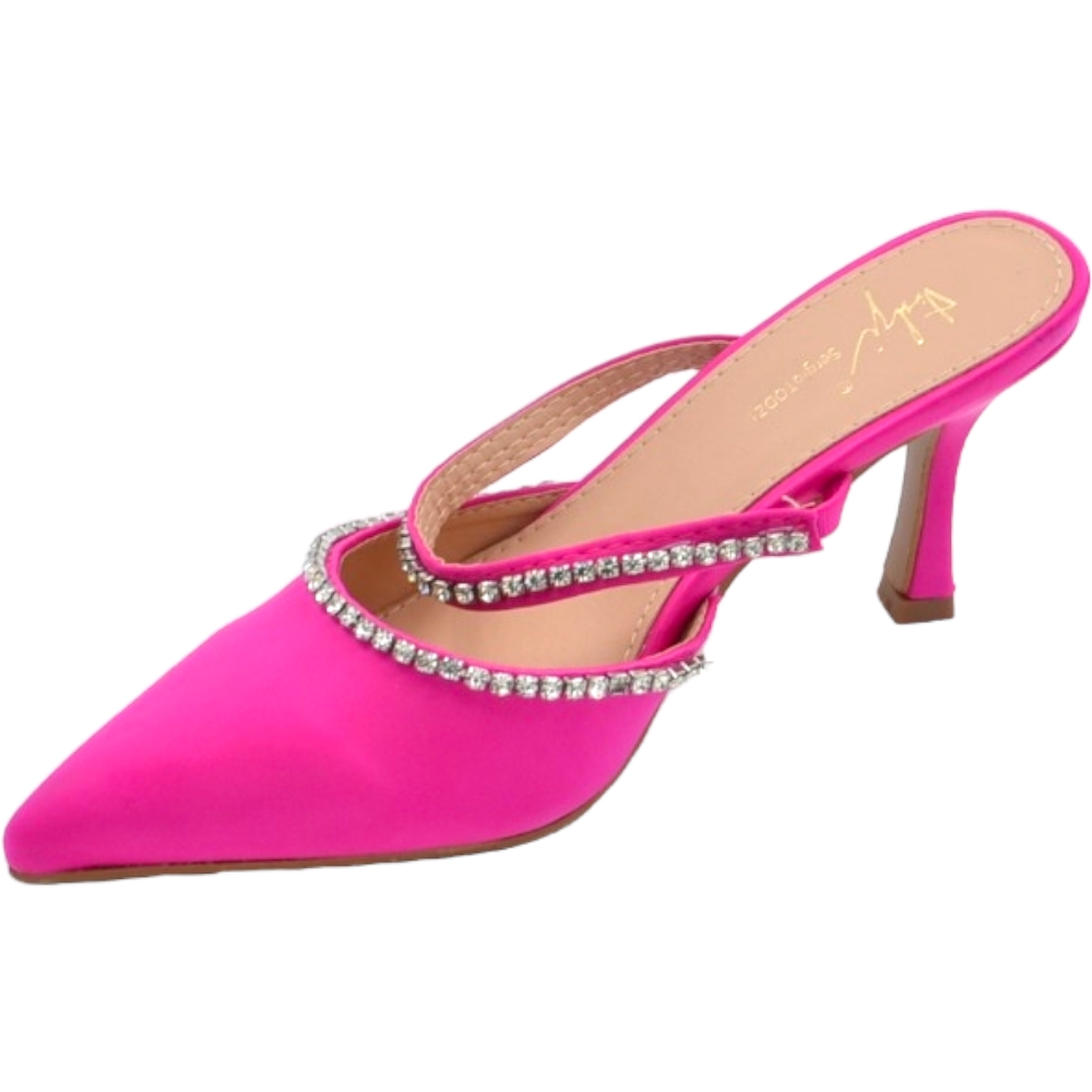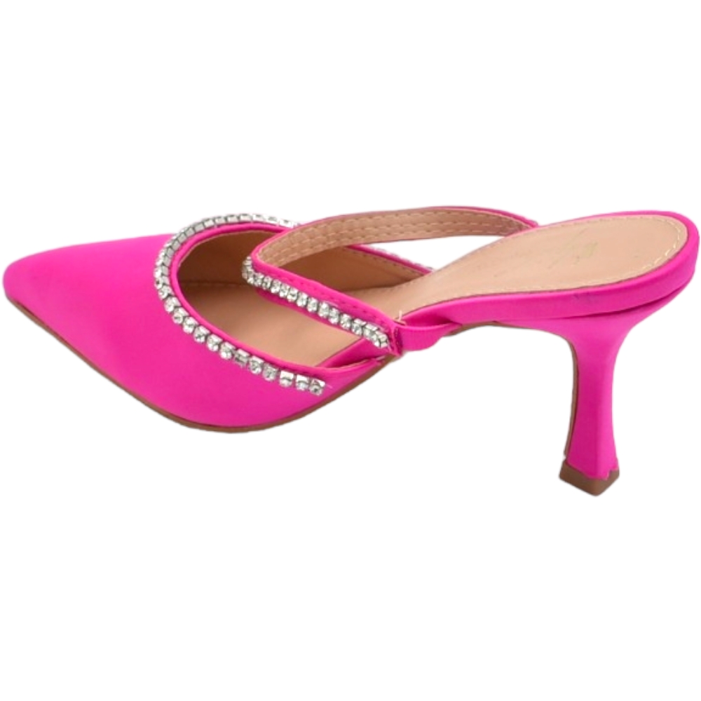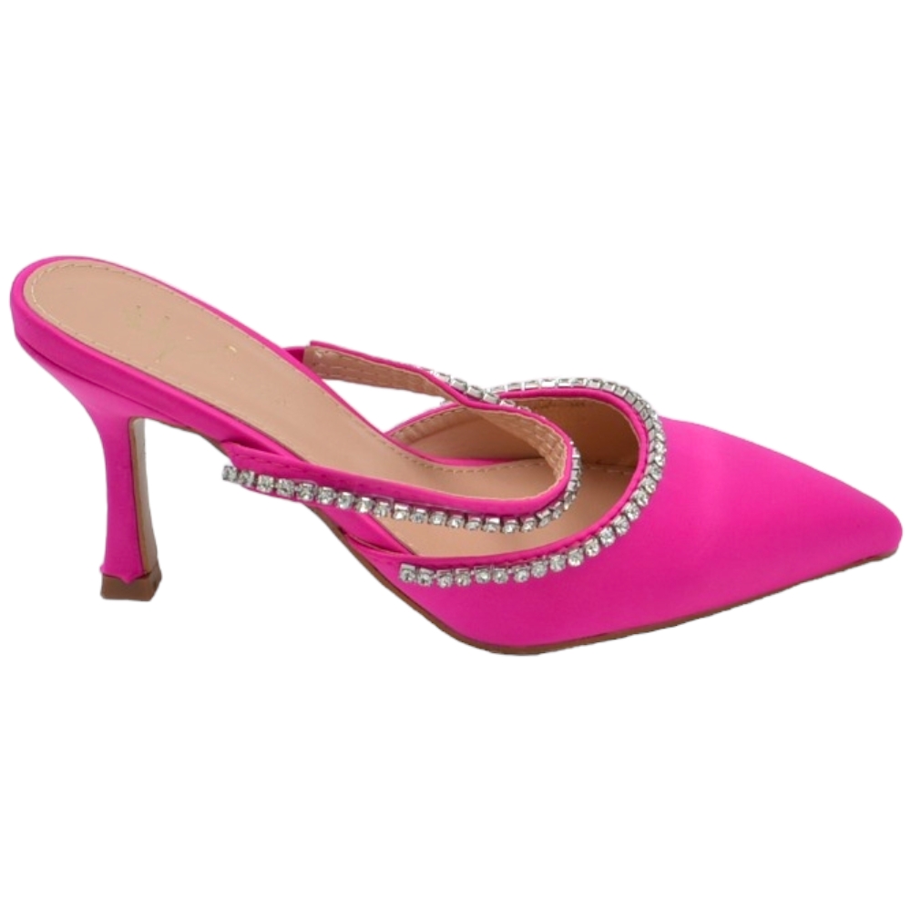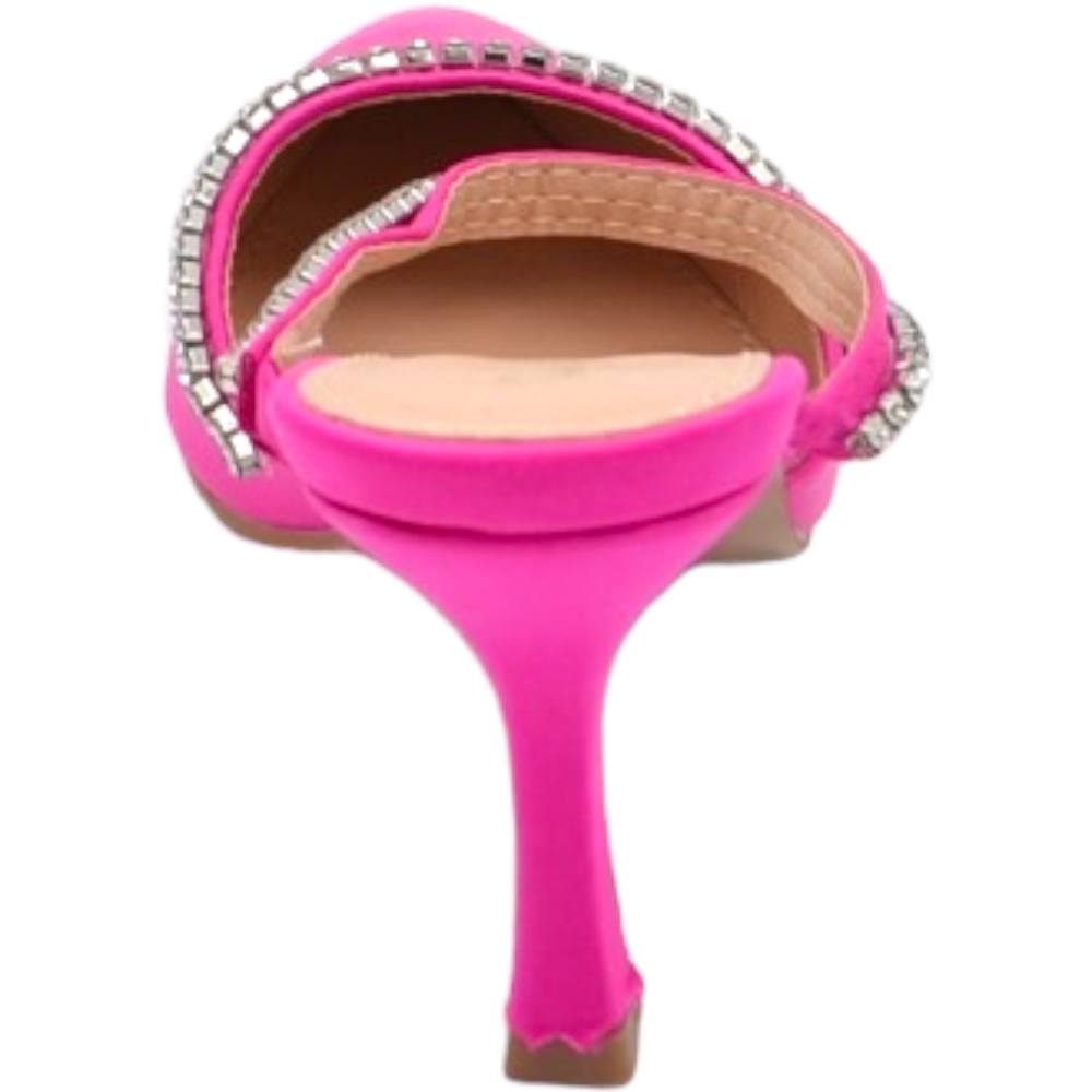 Decollete mules slingback in raso fucsia con fascia di brillantini sul dorso tacco a spillo comodo 6 cm moda