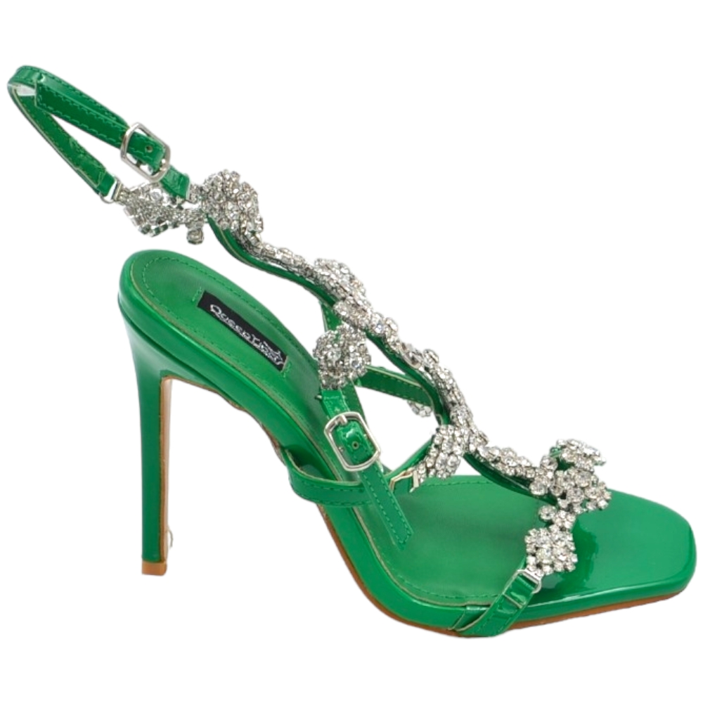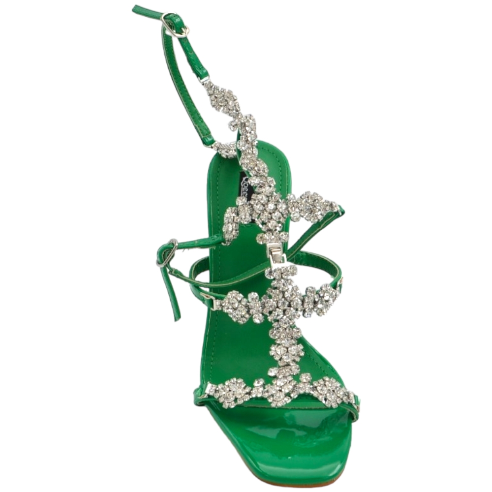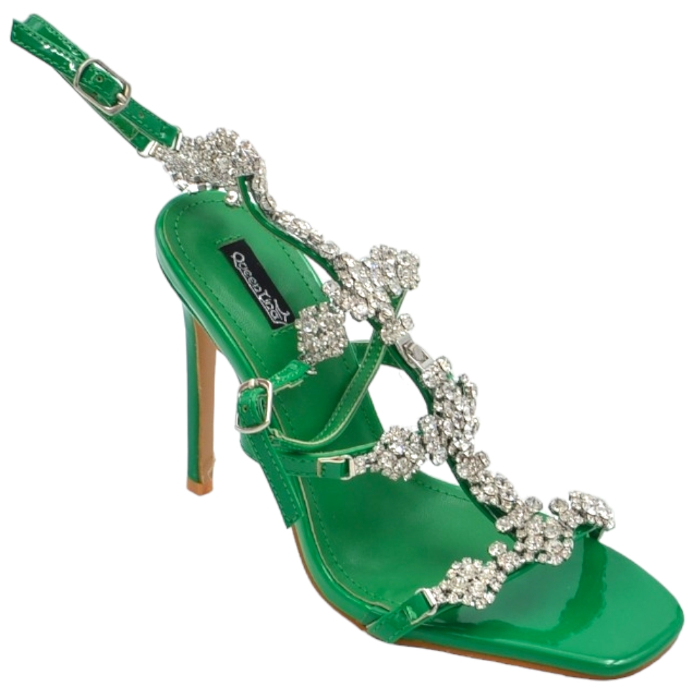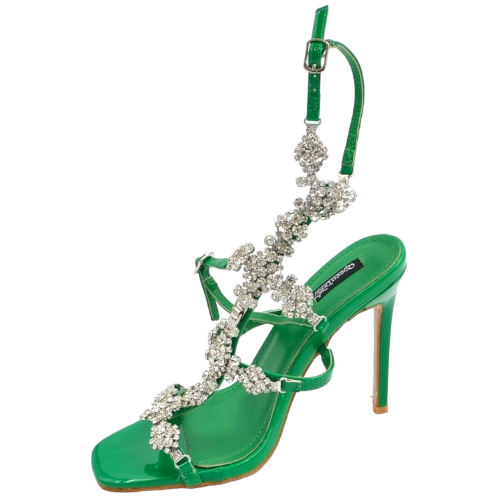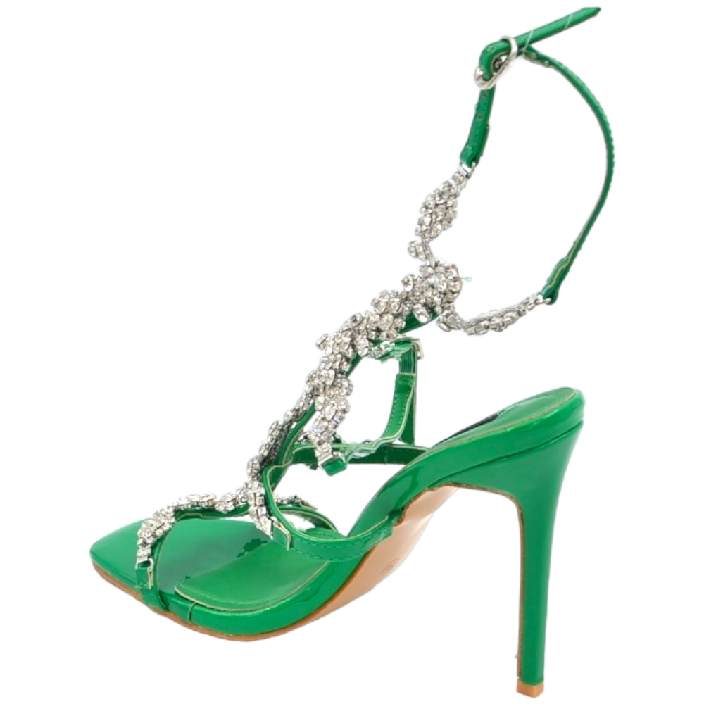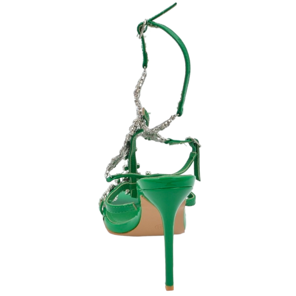 Sandalo gioiello donna con tacco 12 verde inserti di strass luccicanti cinturino alla caviglia effetto piede nudo moda