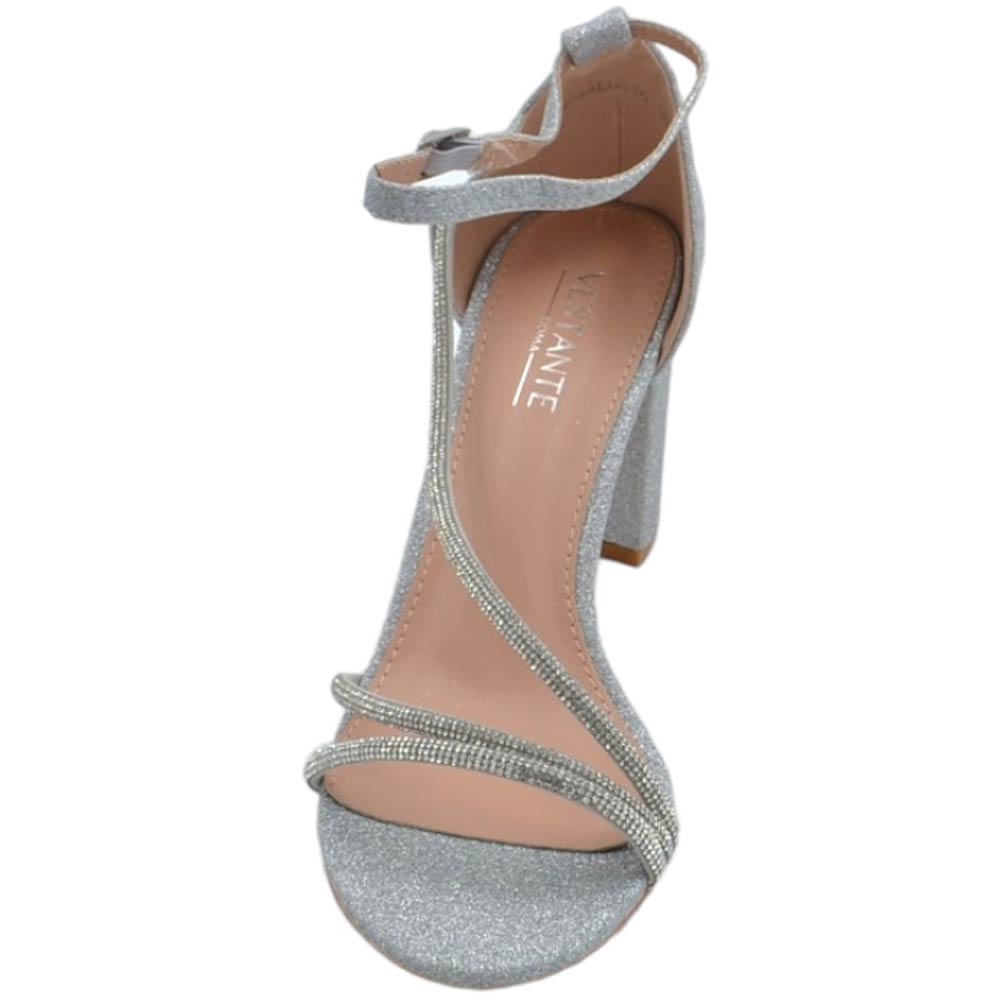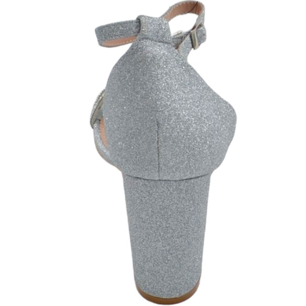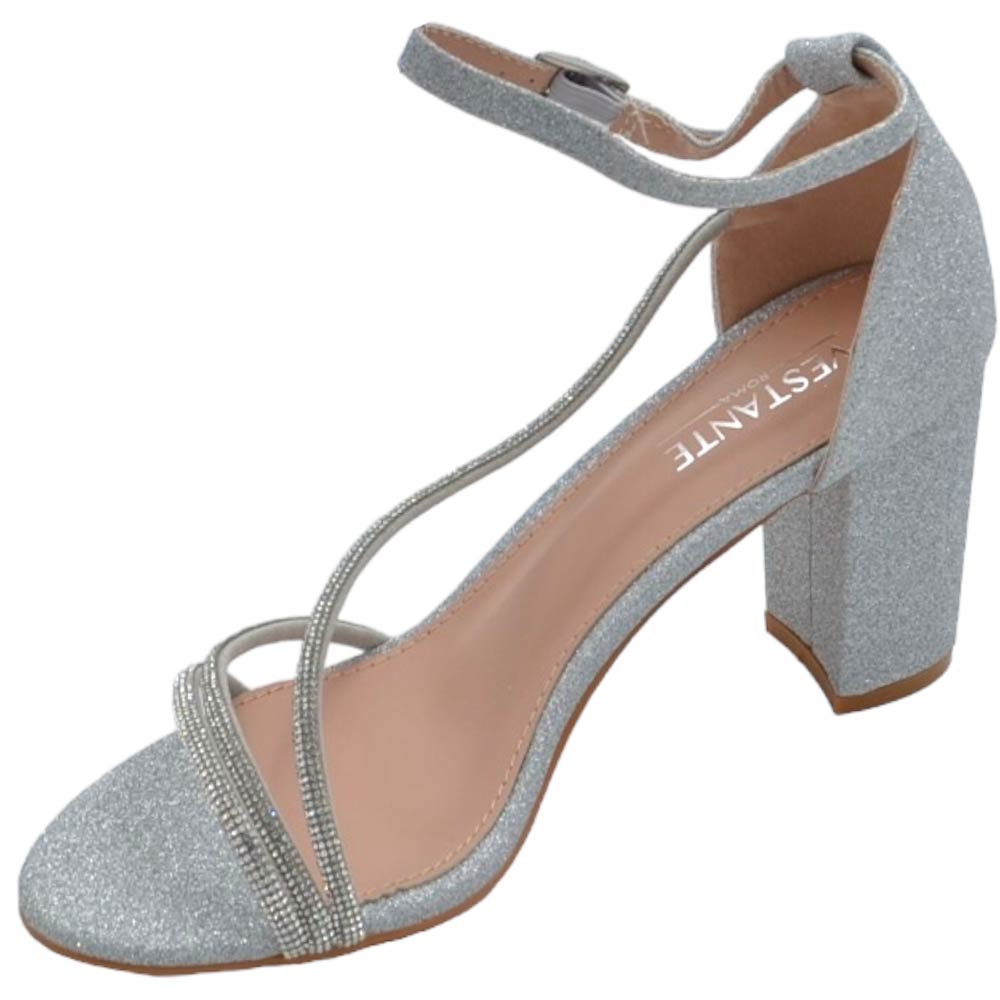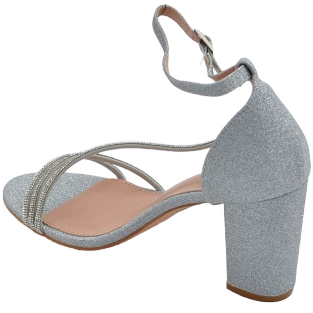 Scarpe sandalo donna argento in tessuto satinato fasce a incrocio strass e chiusura alla caviglia tacco largo comodo 5cm