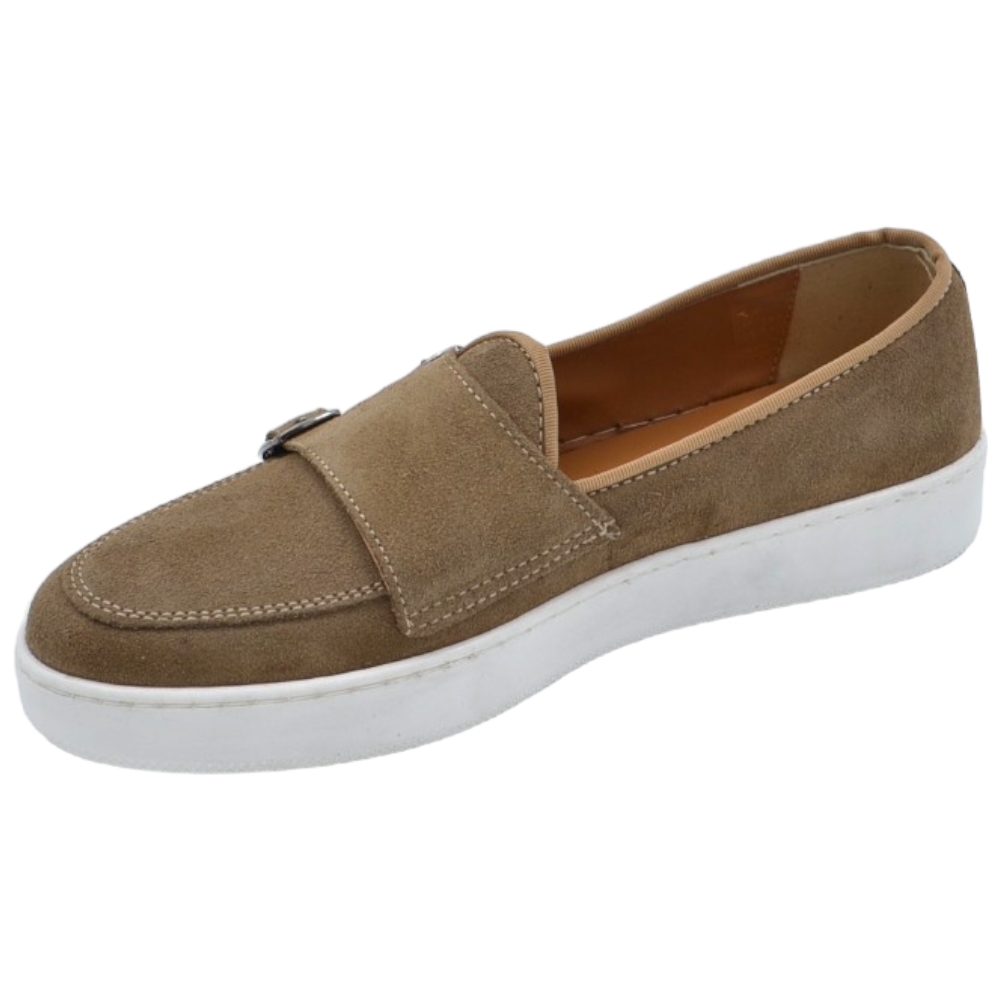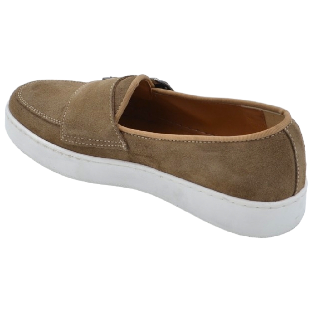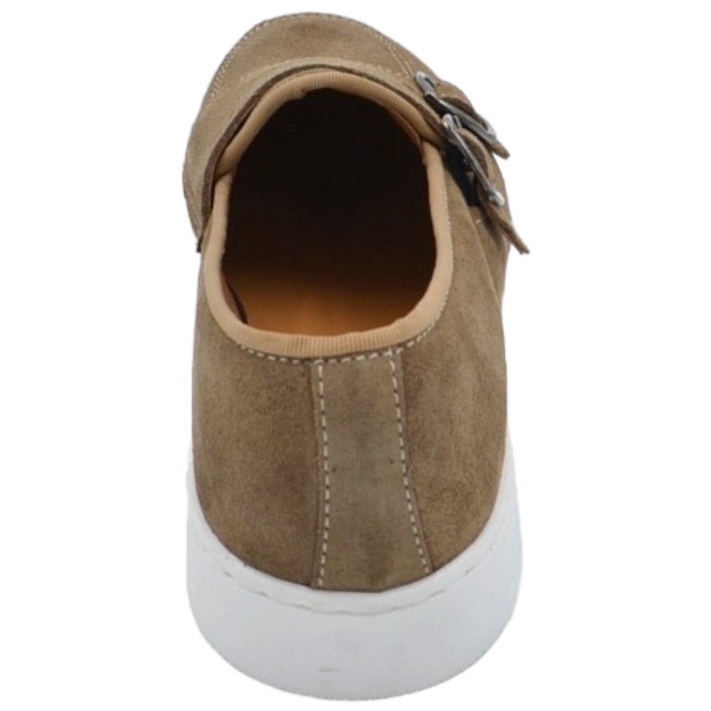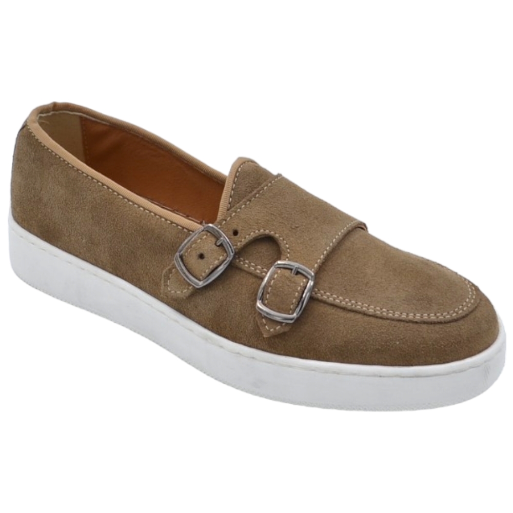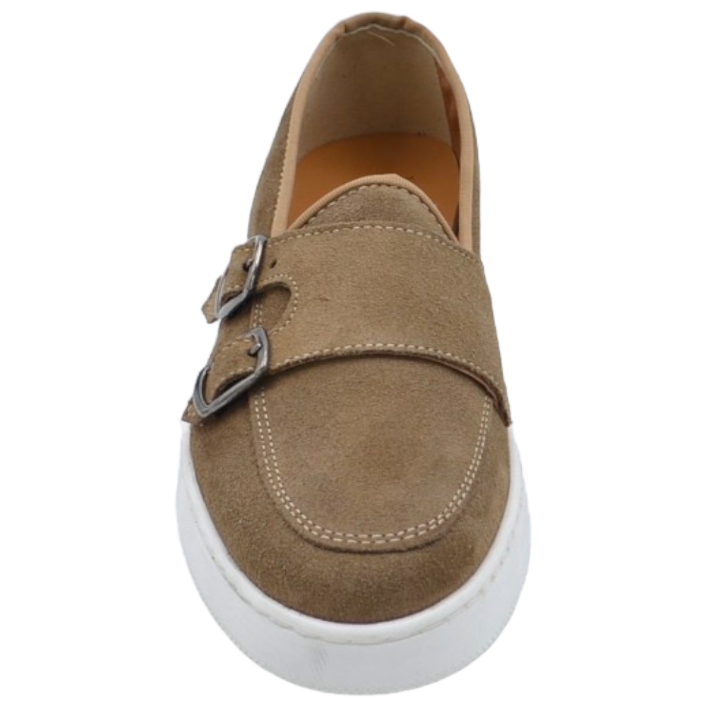 Mocassini uomo doppia fibbia argento classico sportivo vera pelle camoscio beige cuciture in punta fondo bianco alto 3cm