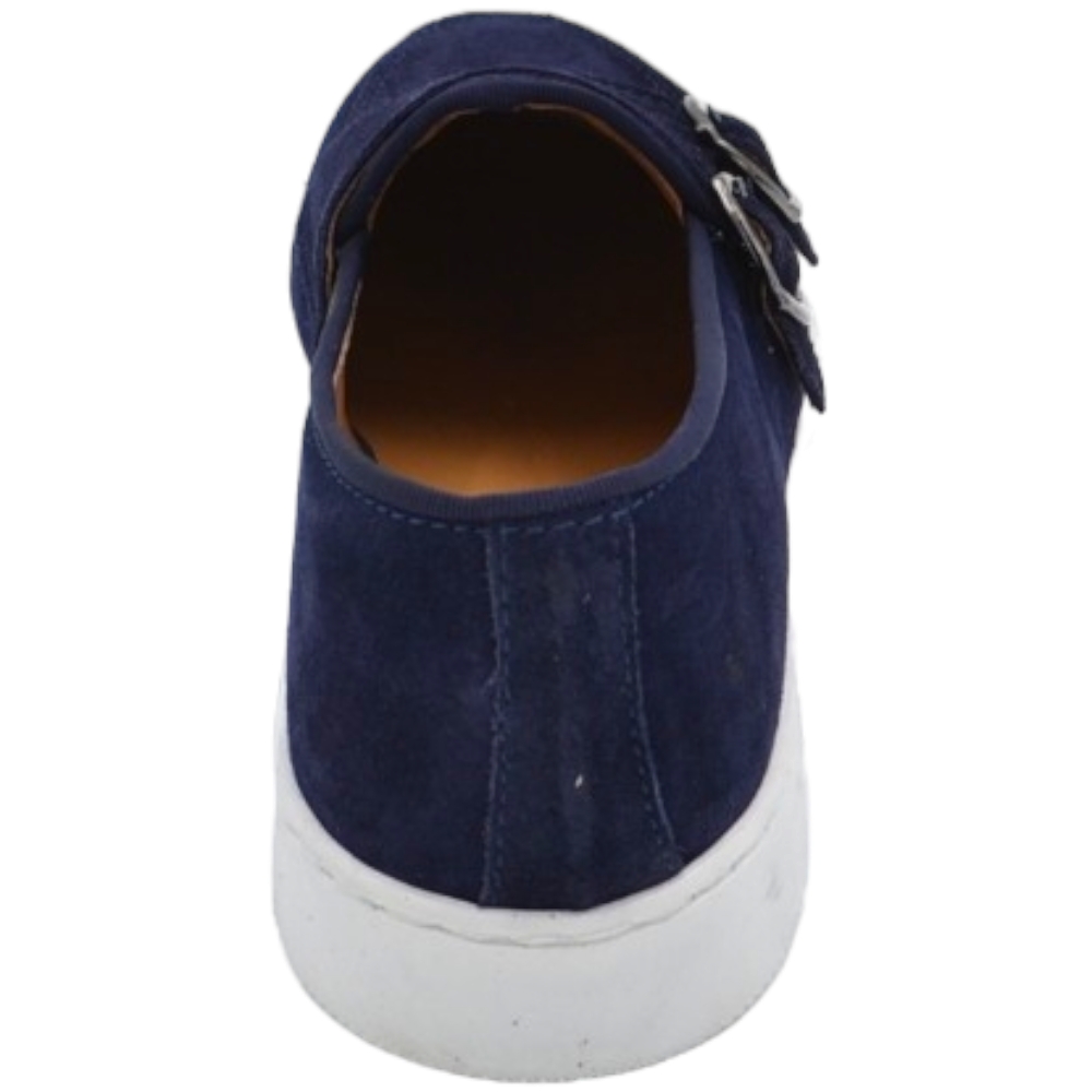 Mocassini uomo doppia fibbia argento classico sportivo vera pelle camoscio blu cuciture in punta fondo bianco alto 3cm