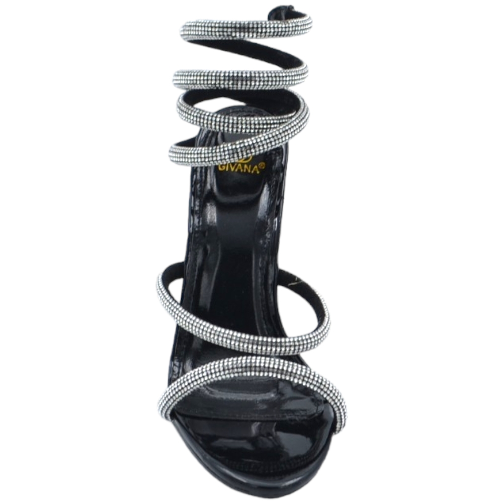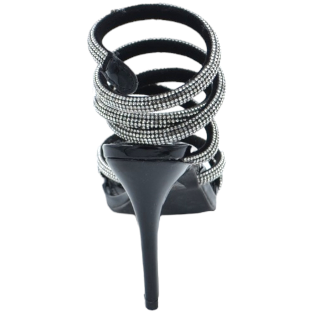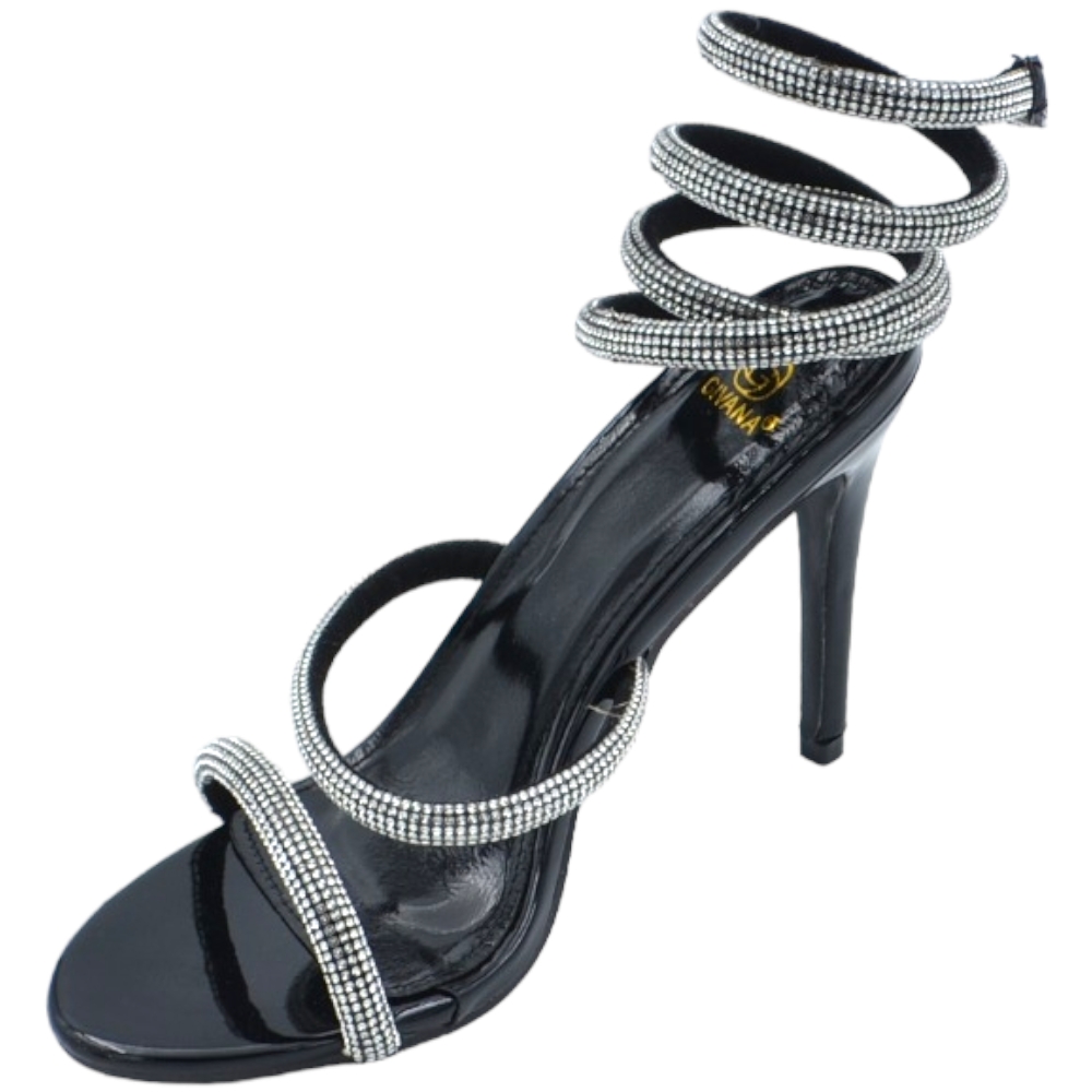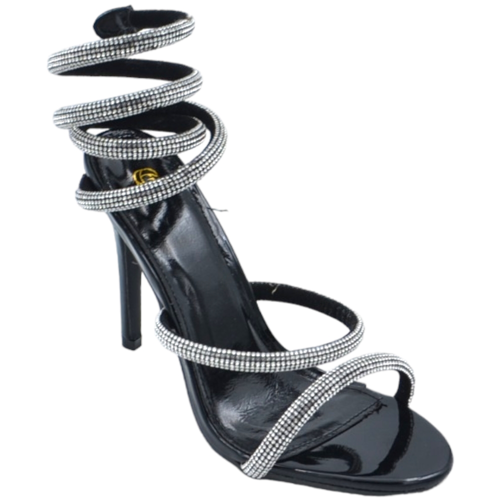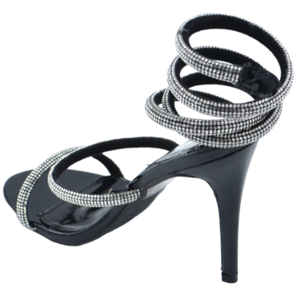 Sandali donna gioiello nero tacco sottile 12 cm serpente rigido si attorciglia alla gamba argento regolabile brillantini