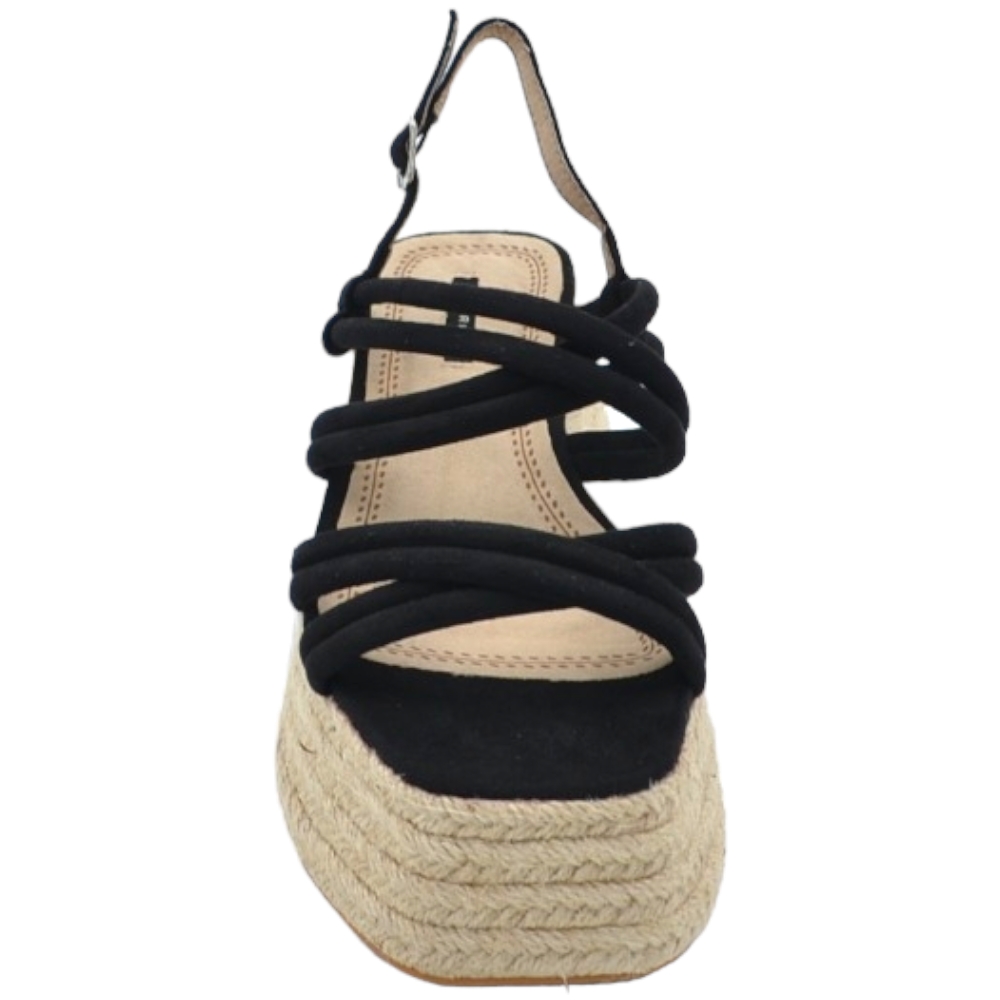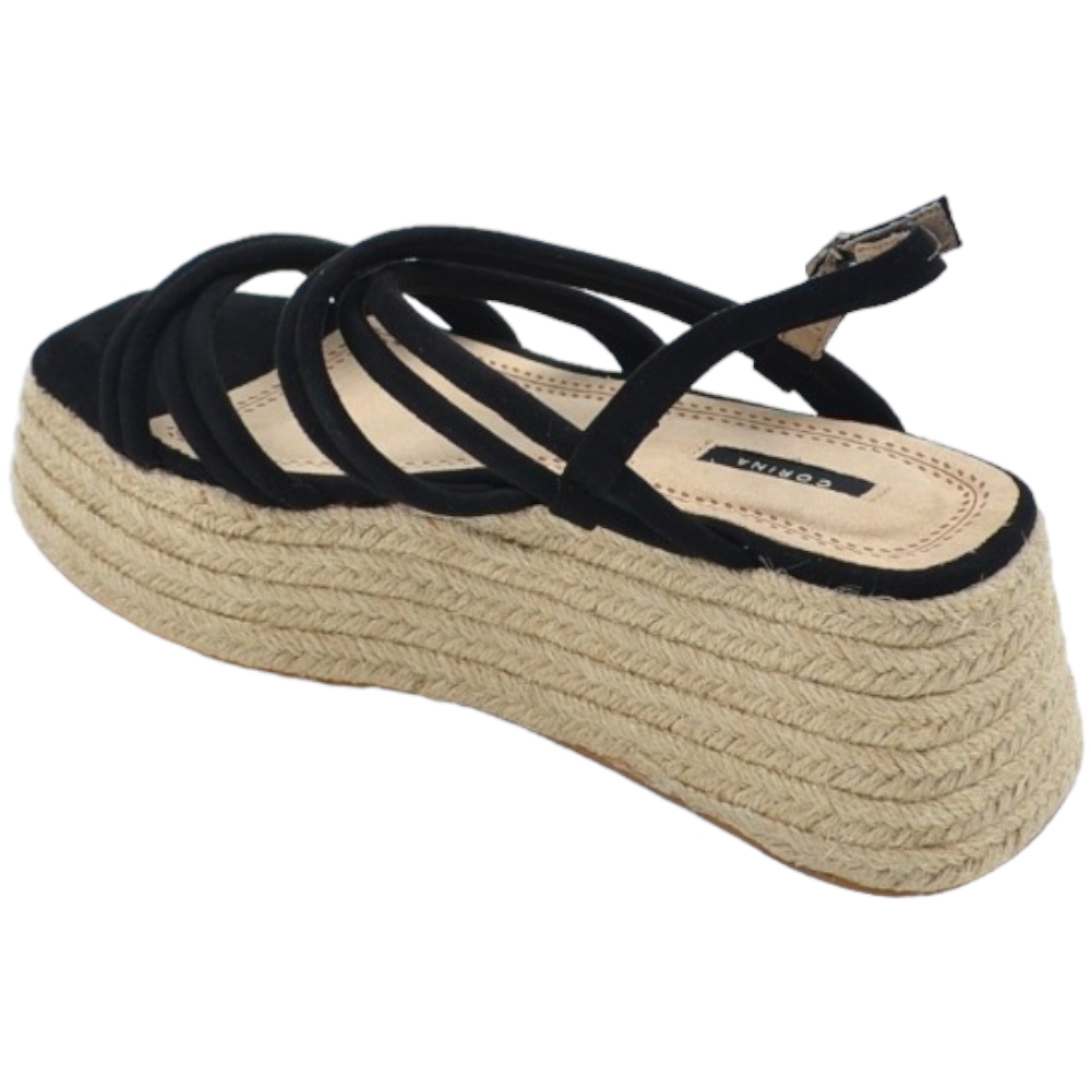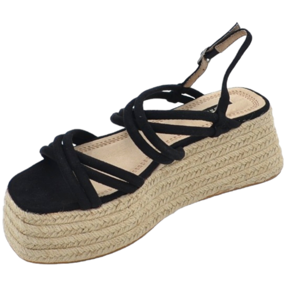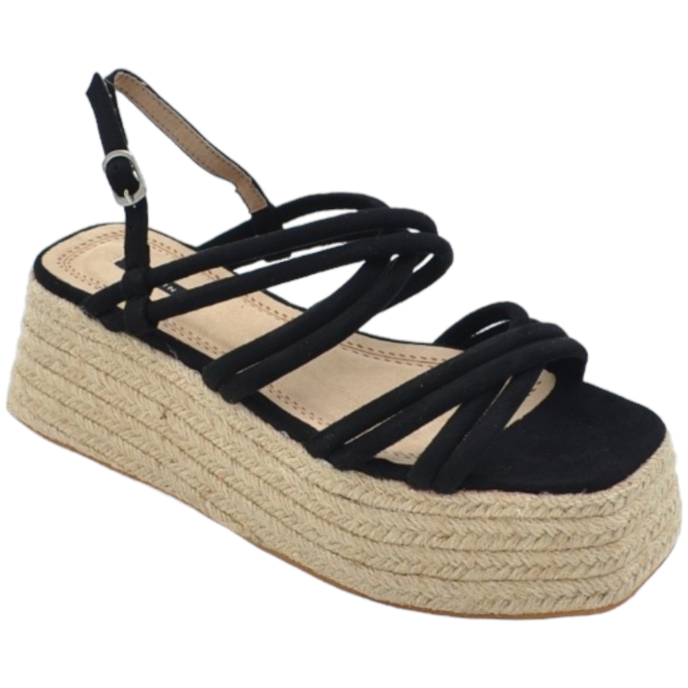 Zeppa donna nera camoscio fasce incrociate avampiede con fondo paglia platform zeppa 6 cm chiusura alla caviglia comoda.
