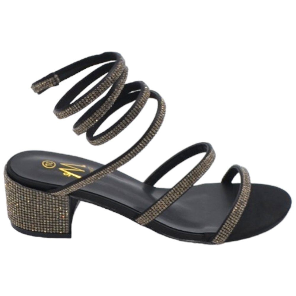 Sandali donna neri con strass tacco largo basso 4 cm serpente rigido che si attorciglia alla gamba regolabile open toe