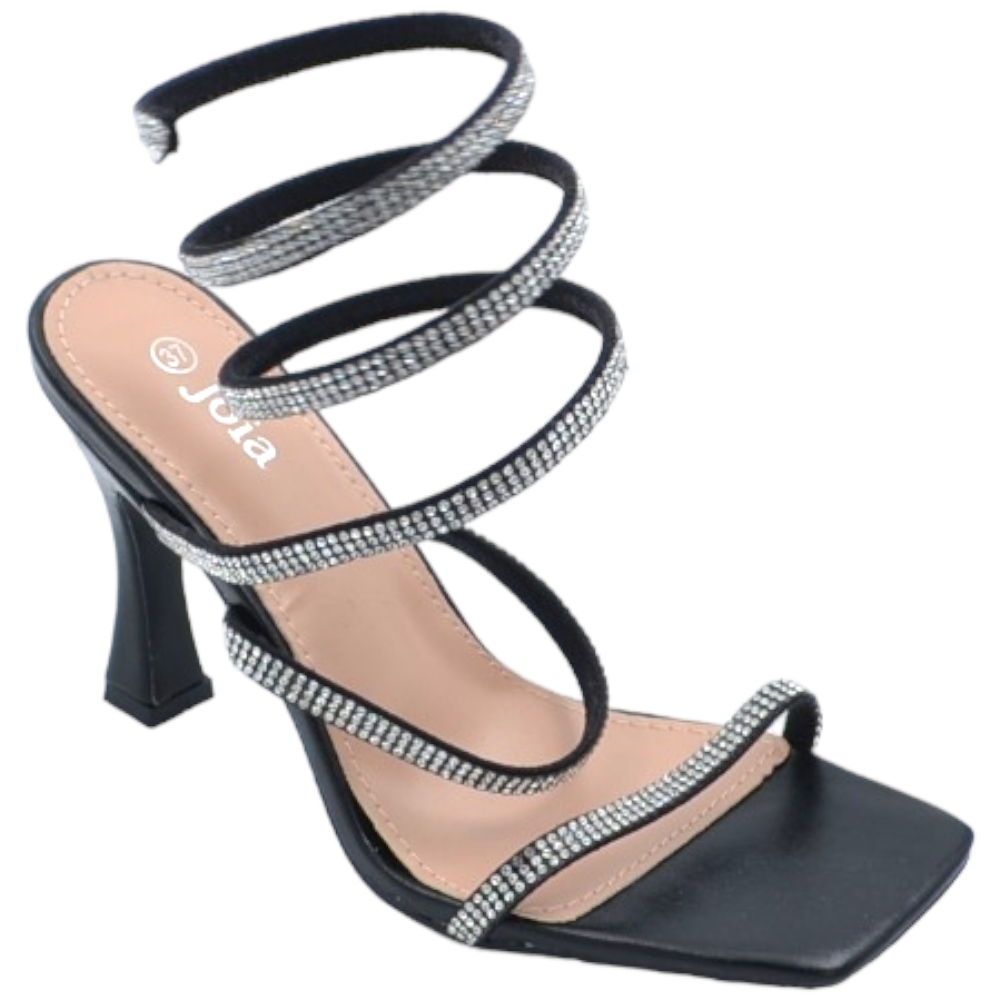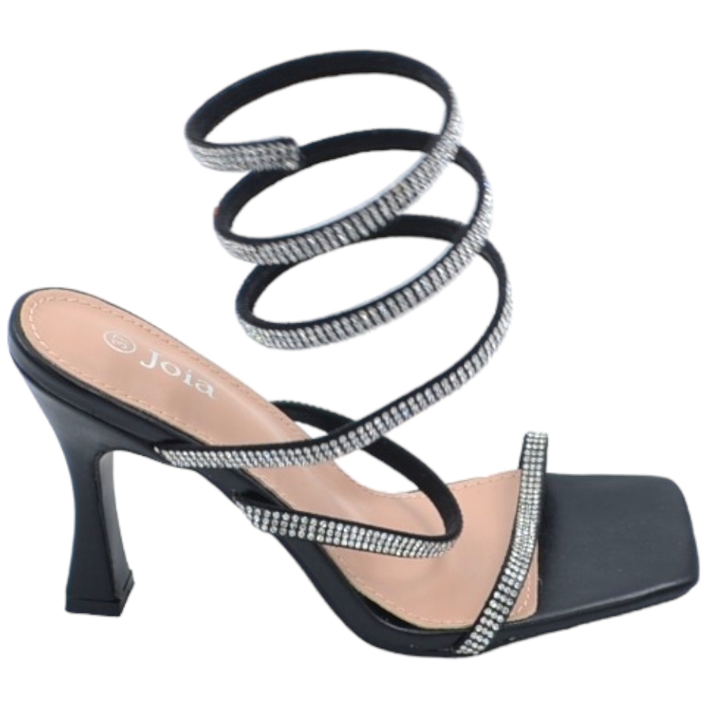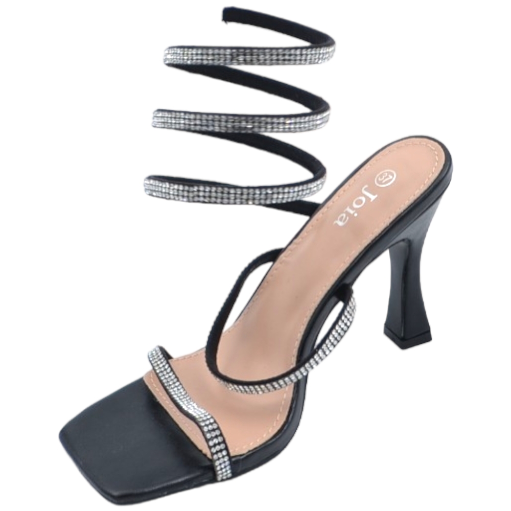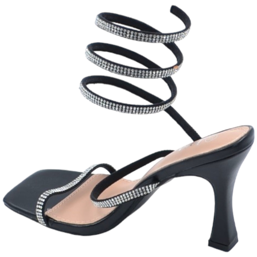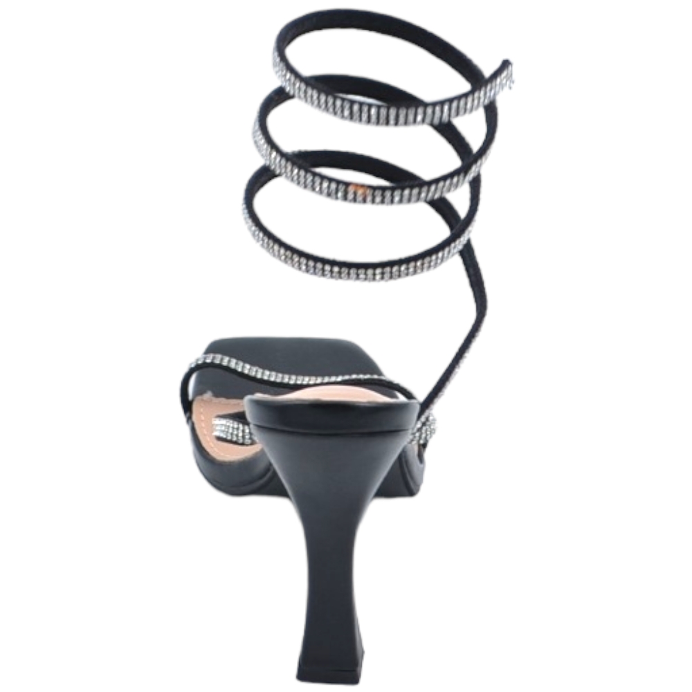 Sandali donna gioiello nero tacco clessidra 10cm serpente rigido si attorciglia alla gamba regolabile brillantini