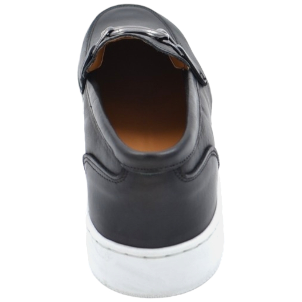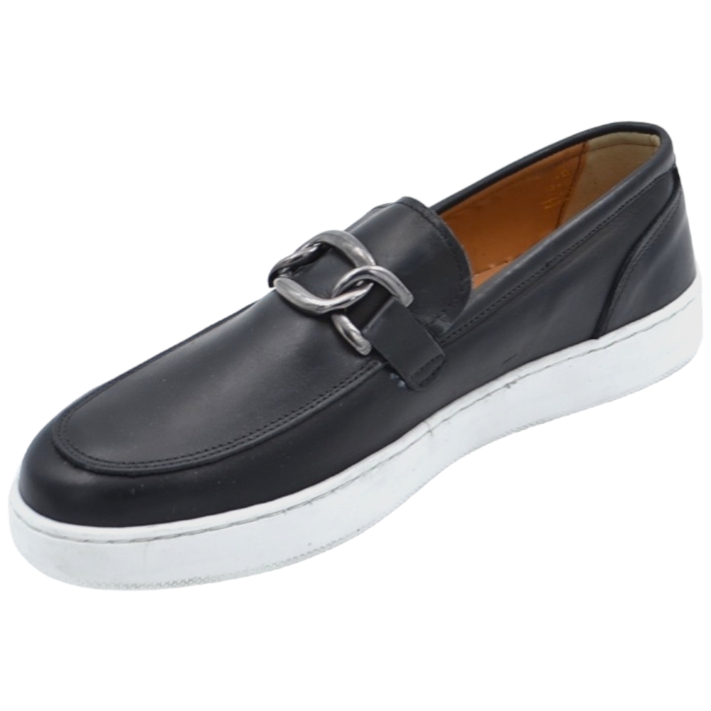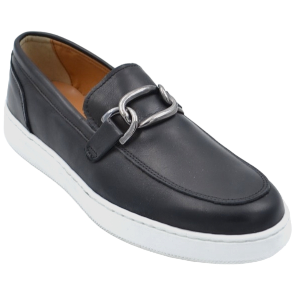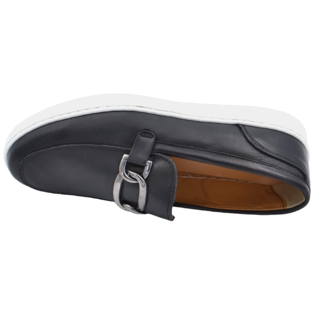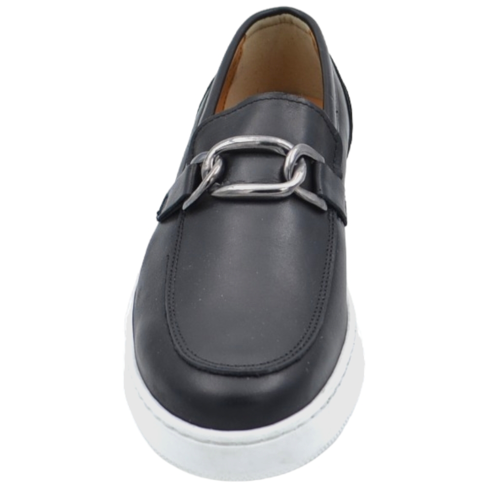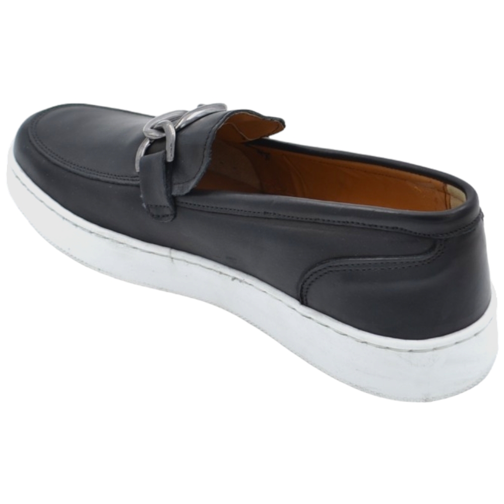 Mocassini uomo classico sportivo vera pelle nappa nero cuciture in punta con catena argento fondo bianco alto 3cm