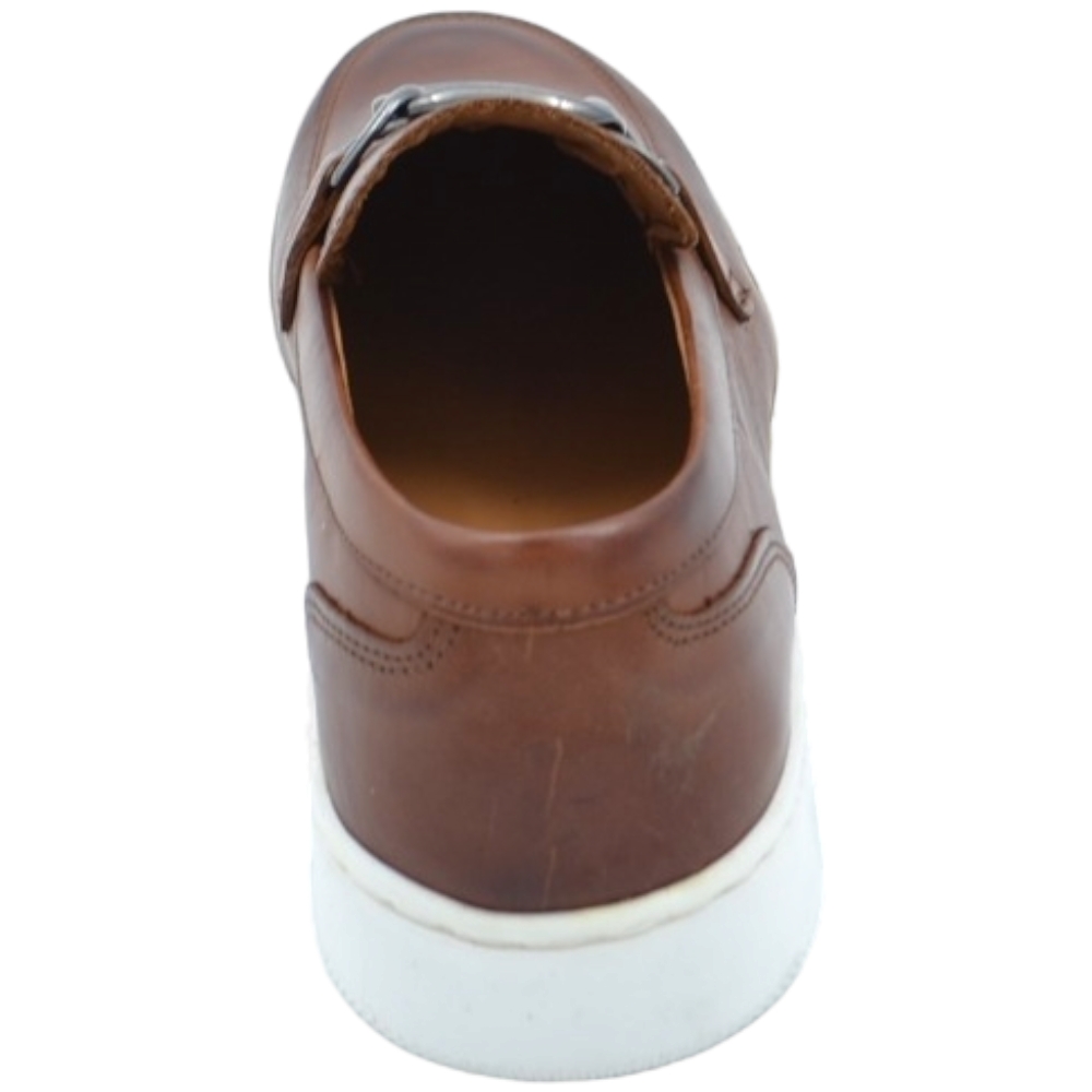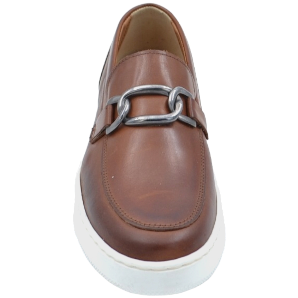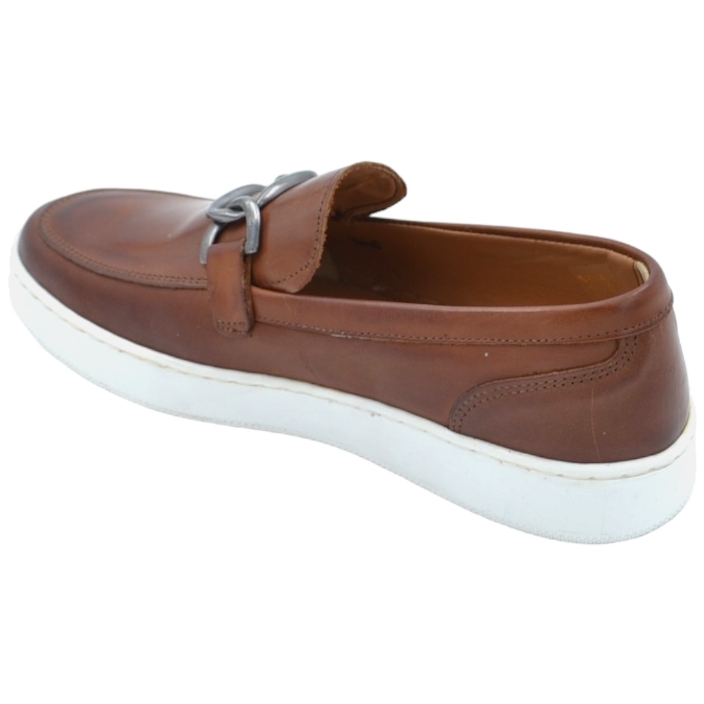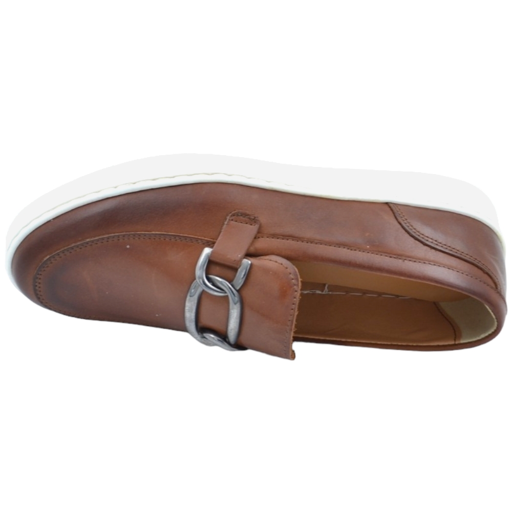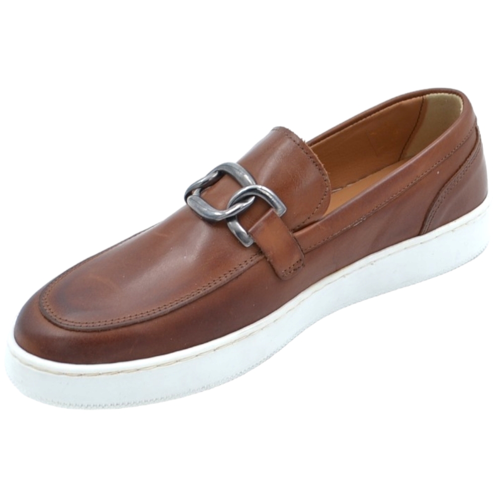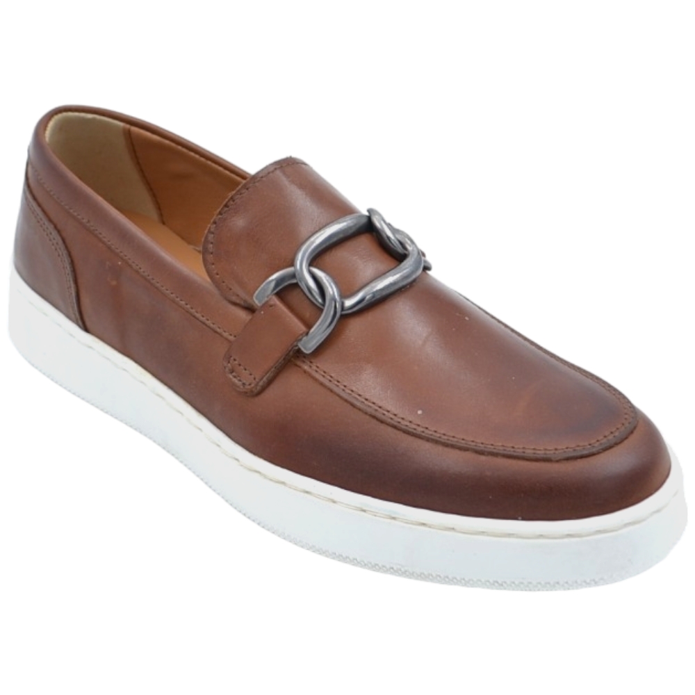 Mocassini uomo classico sportivo vera pelle nappa cuoio cuciture in punta con catena argento fondo bianco alto 3cm