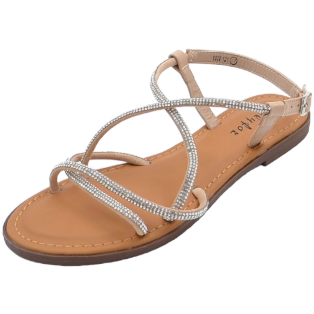 Il sandalo gioiello è una scarpa da donna di qualità, femminile e trendy. Il piede è elegantemente vestito da fascette decorate con brillantini e cinturino regolabile al tallone. Un sandalo piatto di tendenza pratico e comodo senza tacco ideale per le donne glamour che amano vestire accessori confortevoli capaci di esaltare la loro femminilità senza rinunciare a seguire i dettami della moda.
