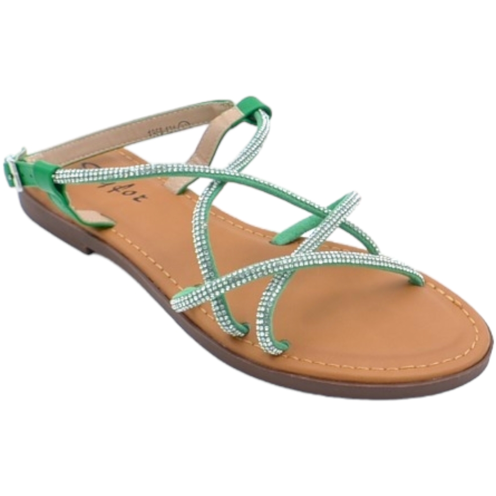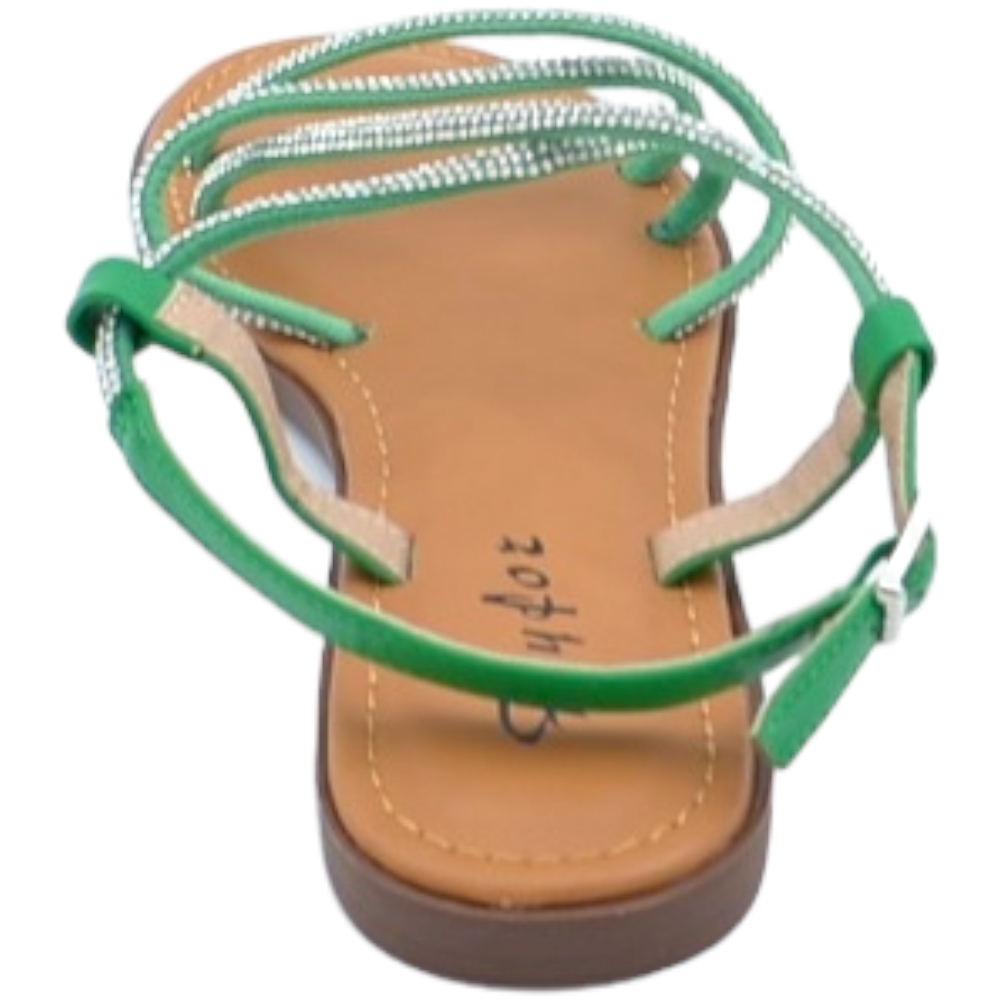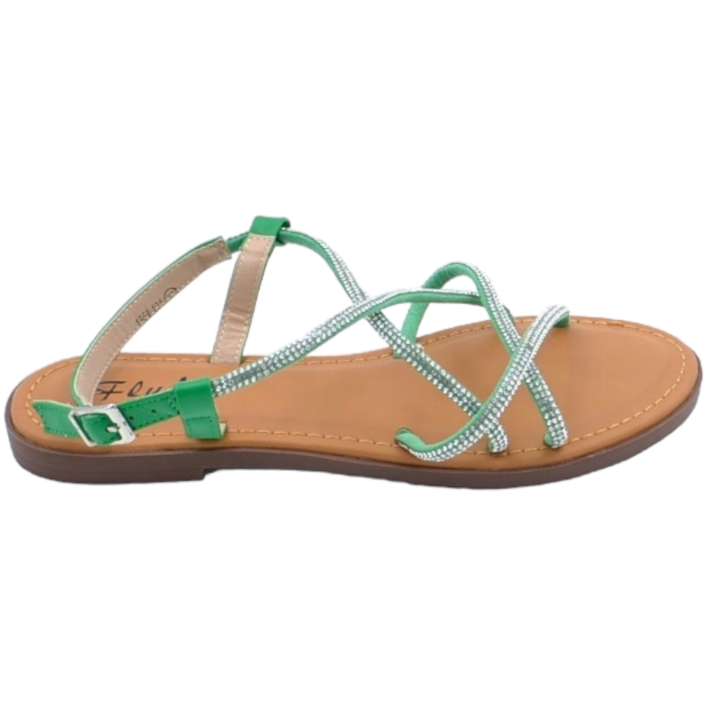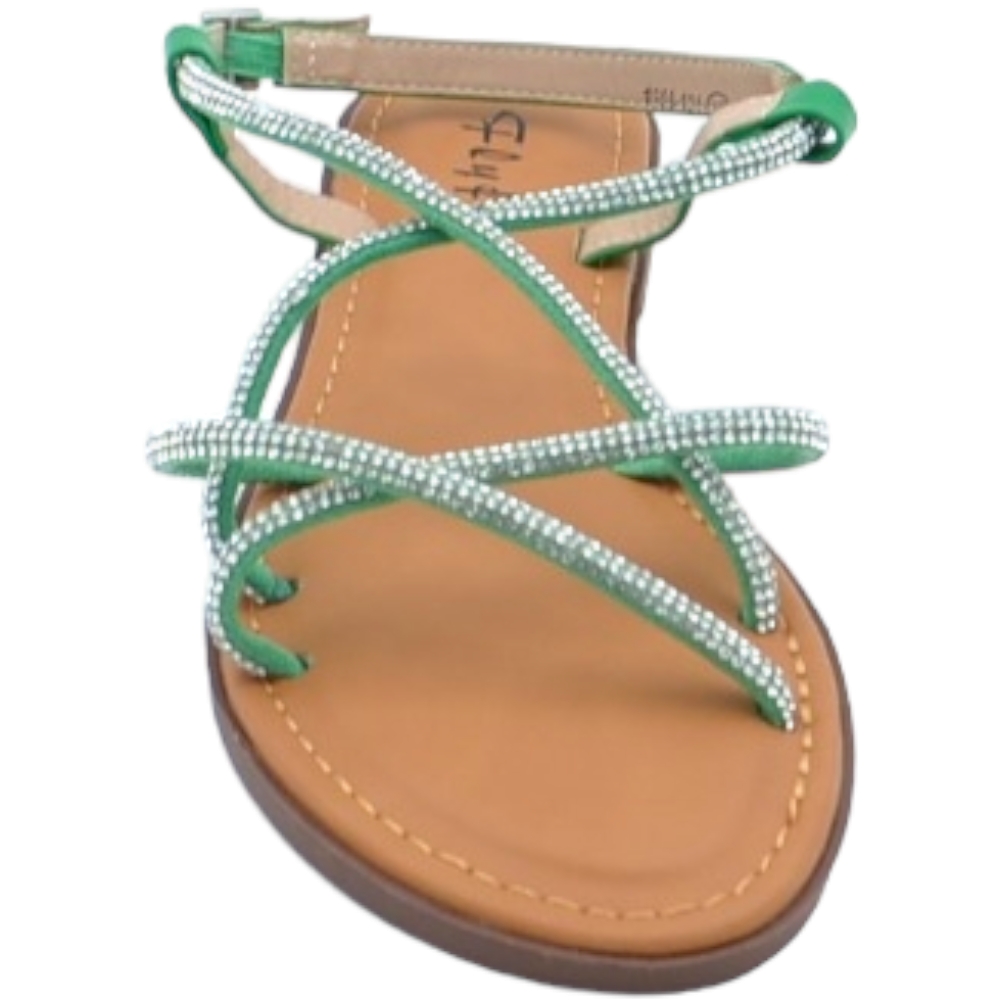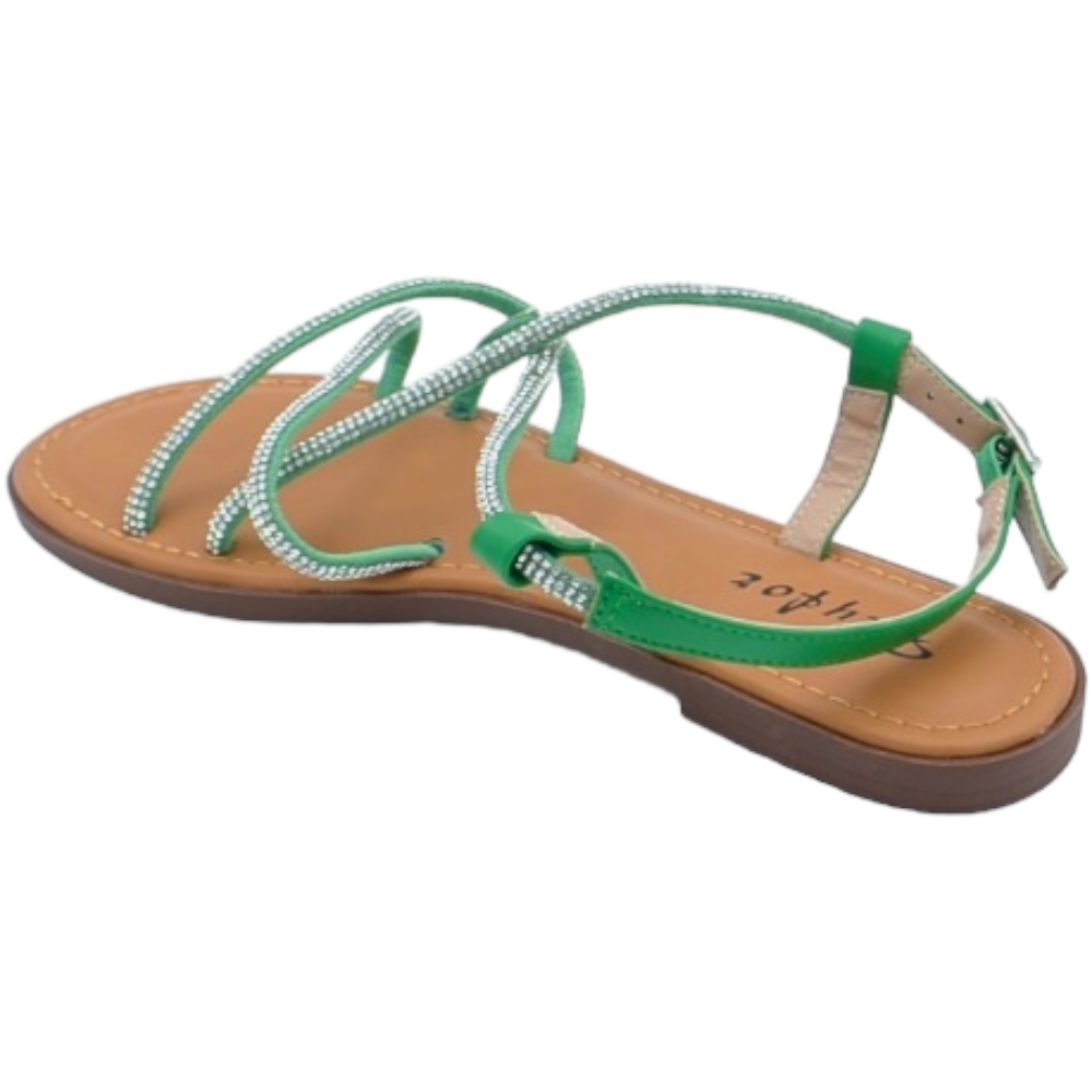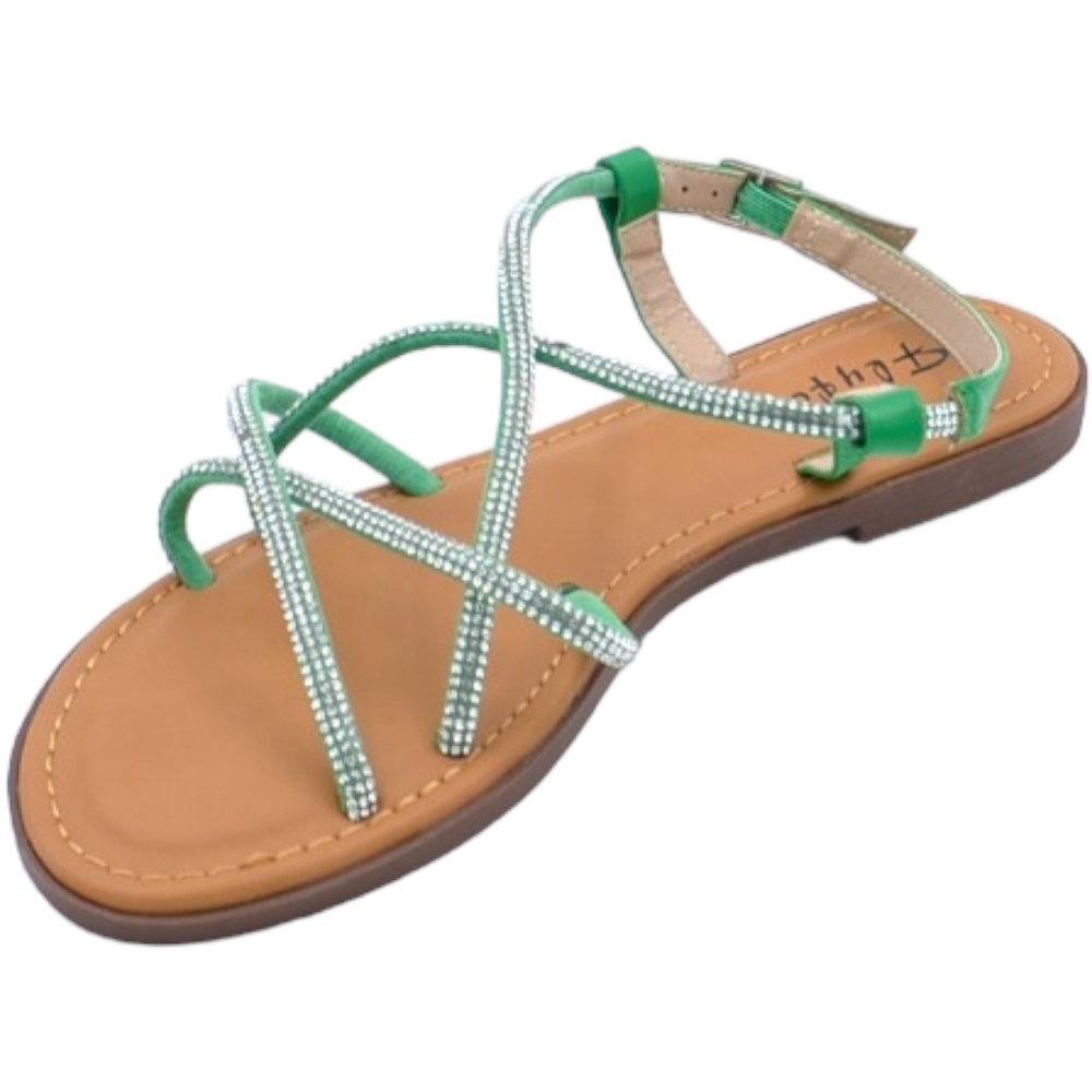 Sandalo gioiello basso donna verde raso terra fascette incrociate brillantini chiusura caviglia regolabile antiscivolo