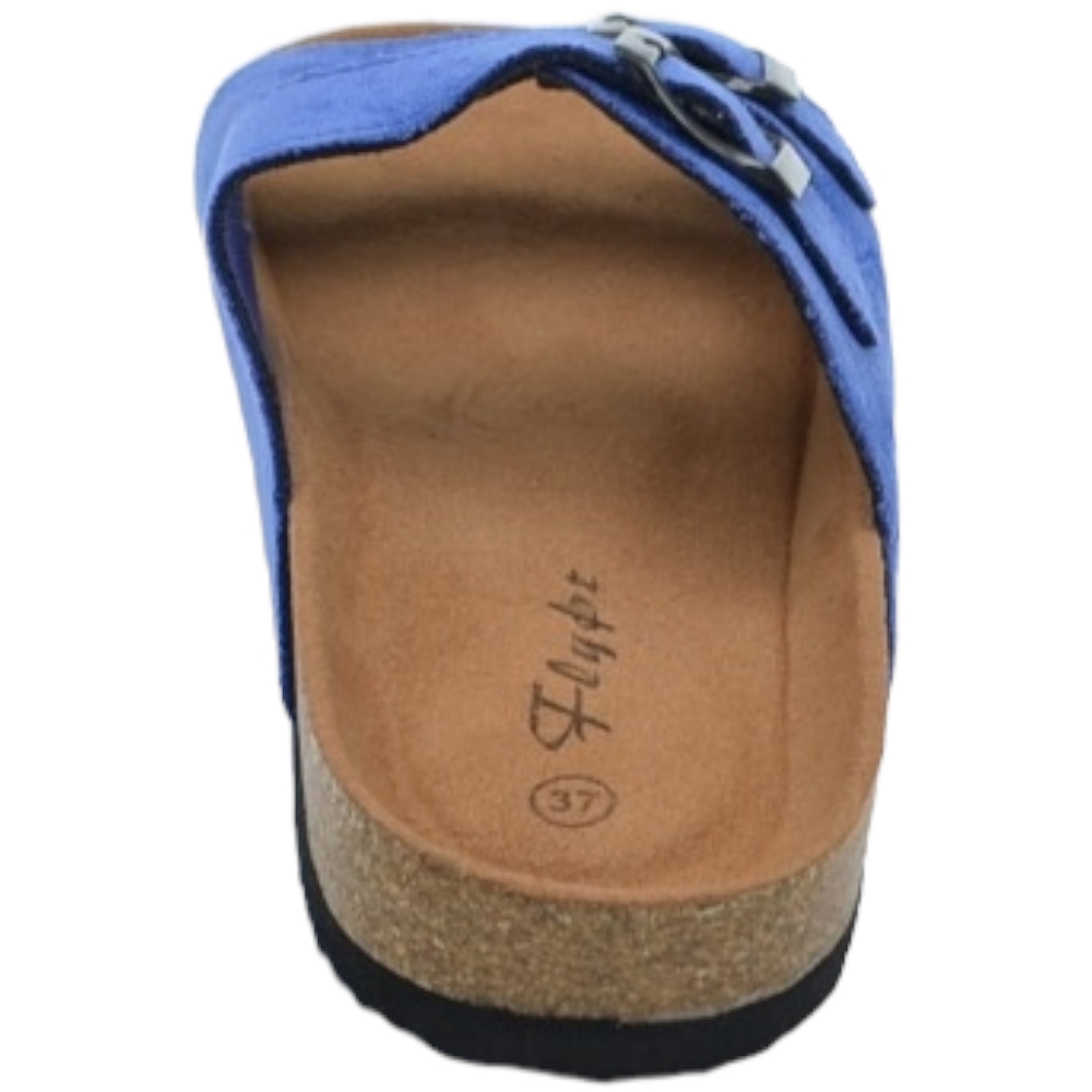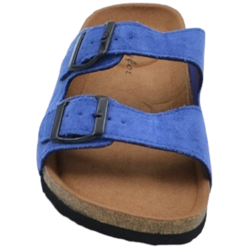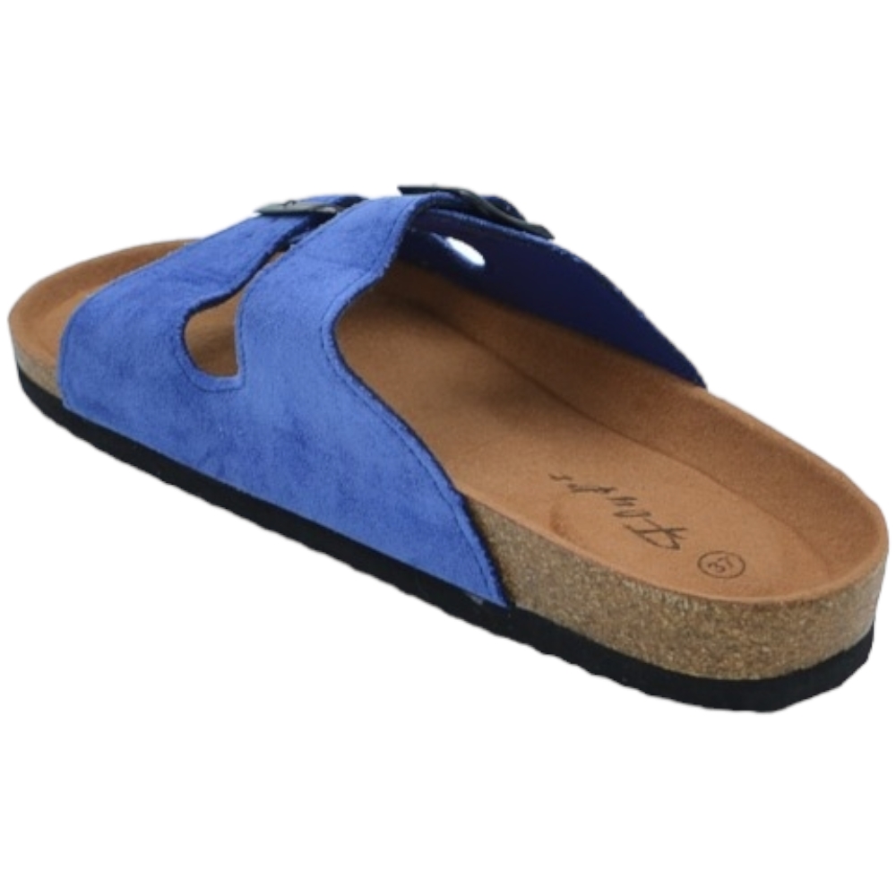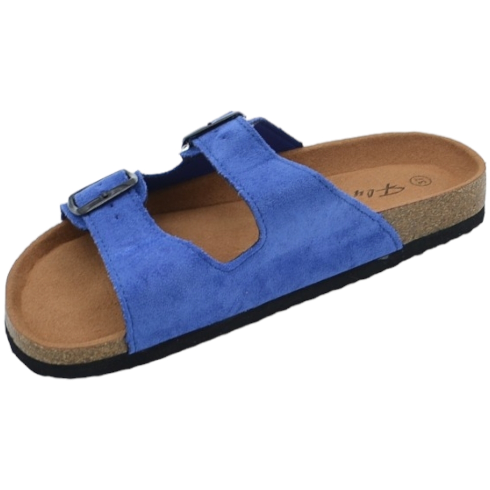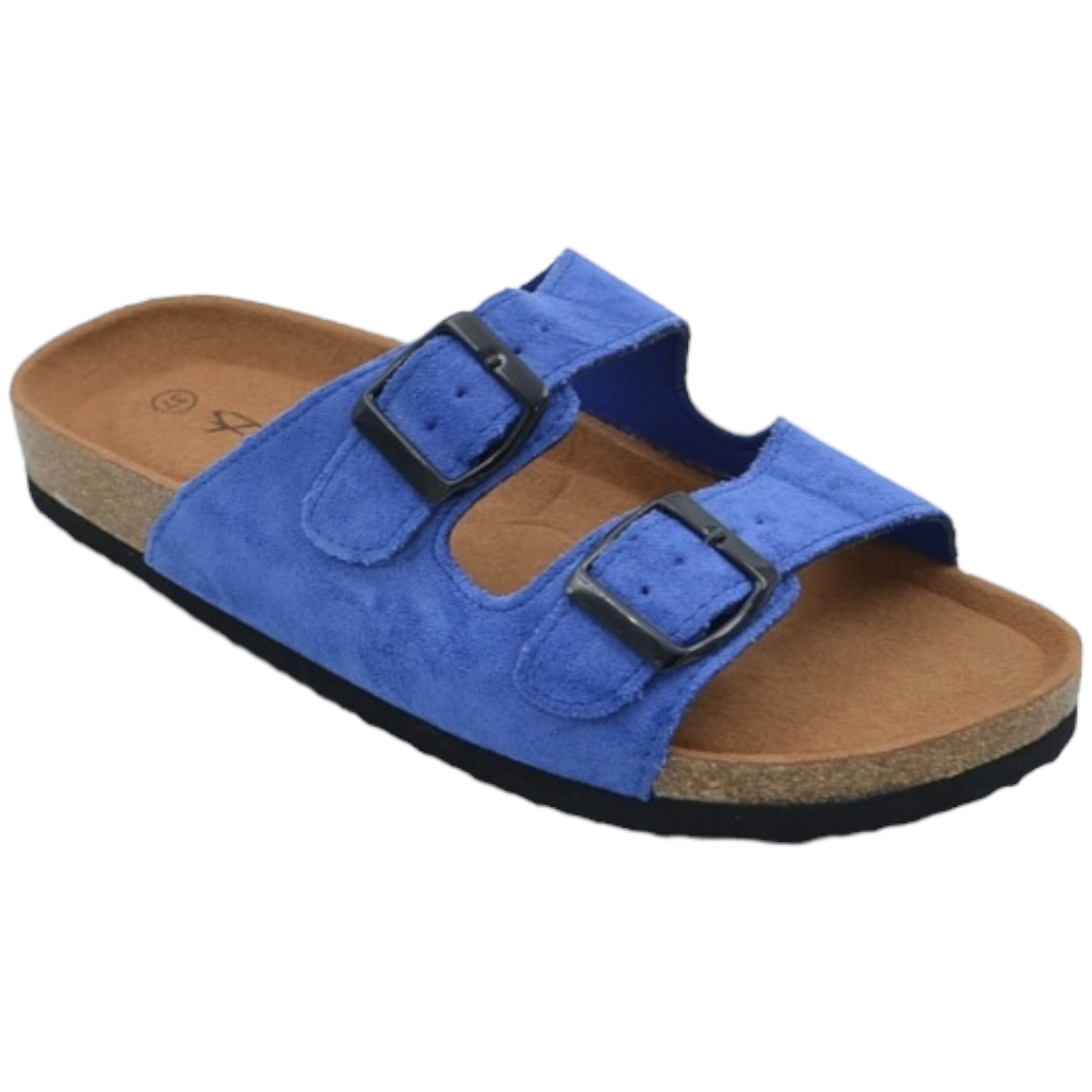 Sandali donna estivi in camoscio blu con doppia fibbia nera regolabile fondo Eva con antiscivolo