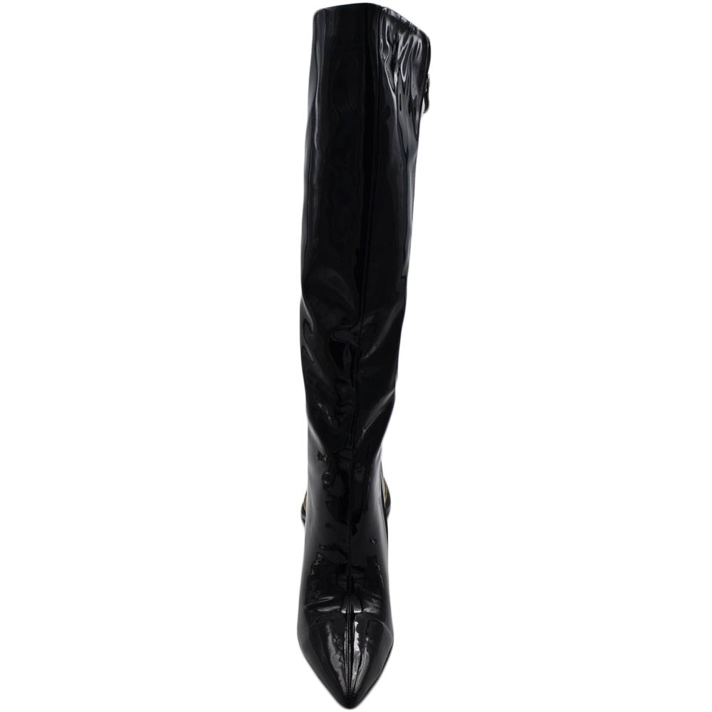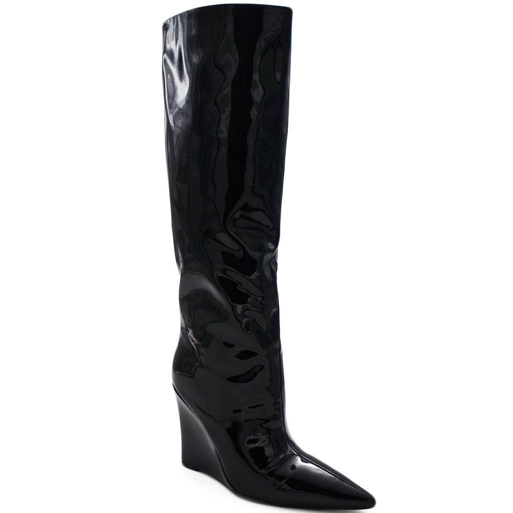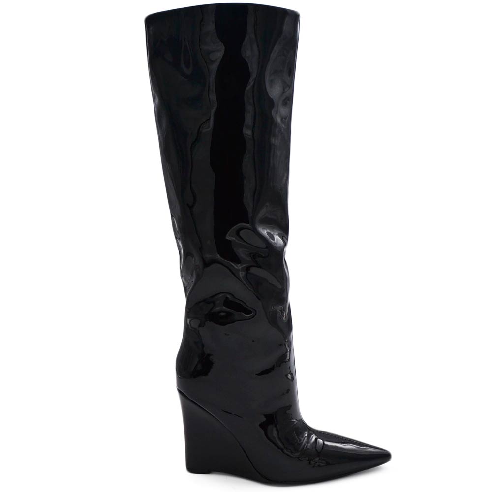 Stivale donna al ginocchio in pelle lucida vinile nero a punta con zeppa alta liscio tacco unito moda aderente