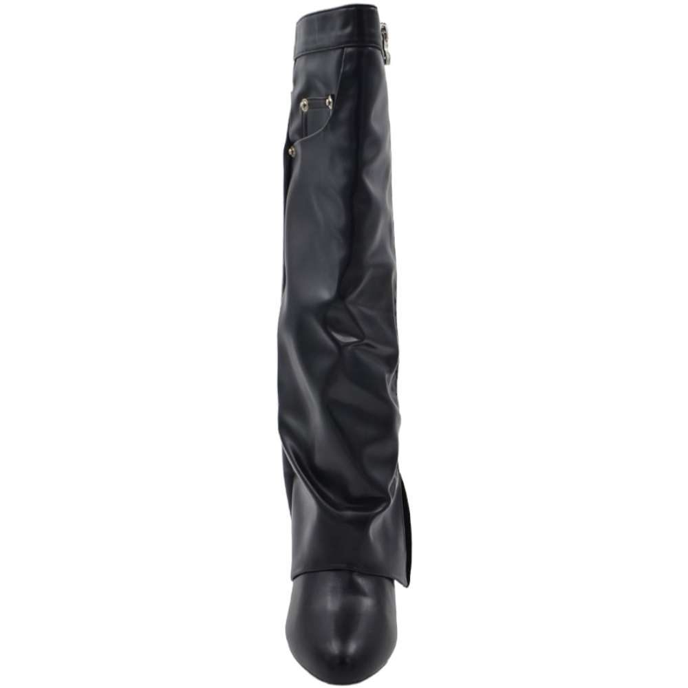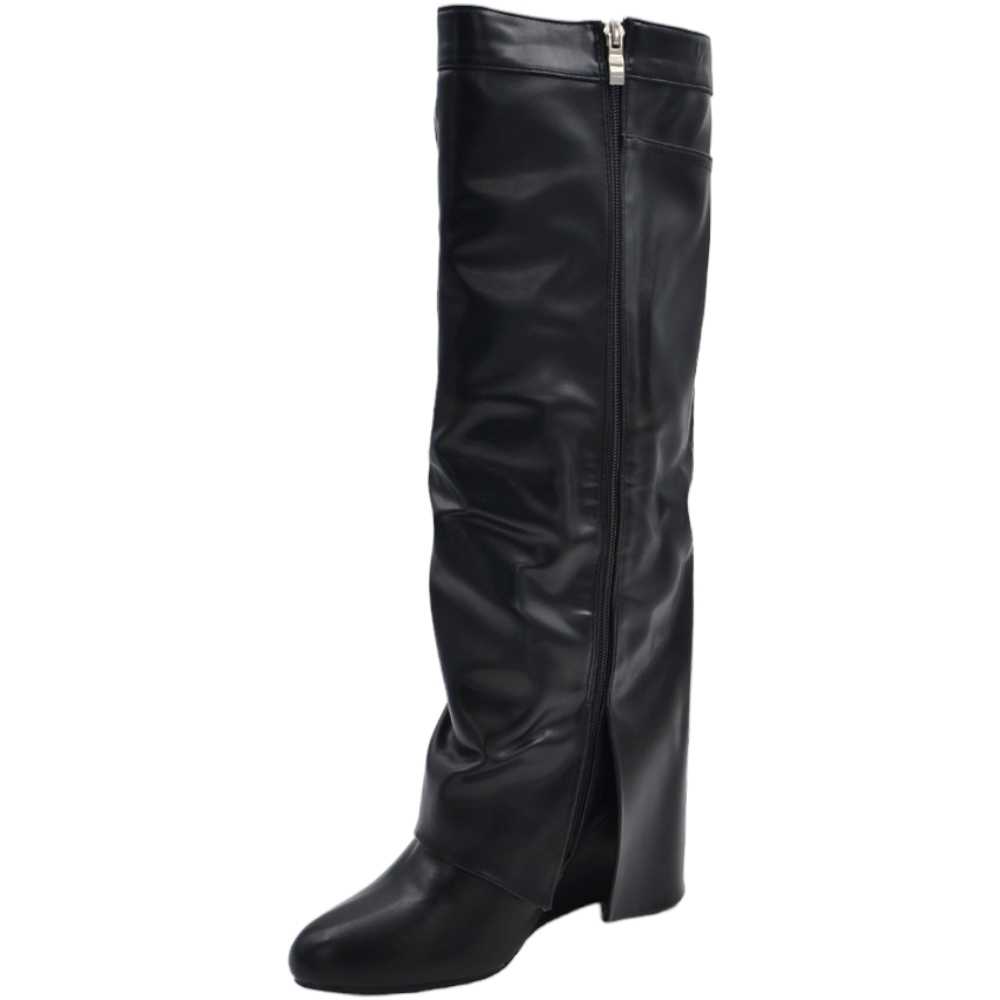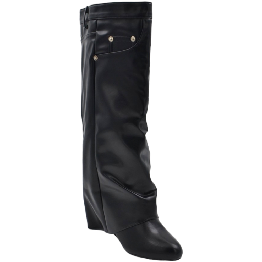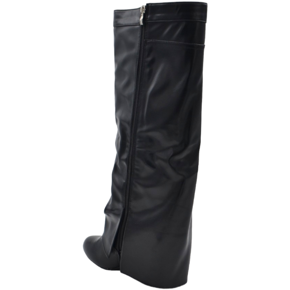 Stivale donna altezza ginocchio nero risvoltone fino a terra shark con zeppa 10 cm comoda dettagli pantalone moda