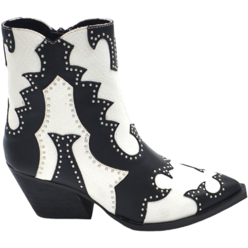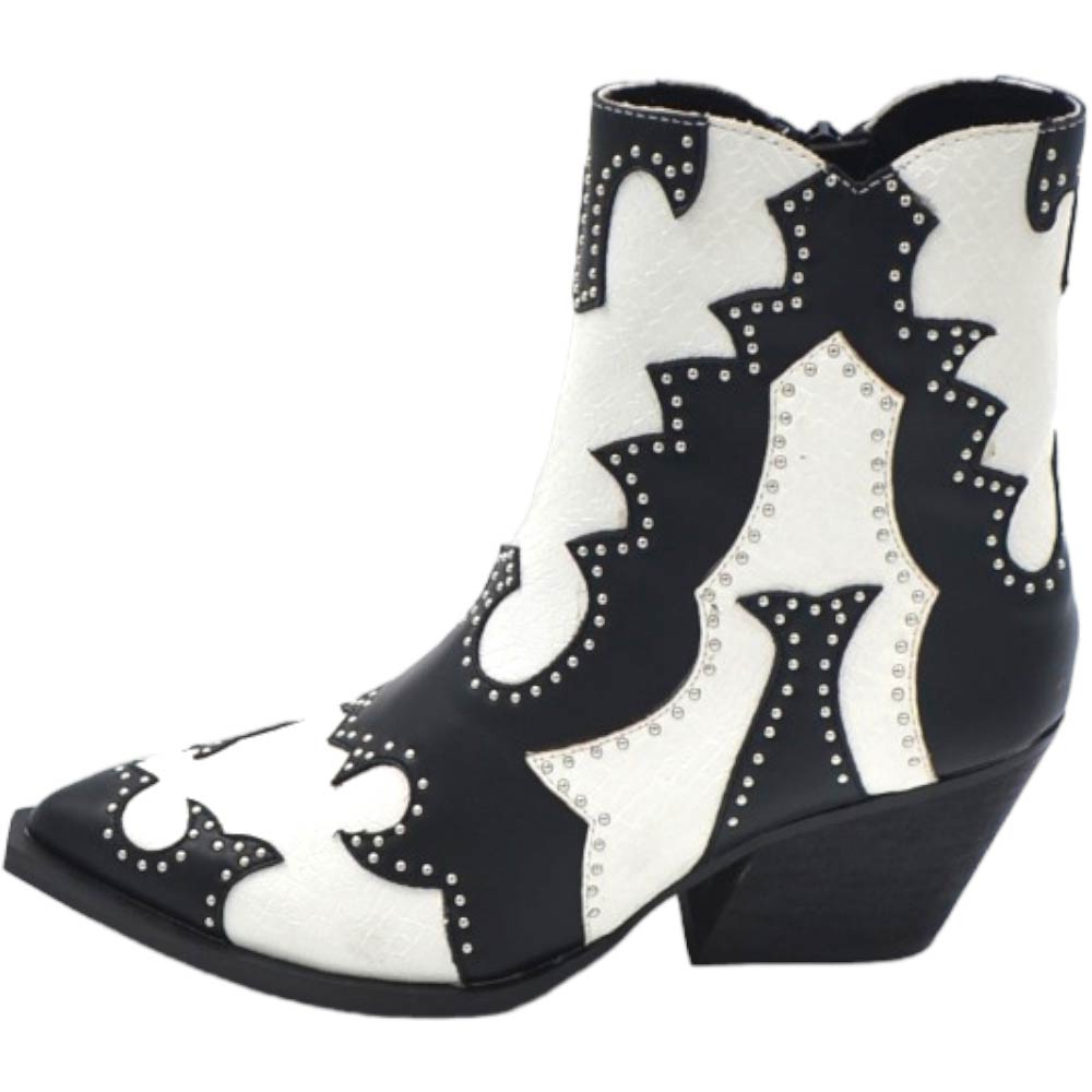 Tronchetto donna camperos con tacco in legno cono 4cm a punta in pelle bianco e nero attillato sopra caviglia