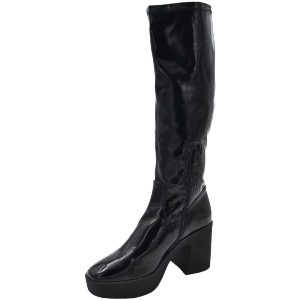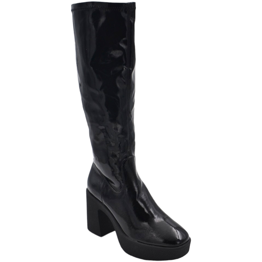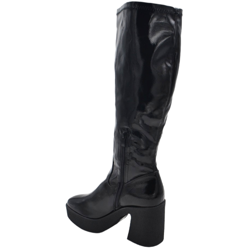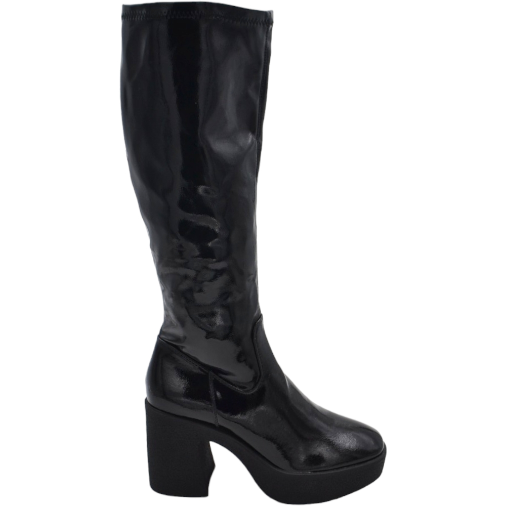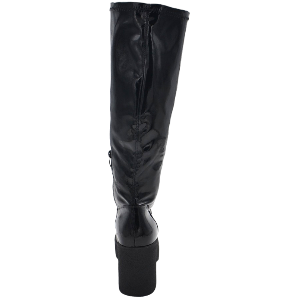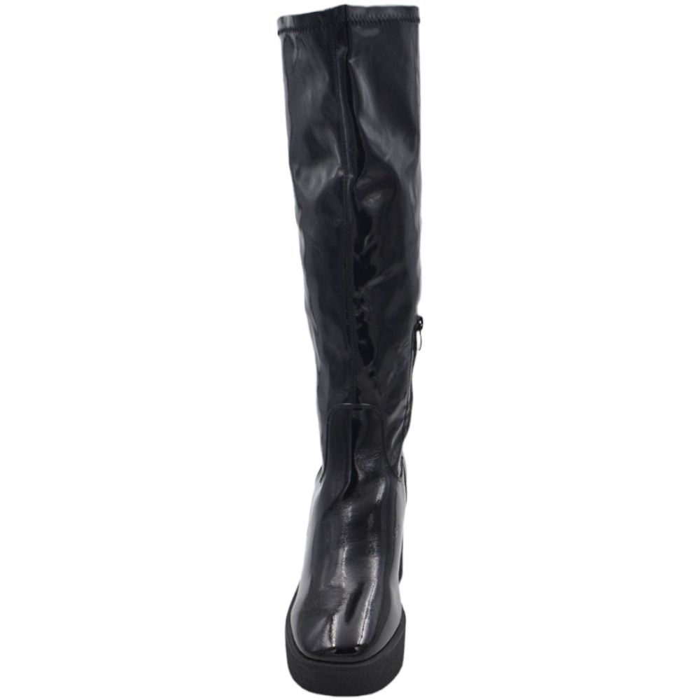 Stivali donna pelle lucida nero al ginocchio con fondo gomma comodo zeppa tacco grosso 7 cm elastico combat