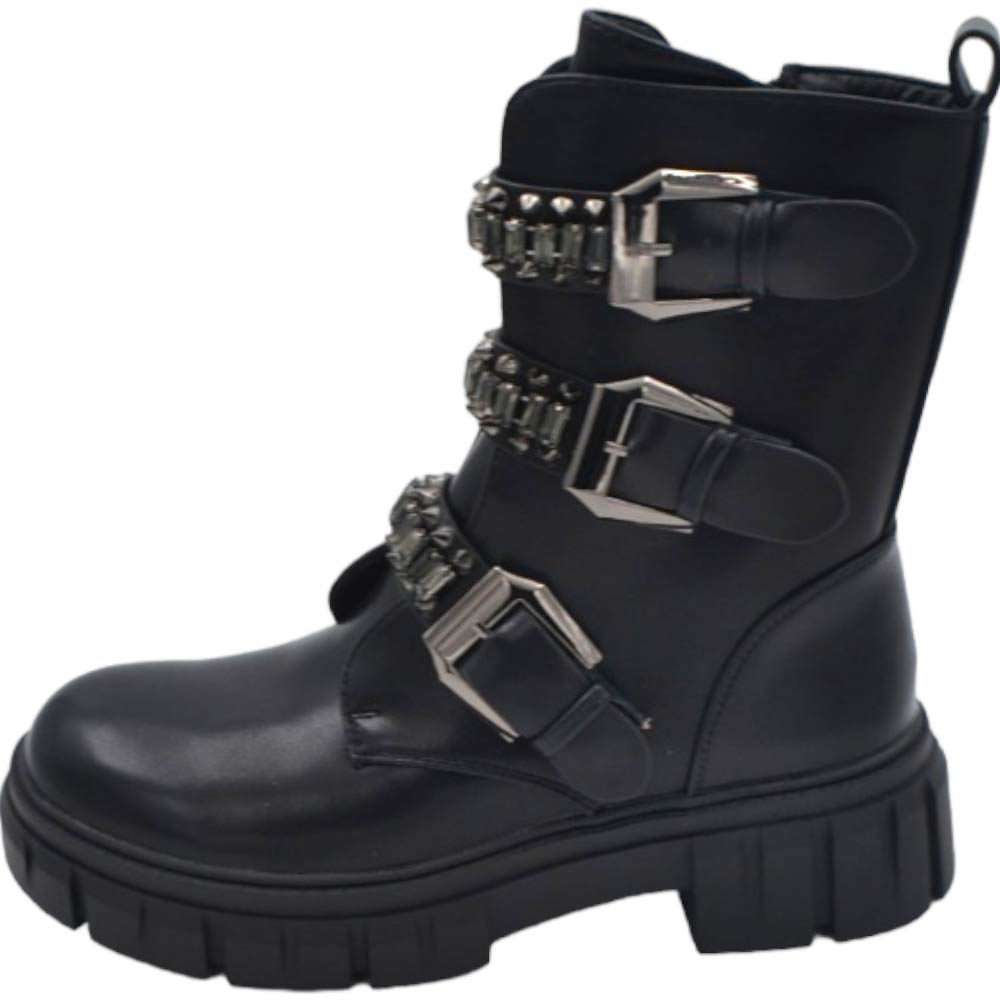 Stivaletto anfibio scarpa donna nero con cinturini fibbie e strass tono su tono fondo alto in gomma zigrinata zip moda
