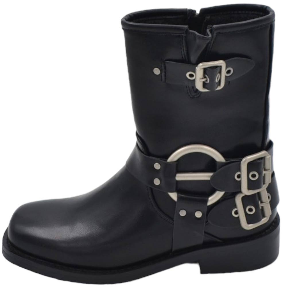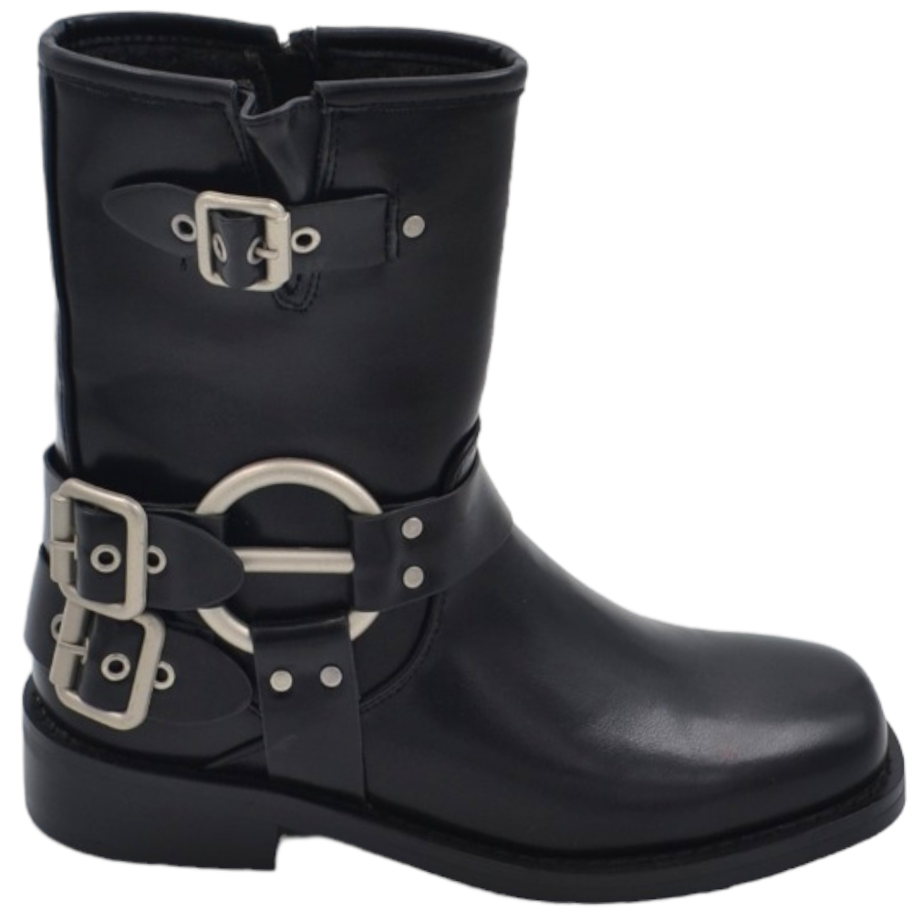 Stivaletto donna nero biker punta quadrata tacchetto 2 cm al polpaccio con fibbie e accessori argento zip moda
