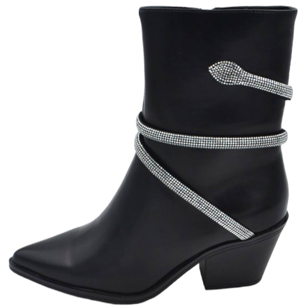 Stivaletti tronchetti donna a punta nero con tacco western 4 cm cordoncino di strass avvolgente alla caviglia moda