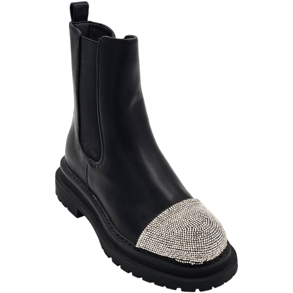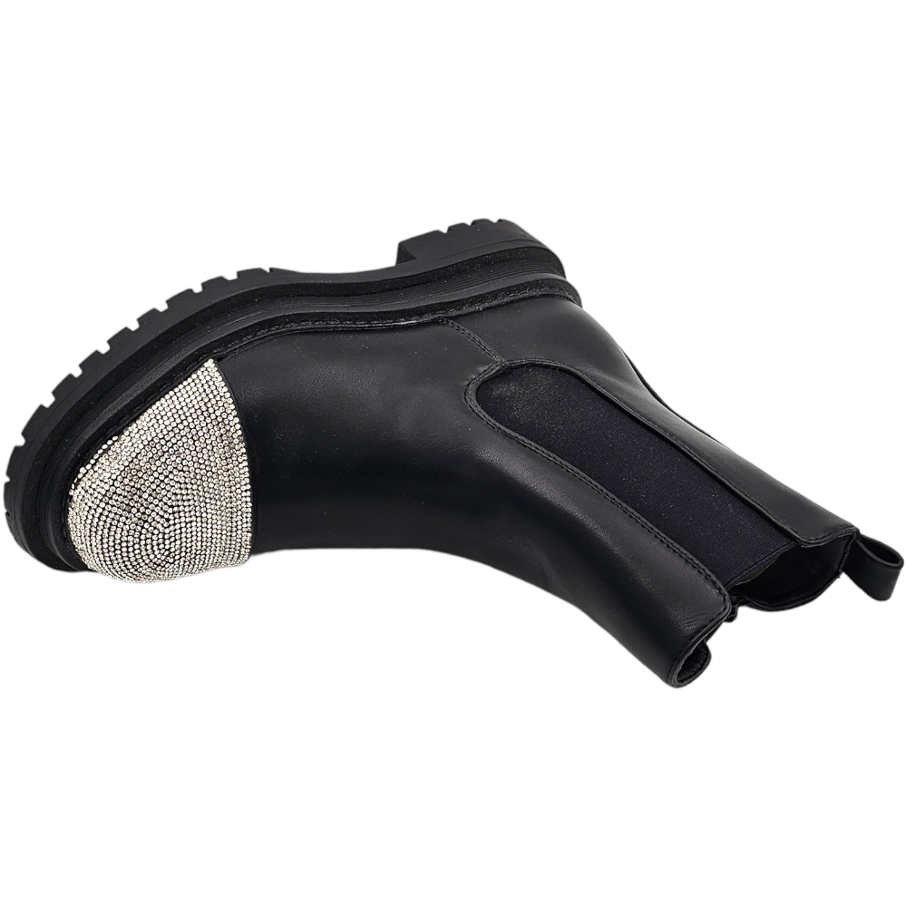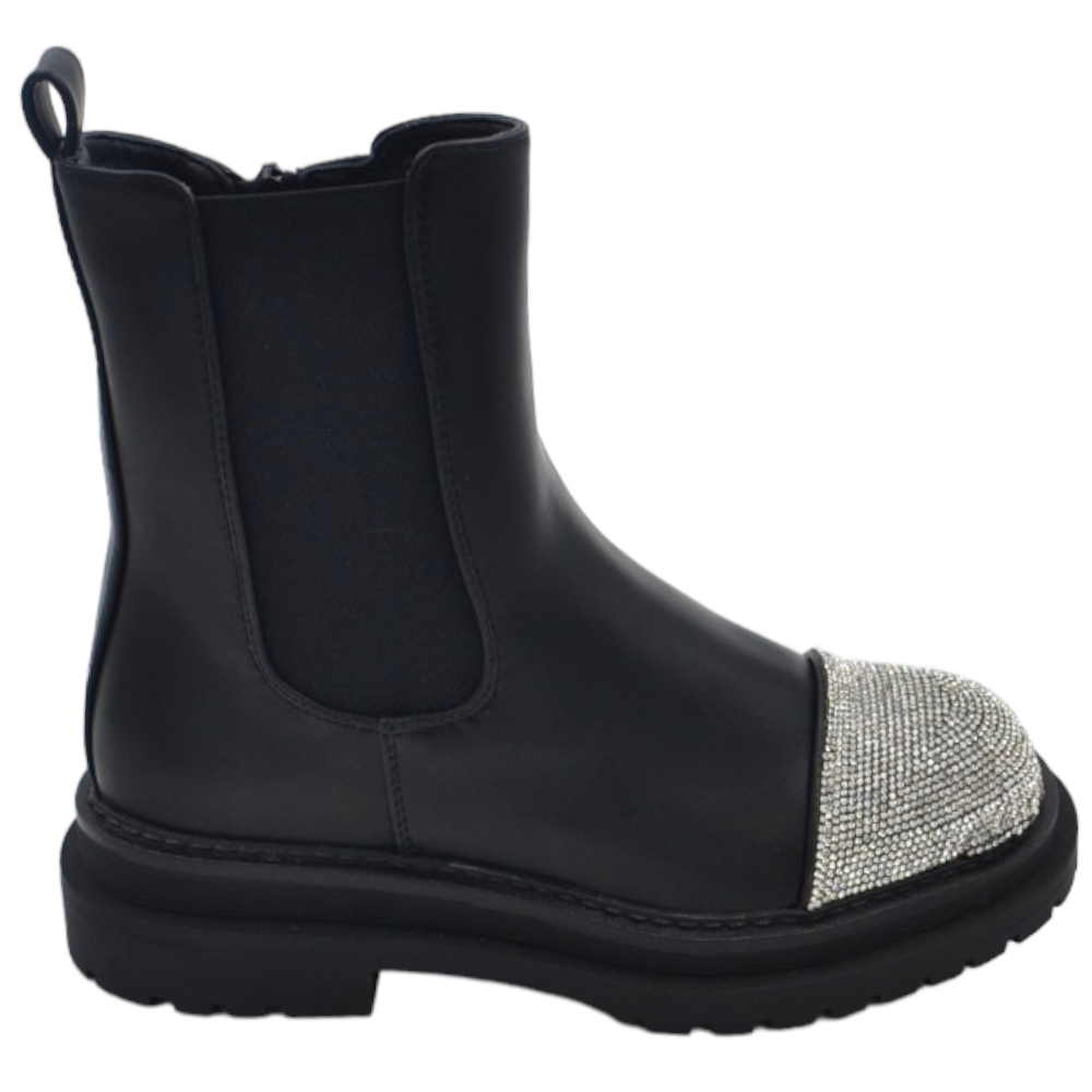 Stivaletto donna beatles nero con strass argento in punta e cinturino fondo alto in gomma zigrinata con zip moda