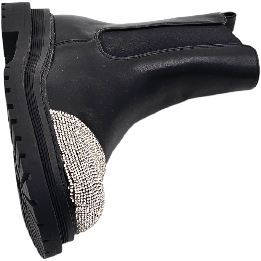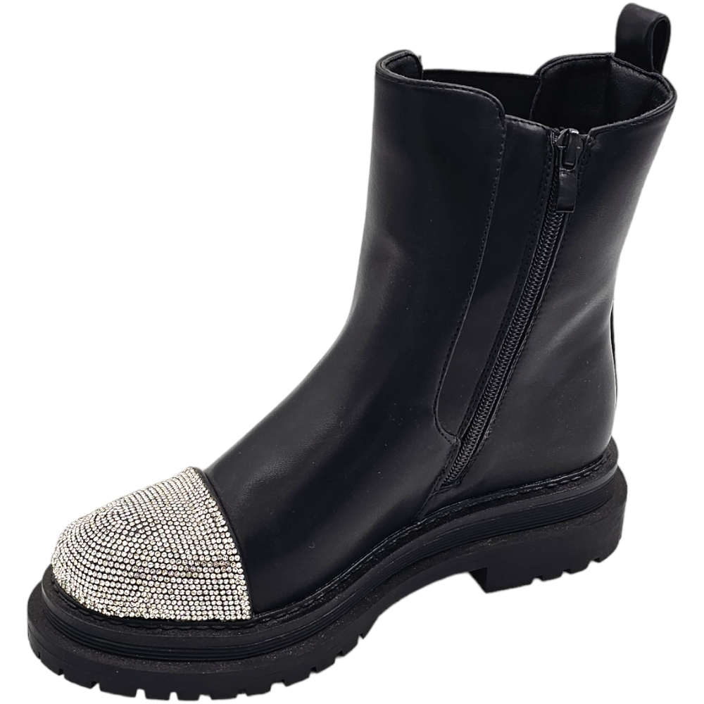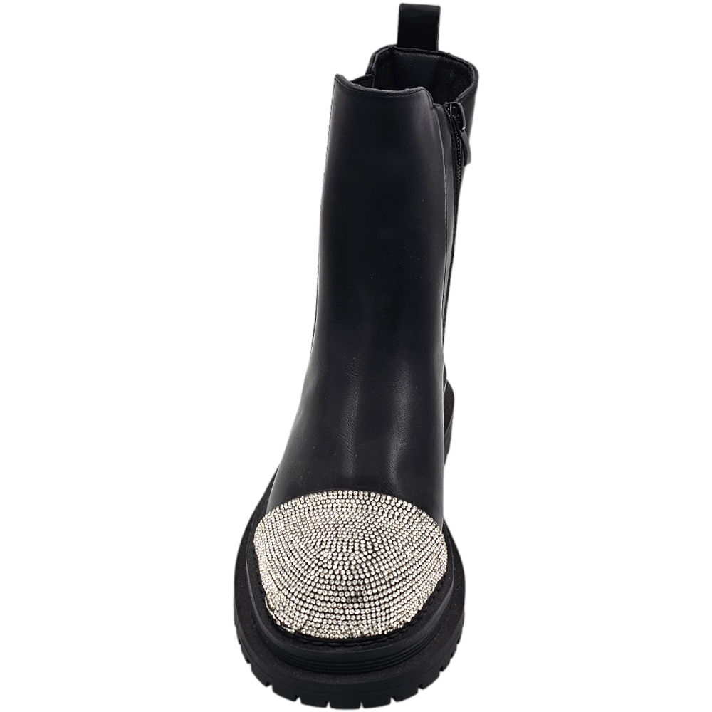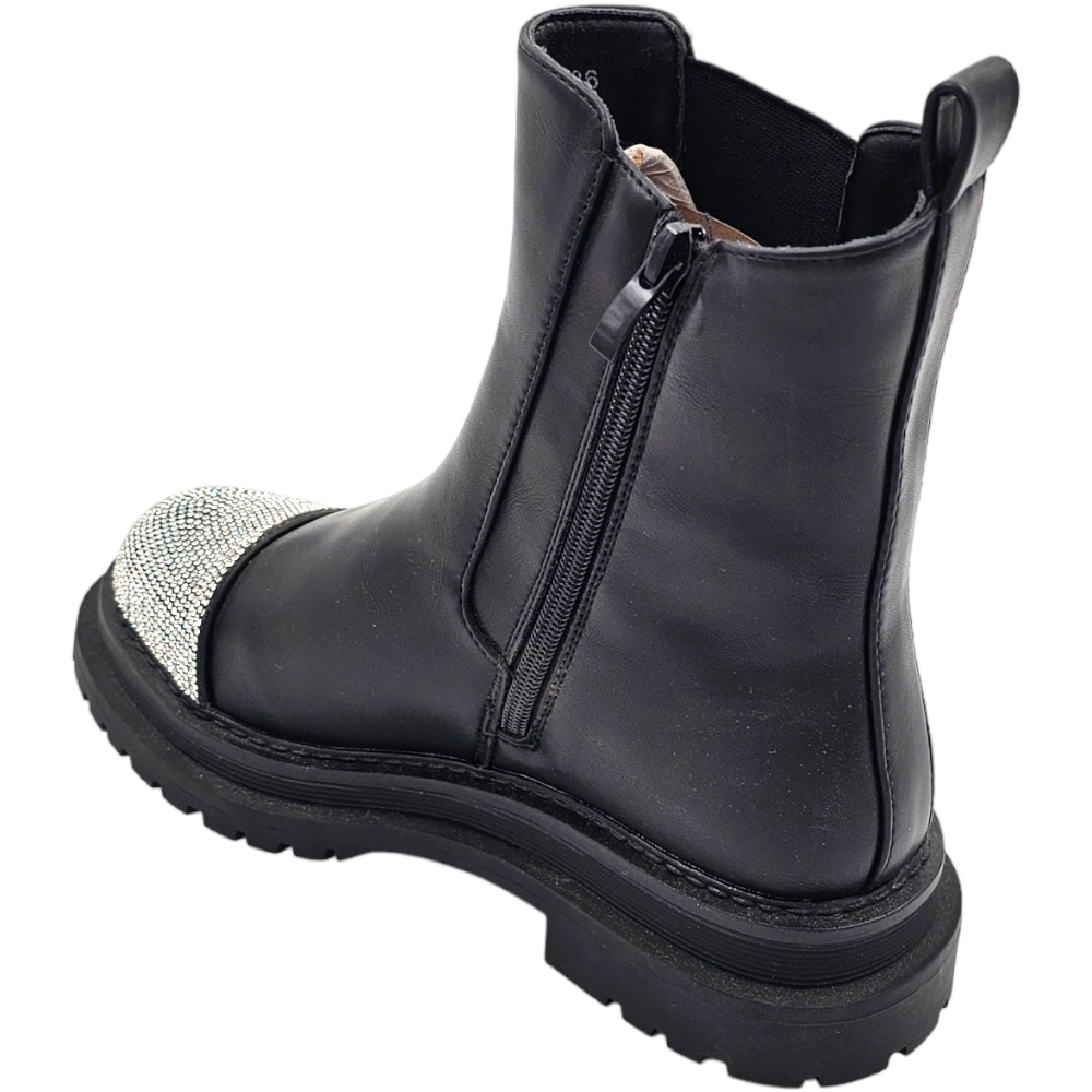 Stivaletto donna beatles nero con strass argento in punta e cinturino fondo alto in gomma zigrinata con zip moda