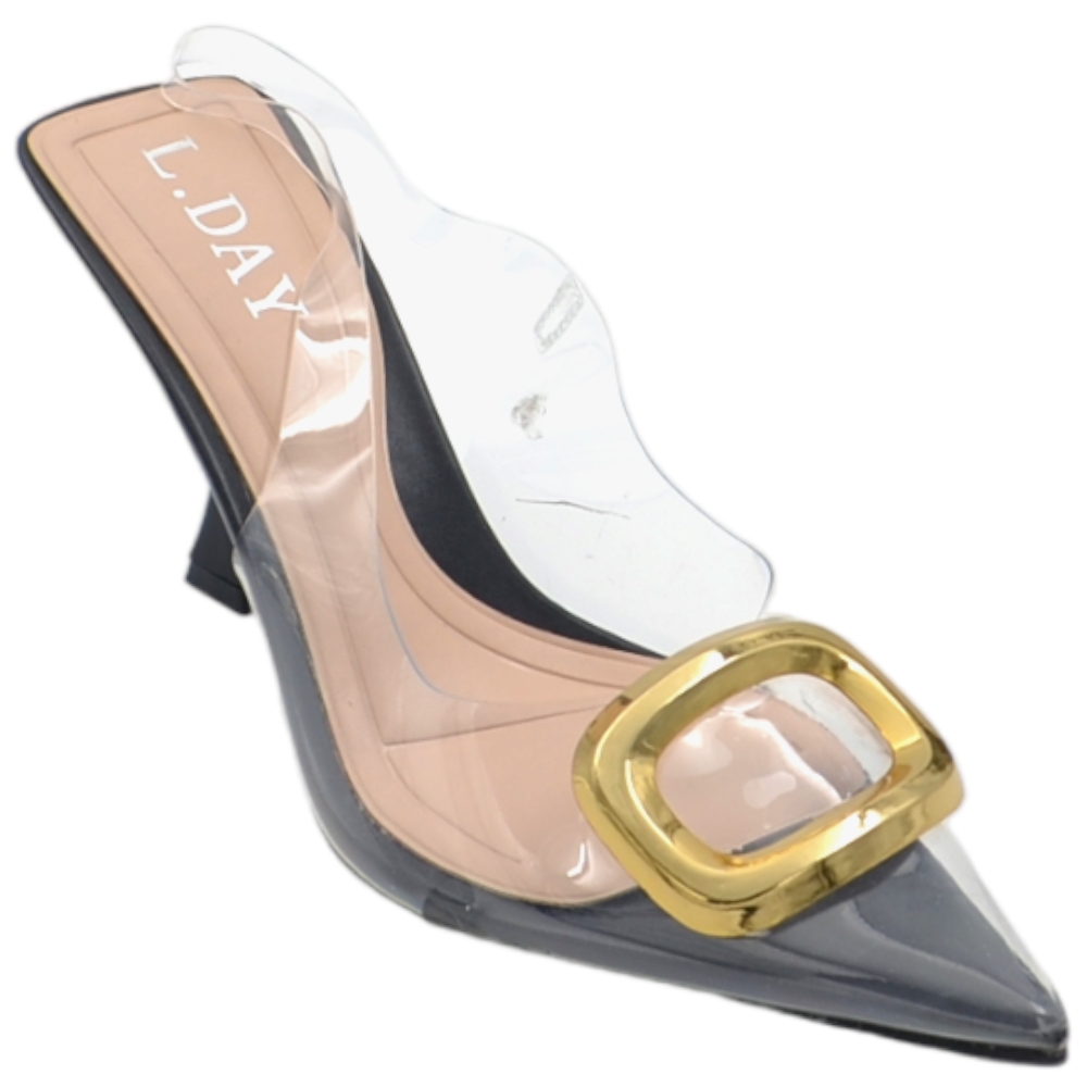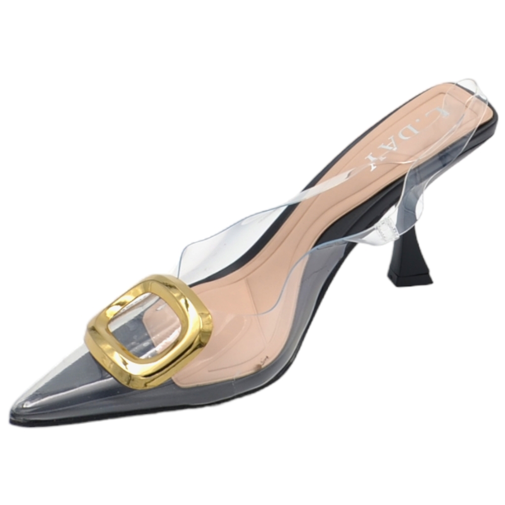 Decollete scarpa donna a punta trasparente con spilla gioiello circolare brillantini argento tacco clessidra nero 7 cm .