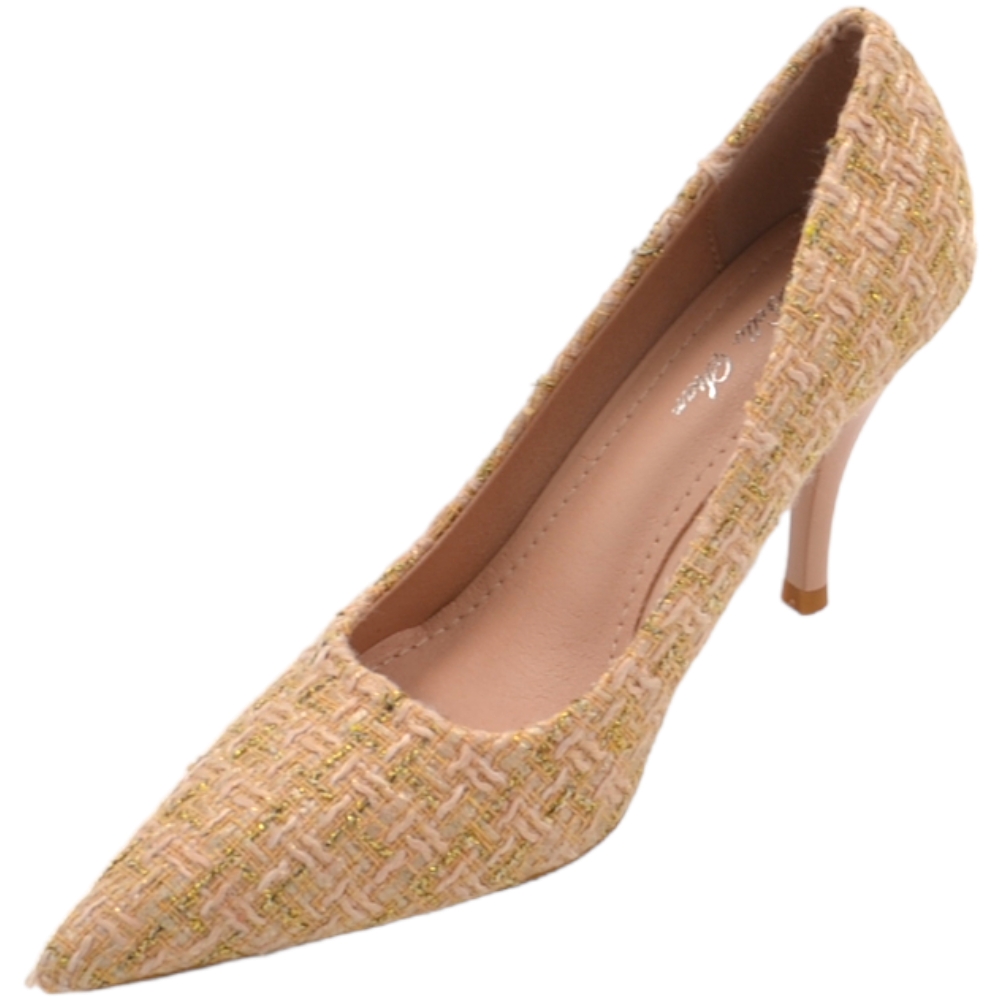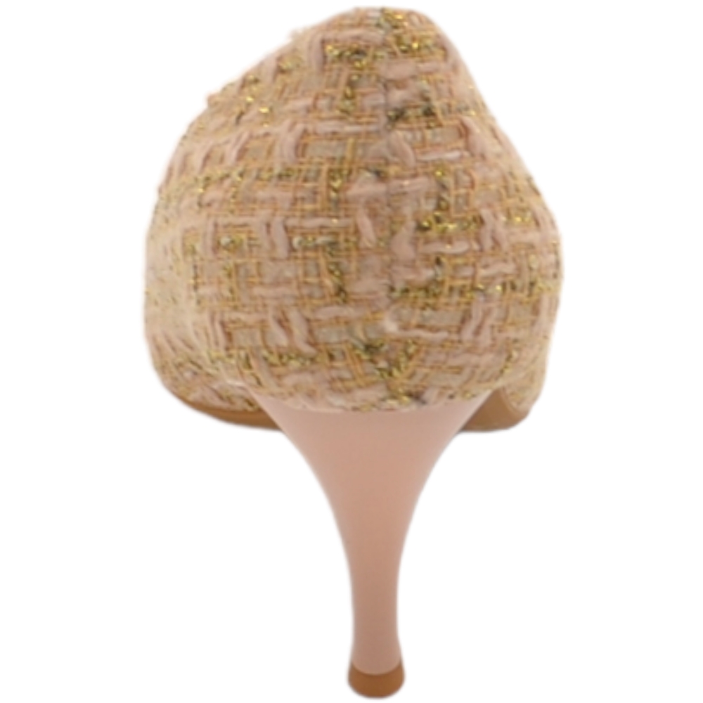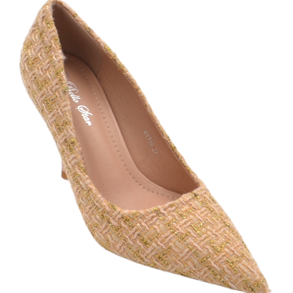 Decollete scarpa donna a punta in tessuto tartan beige bianco e oro con tacco cono 10 cm moda