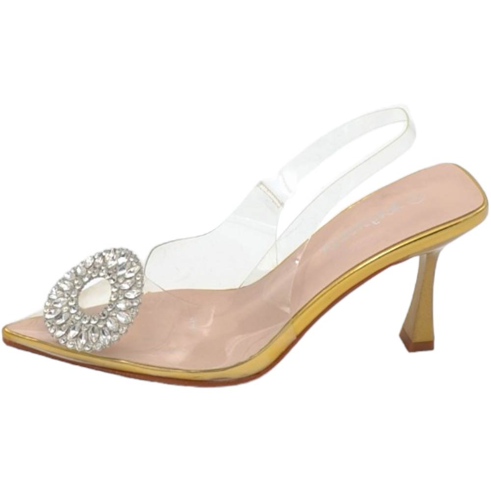 Scarpa decollete' donna a punta slingback con trasparenza oro e brillantini con tacco mini 3 cm e cinturino tallone.