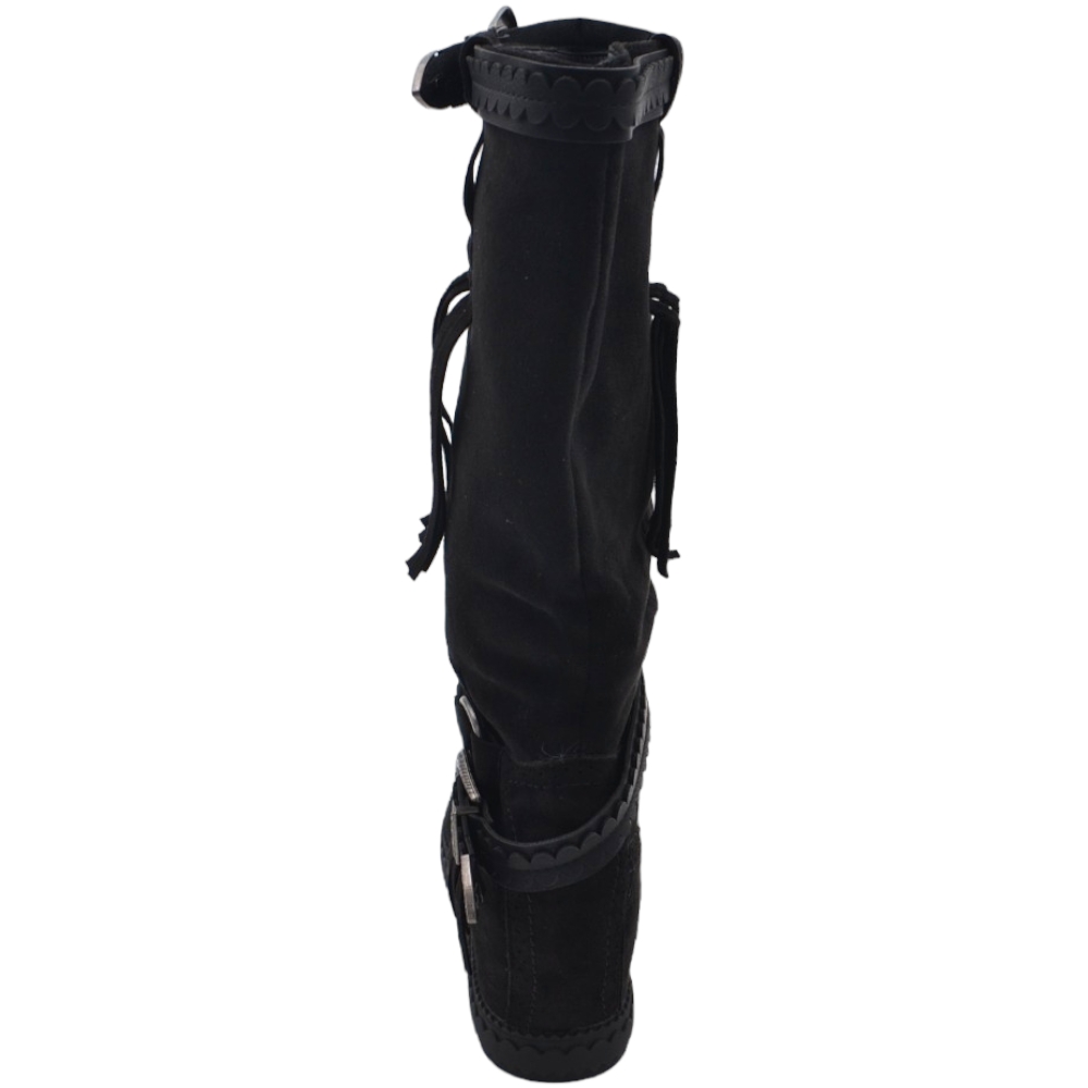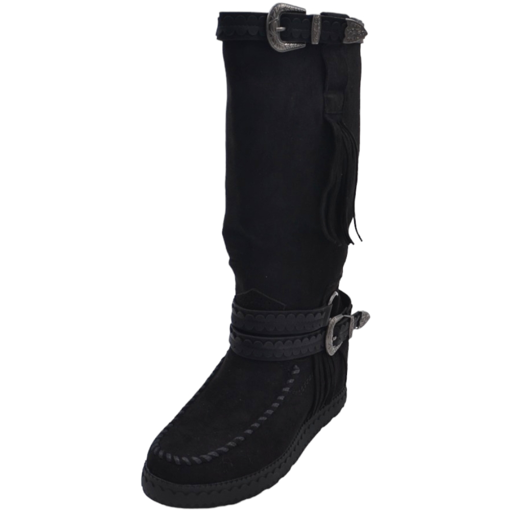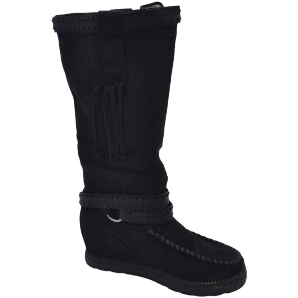 Stivali donna indianini nero scamosciati con frange zeppa interna 5 cm cinturino fibbia altezza polpaccio moda