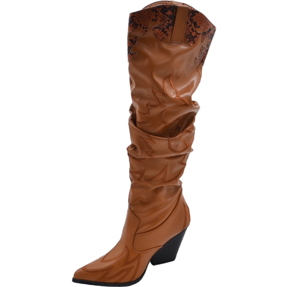 Stivali camperos donna in ecopelle arricciata cuoio altezza ginocchio con tacco western legno 5cm dettagli animalier zip