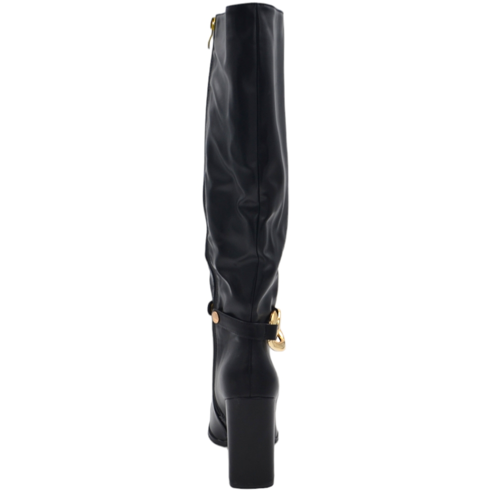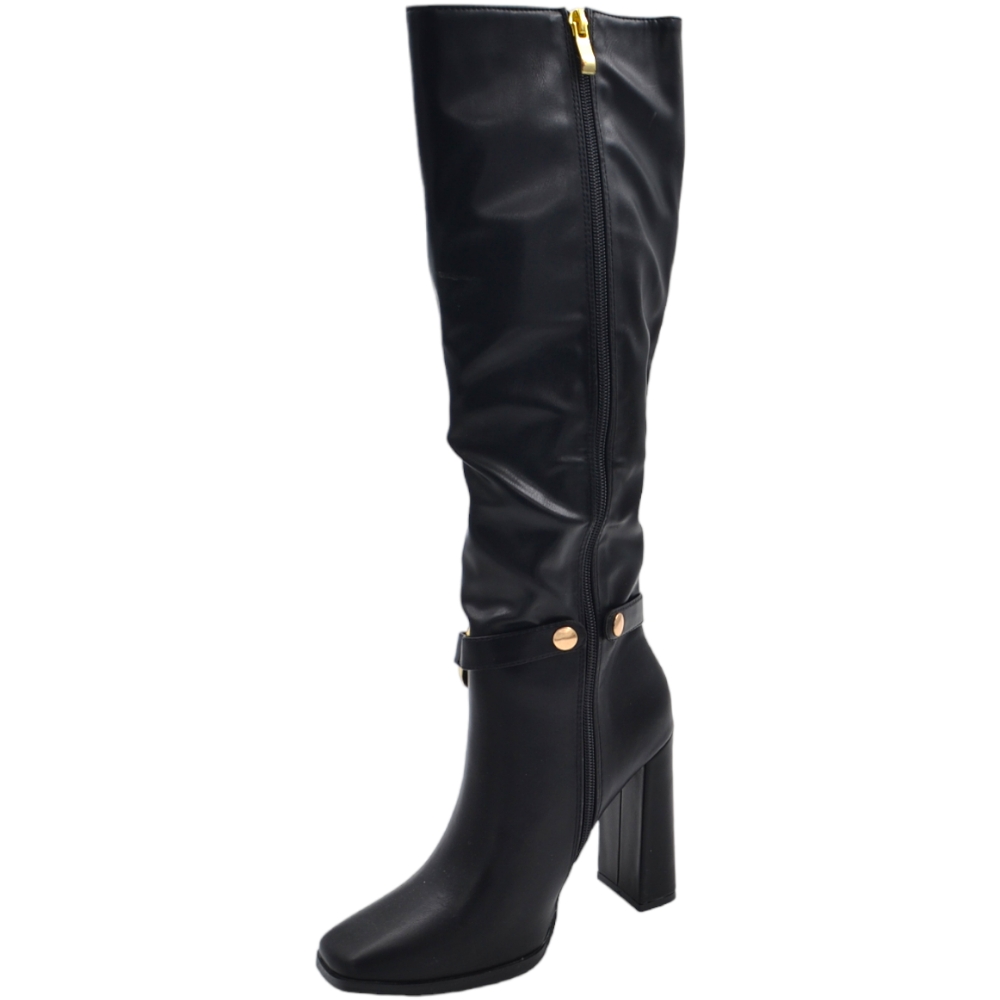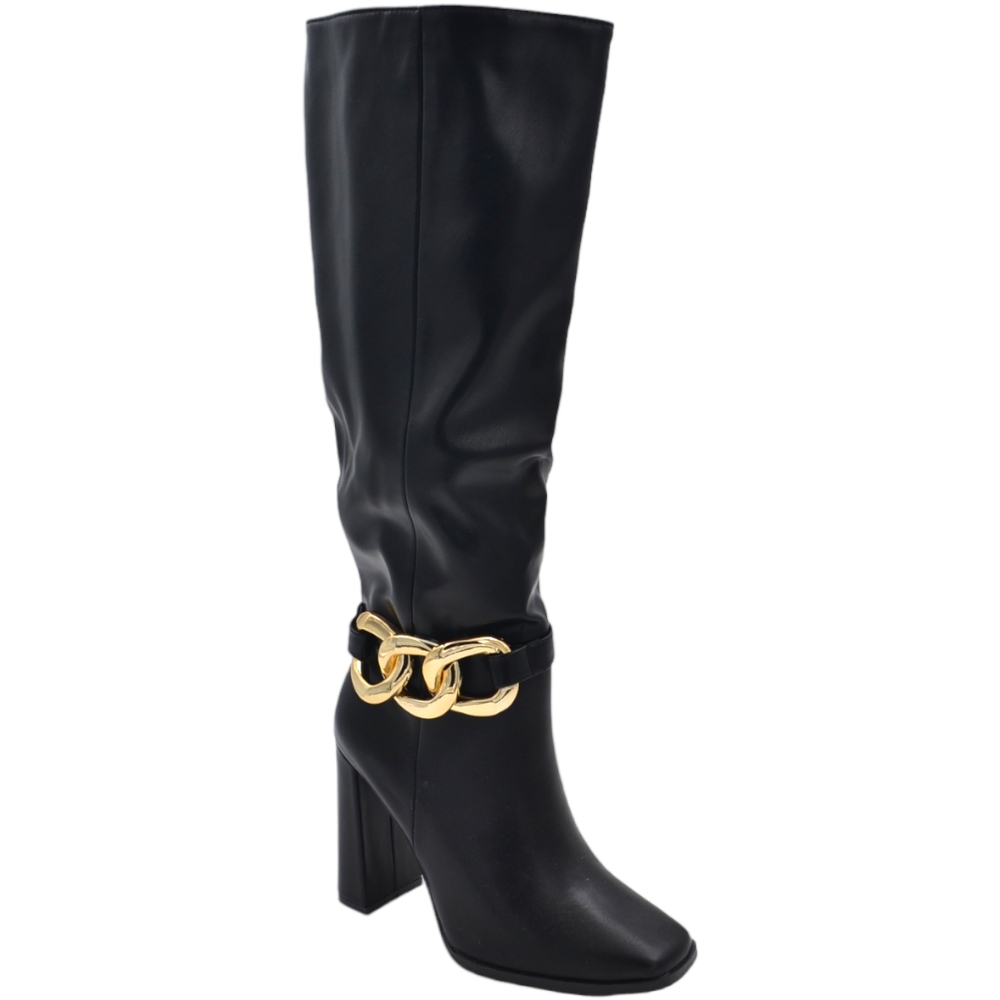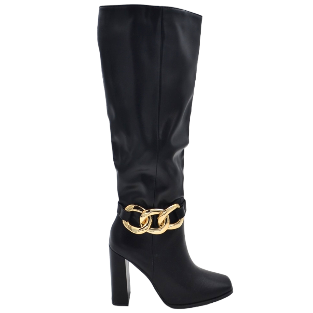 Stivale donna alto morbido in pelle nera con tacco largo10 cm liscio con catena oro a punta quadrata altezza ginocchio