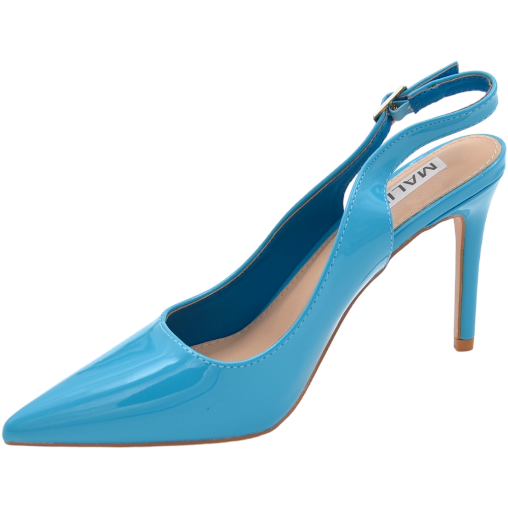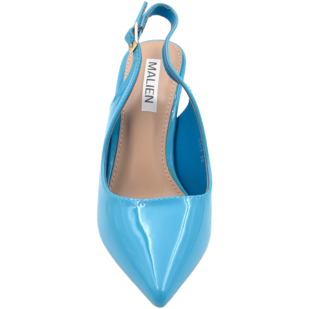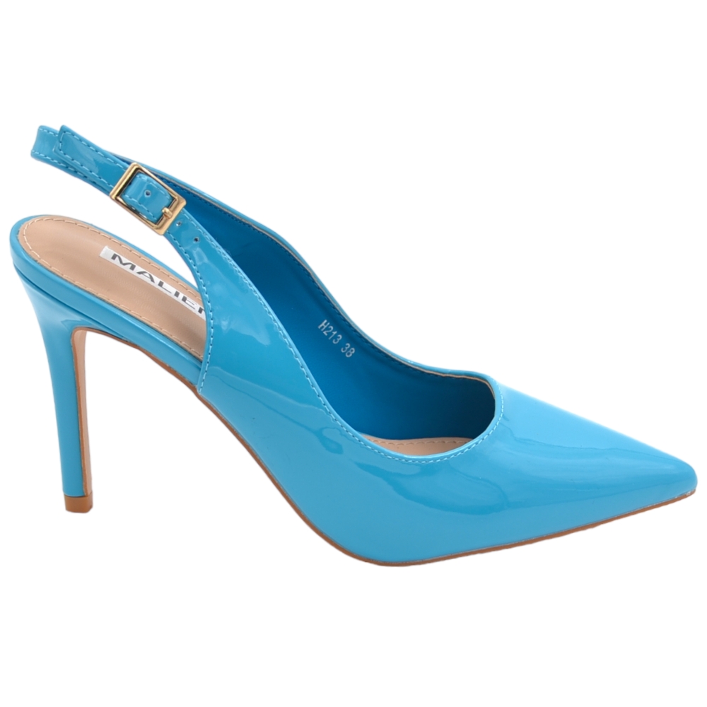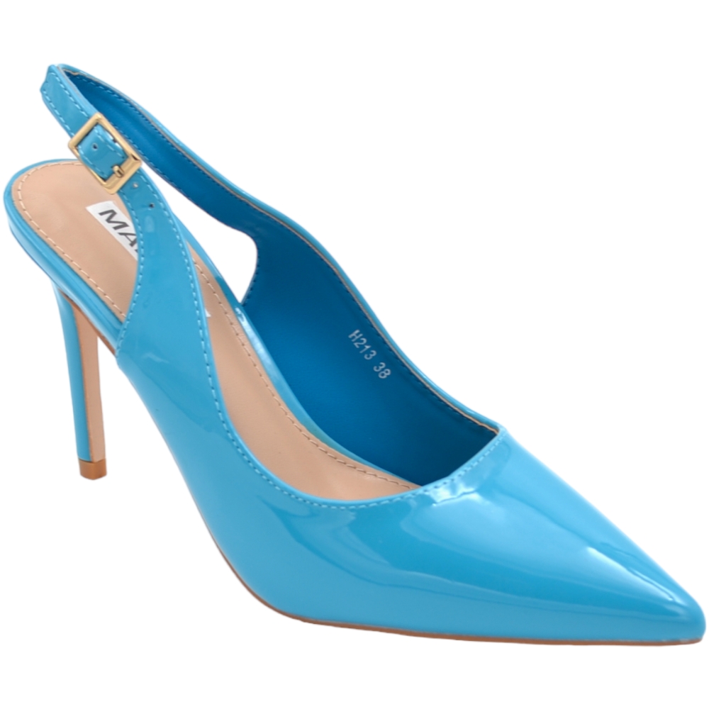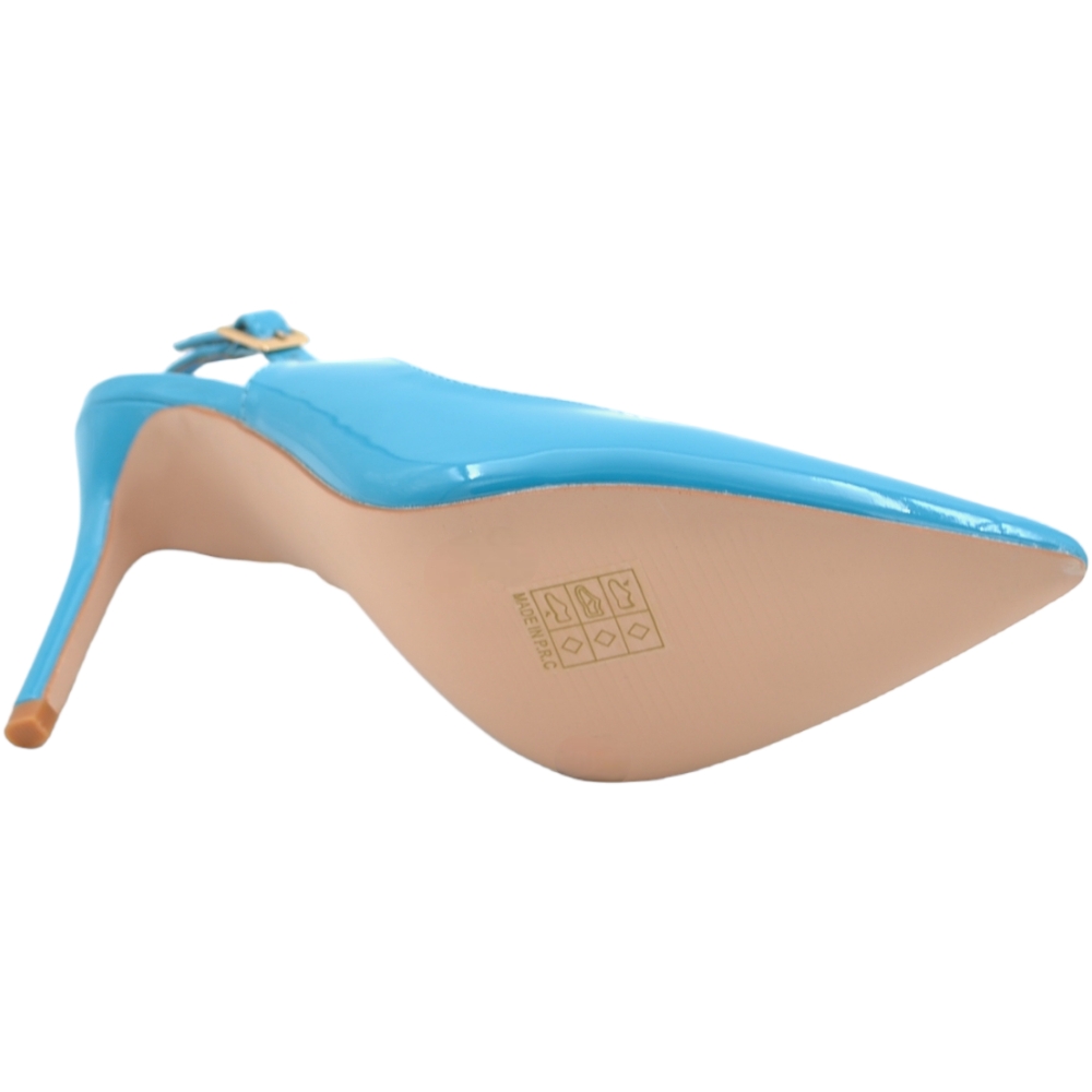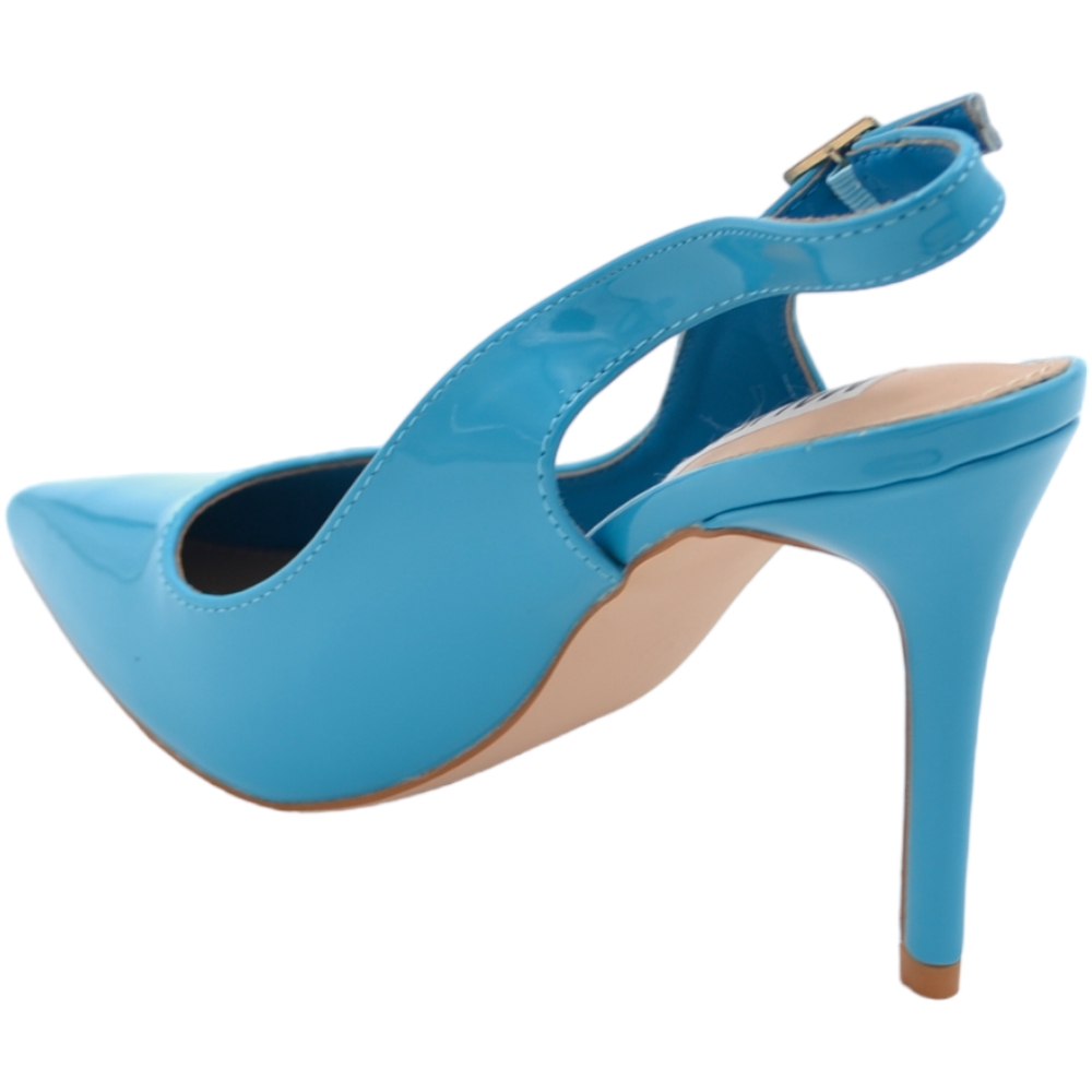 Scarpe decollete slingback donna elegante a punta in vernice lucida celeste tacco 10cm cinturino tallone regolabile