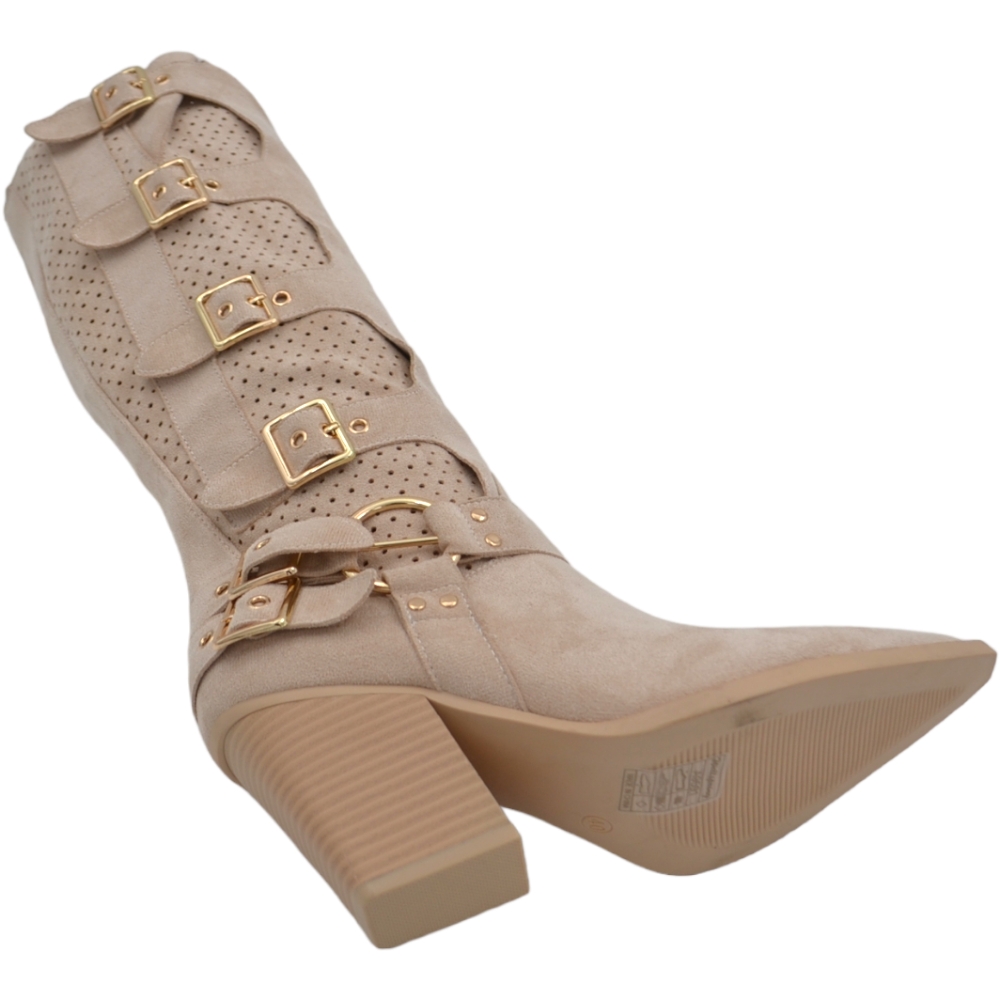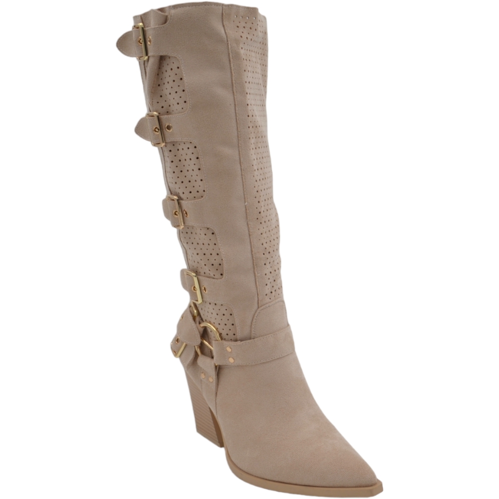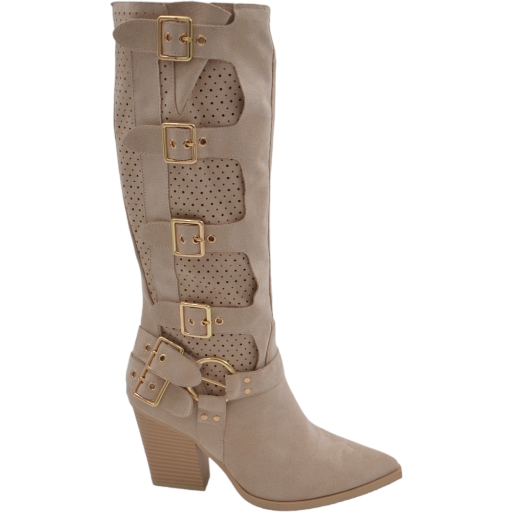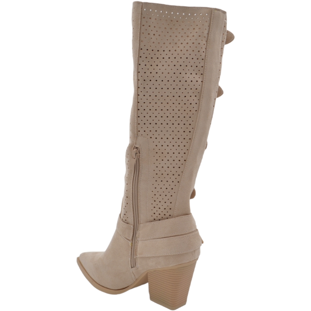 Stivali donna camperos in camoscio traforato beige tacco western 6cm legno gambale con fibbie regolabili zip laterale