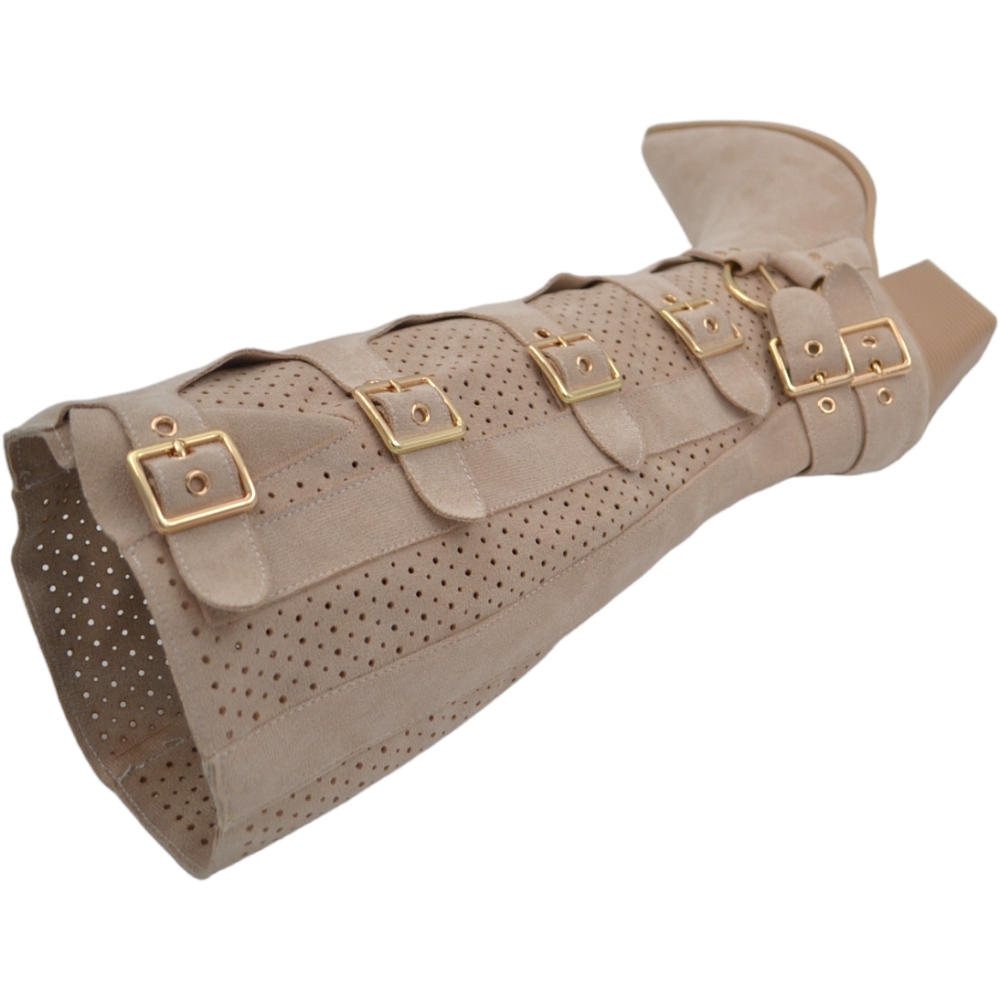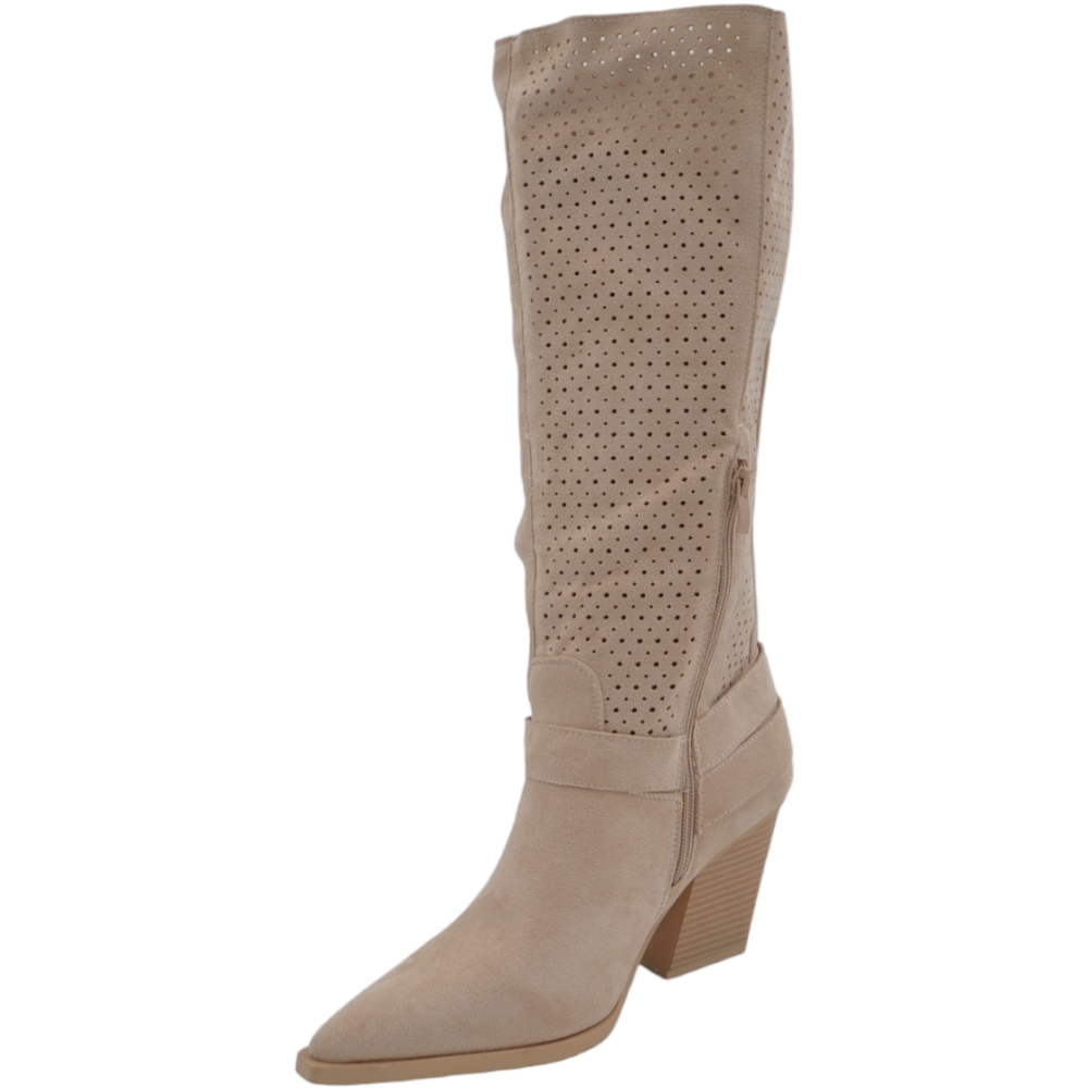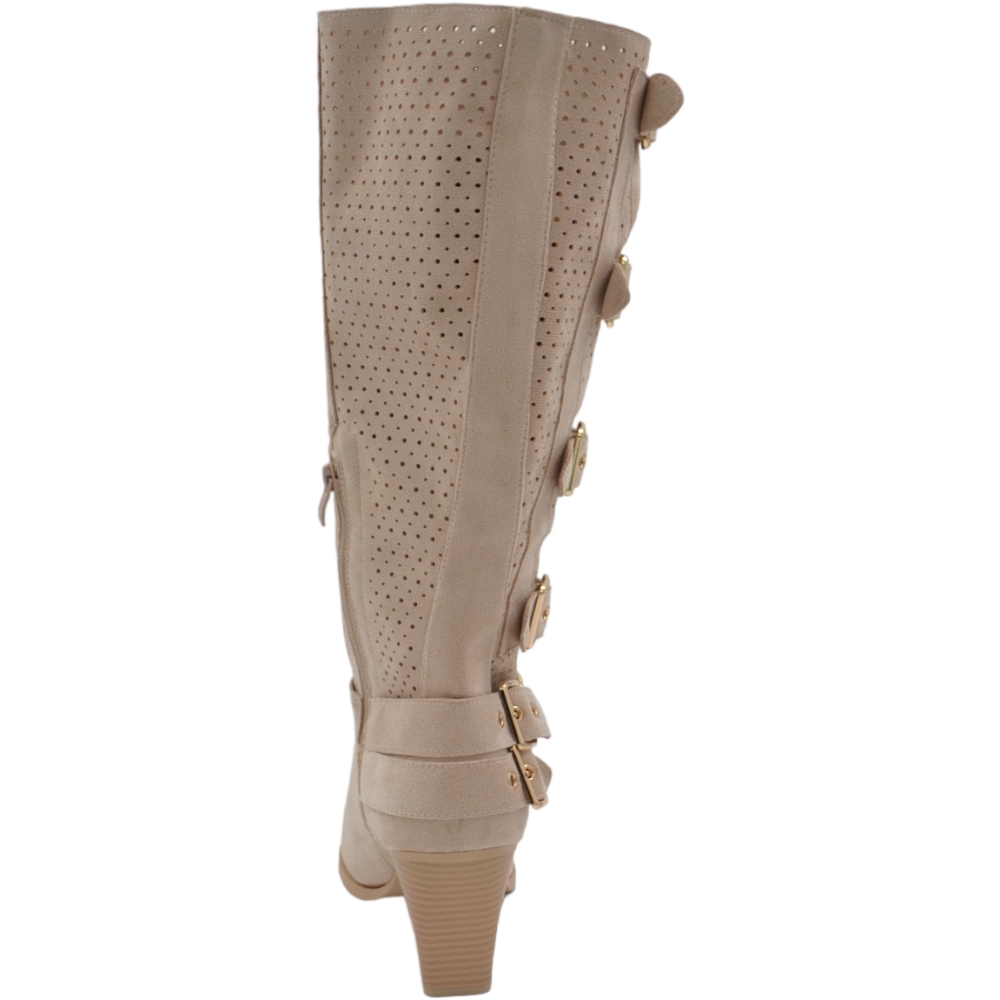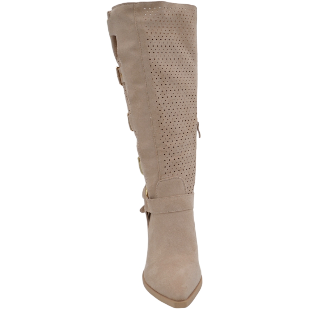 Stivali donna camperos in camoscio traforato beige tacco western 6cm legno gambale con fibbie regolabili zip laterale