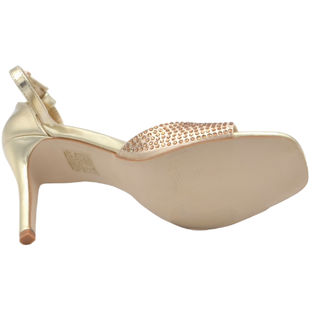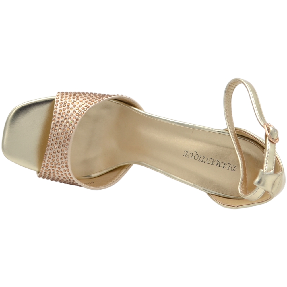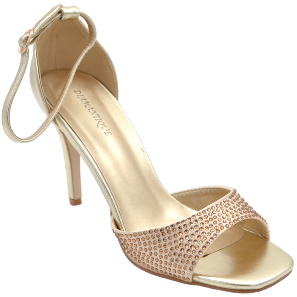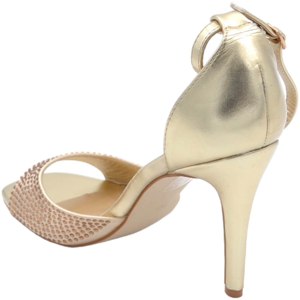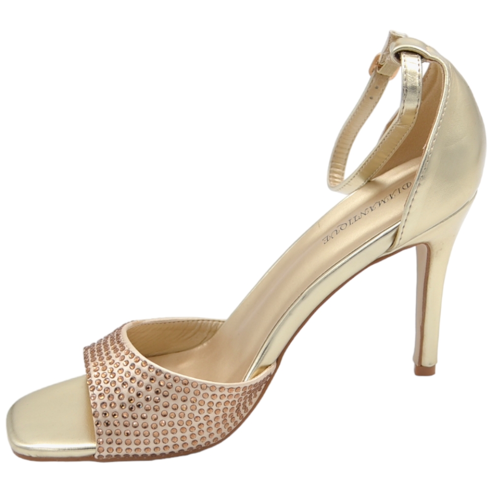 Sandali tacco donna fascetta in tessuto oro strass tono su tono cinturino alla caviglia tacco a spillo comodo 12cm