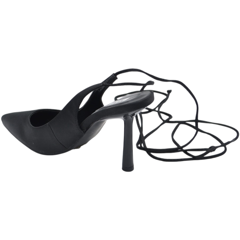 Decollete a punta donna in raso nero tallone scoperto allacciatura alla schiava con lacci tacco sottile 12 cm moda