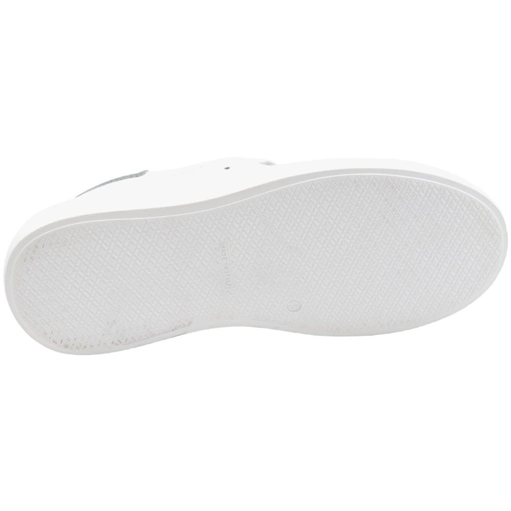 Sneakers bassa uomo bianca in vera pelle riporto argento dietro lacci in tinta fondo army bianco moda uomo made in italy.