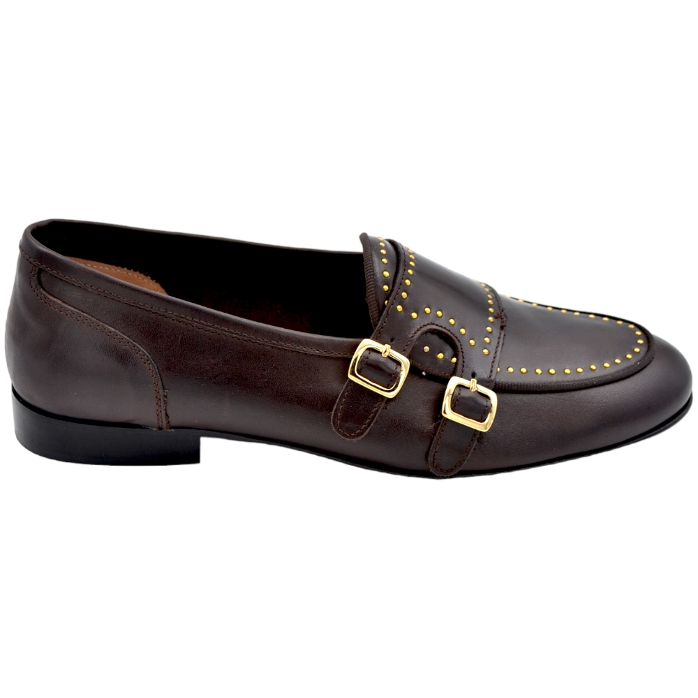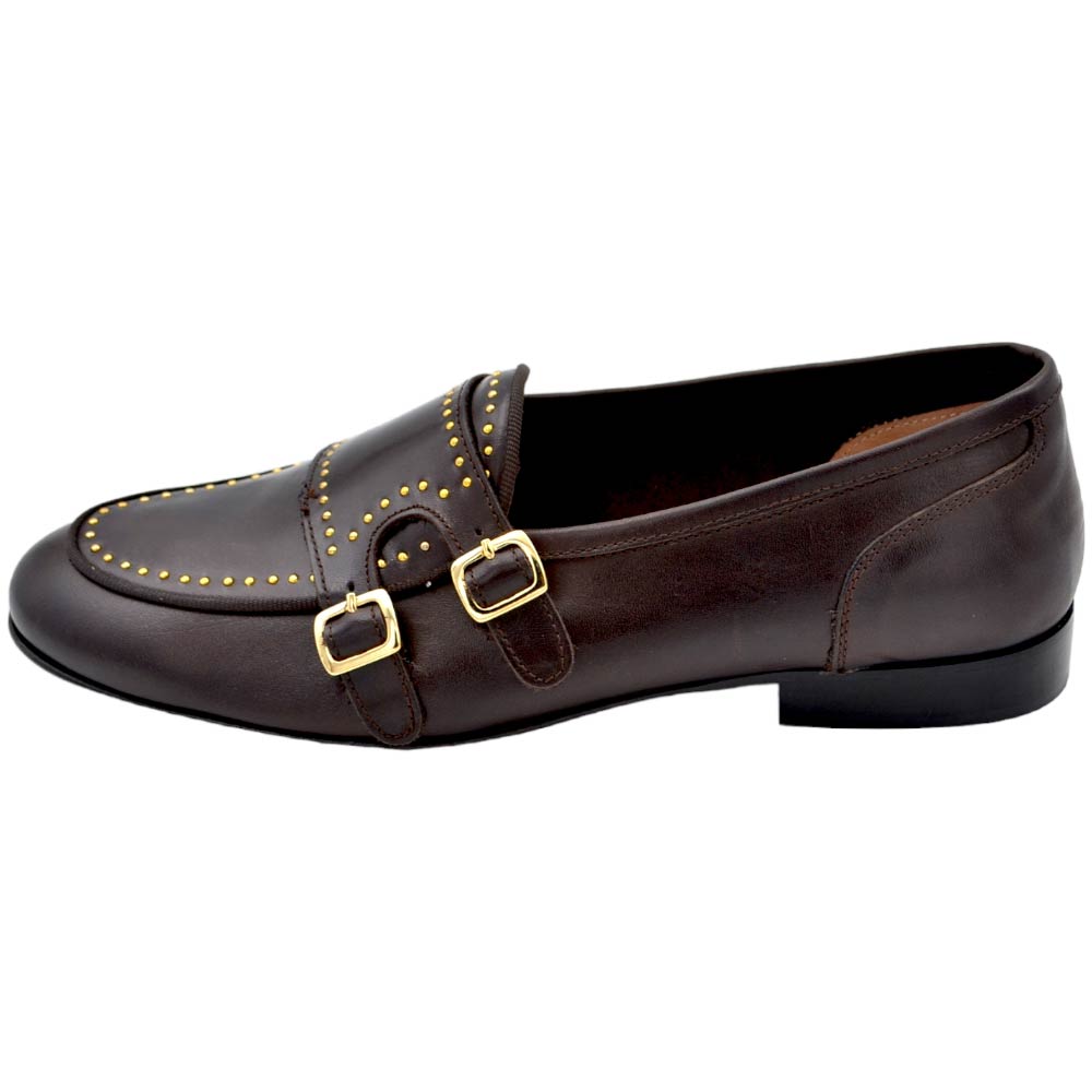 Scarpa mocassino uomo ls doppia fibbia oro vera pelle marrone borchie oro cucita a mano fondo cuoio