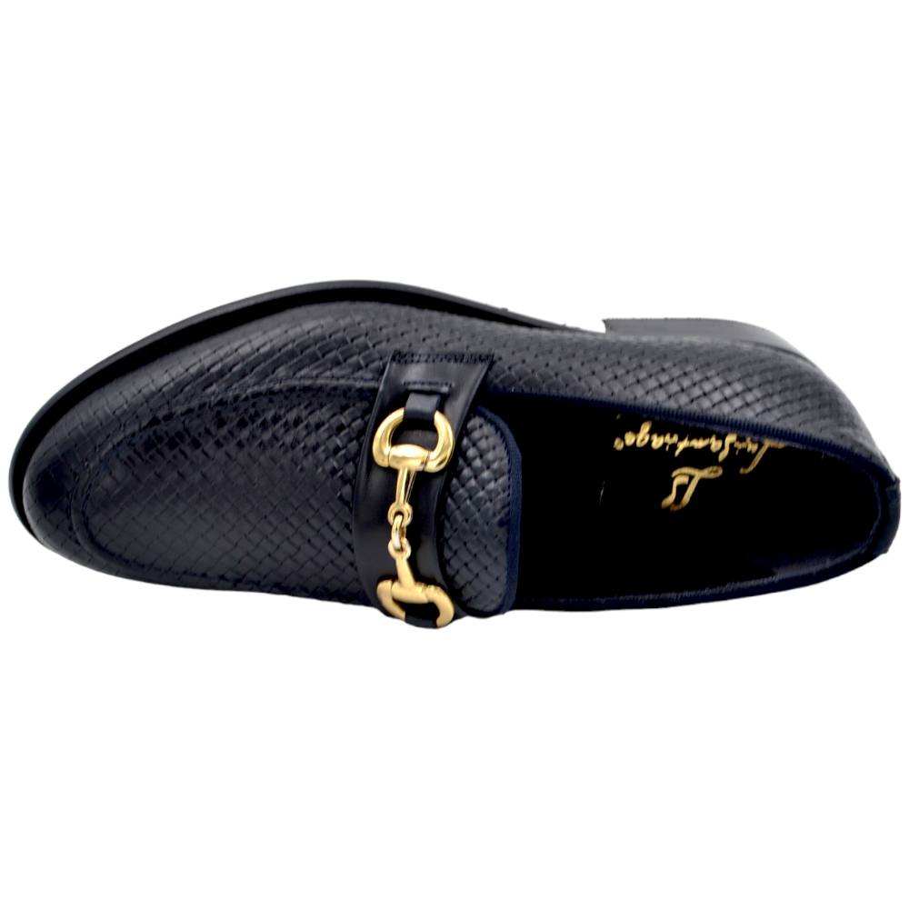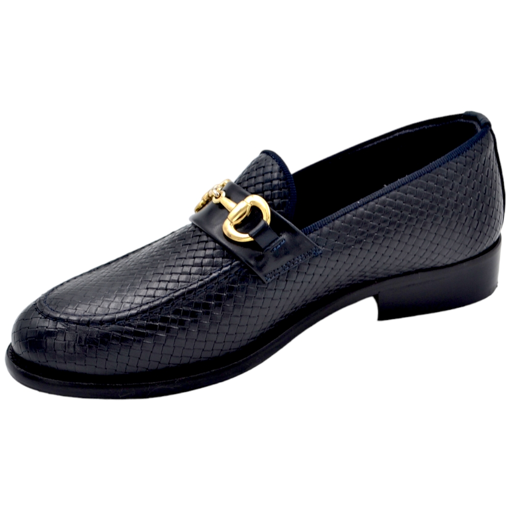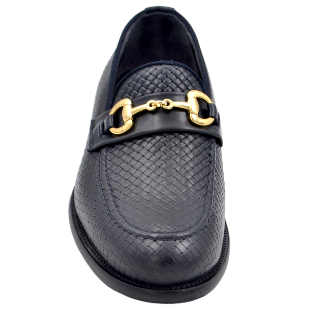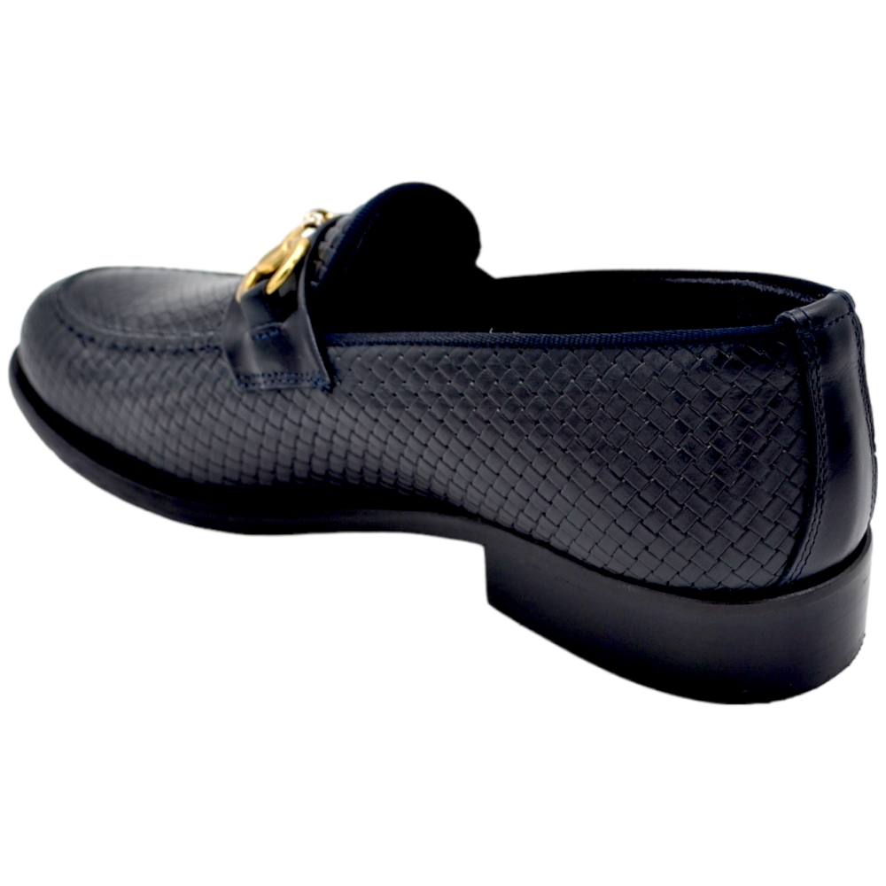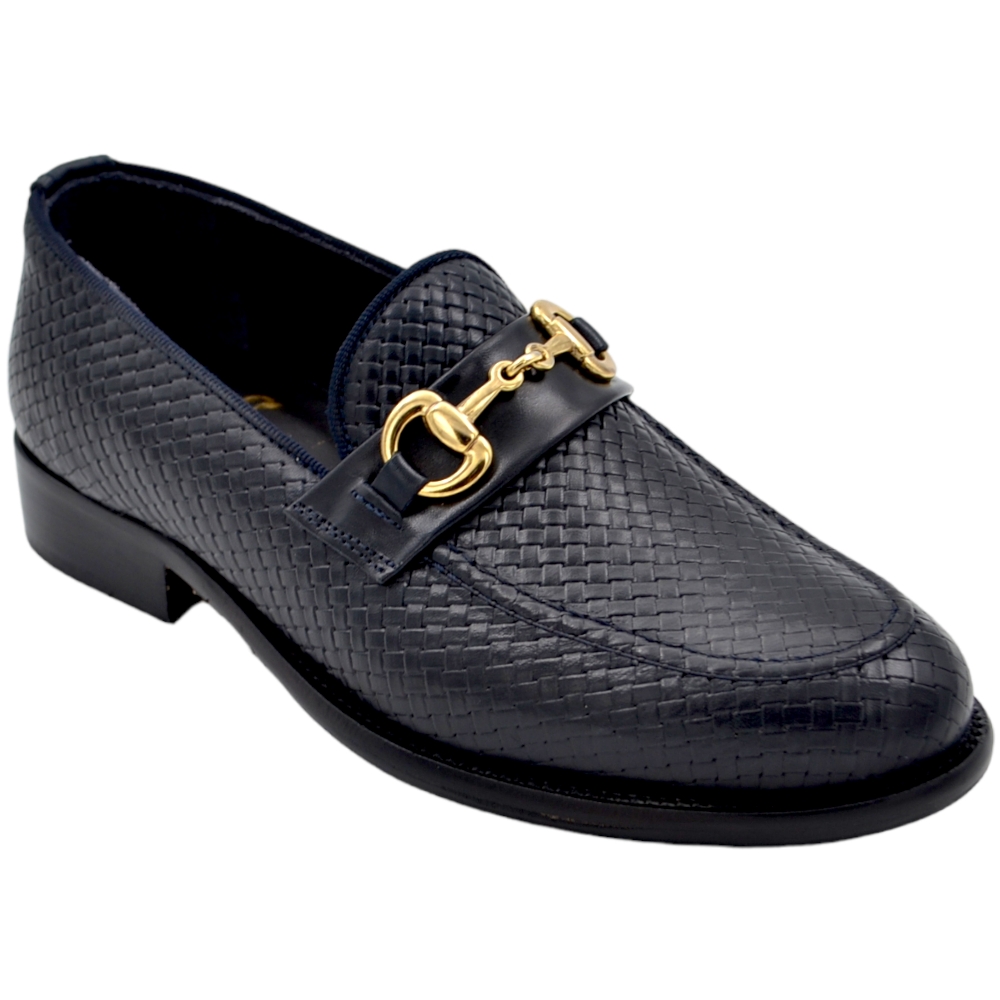 Scarpe mocassino uomo elegante morsetto oro vera pelle intrecciata blu suola in cuoio antiscivolo cerimonia evento
