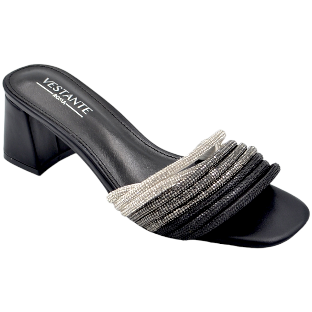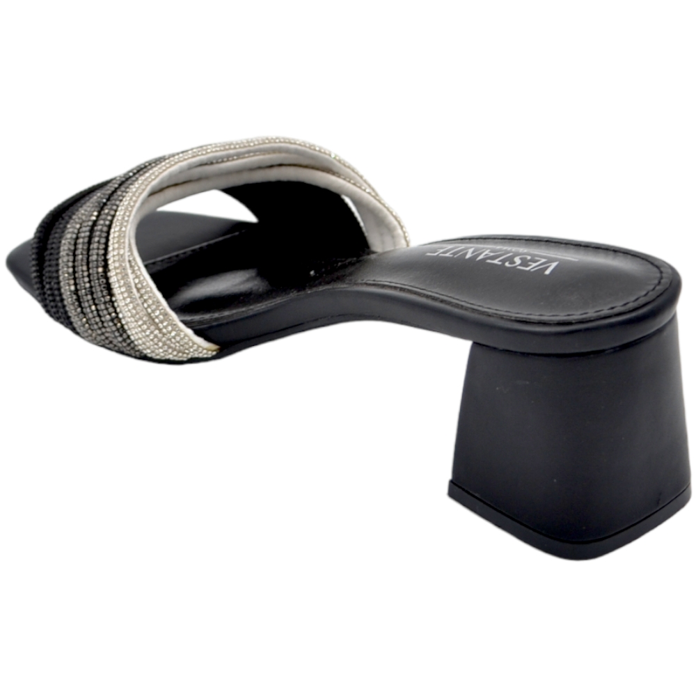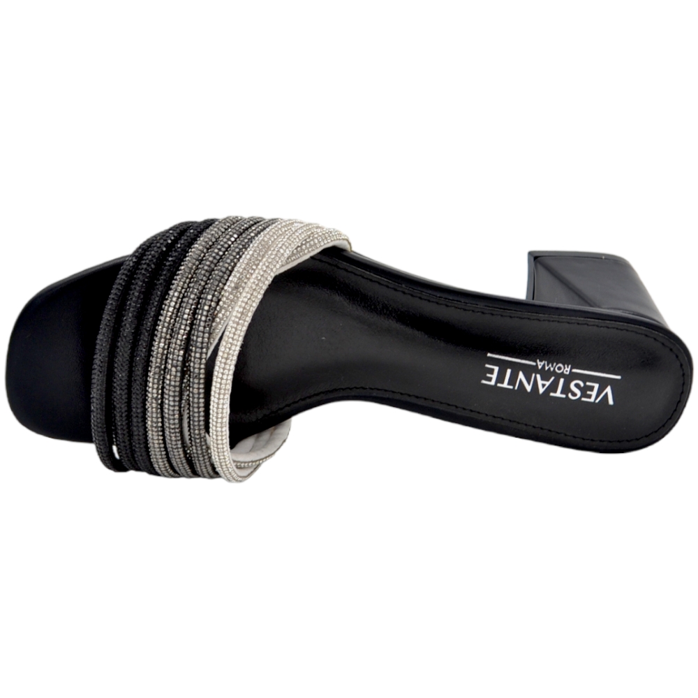 Sandalo gioiello donna nero mule aperto dietro con gradiente di brillantini sfumato tacco largo 5 cm