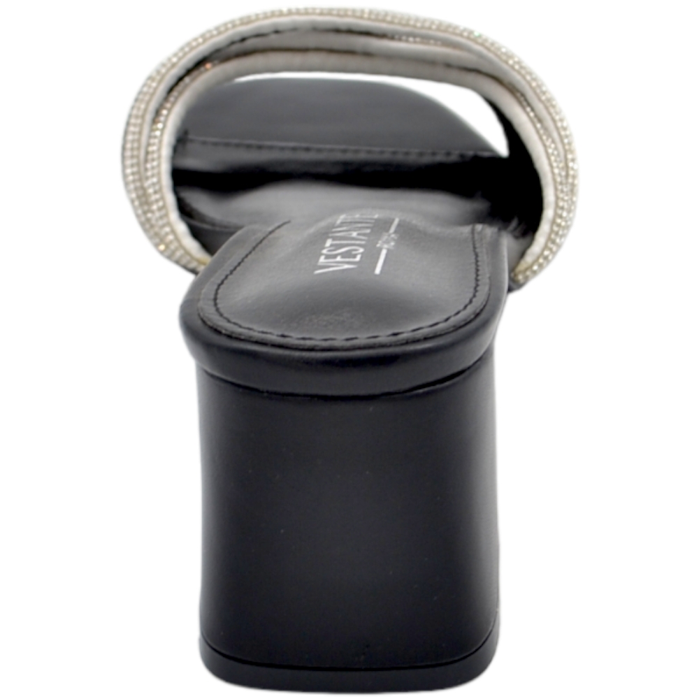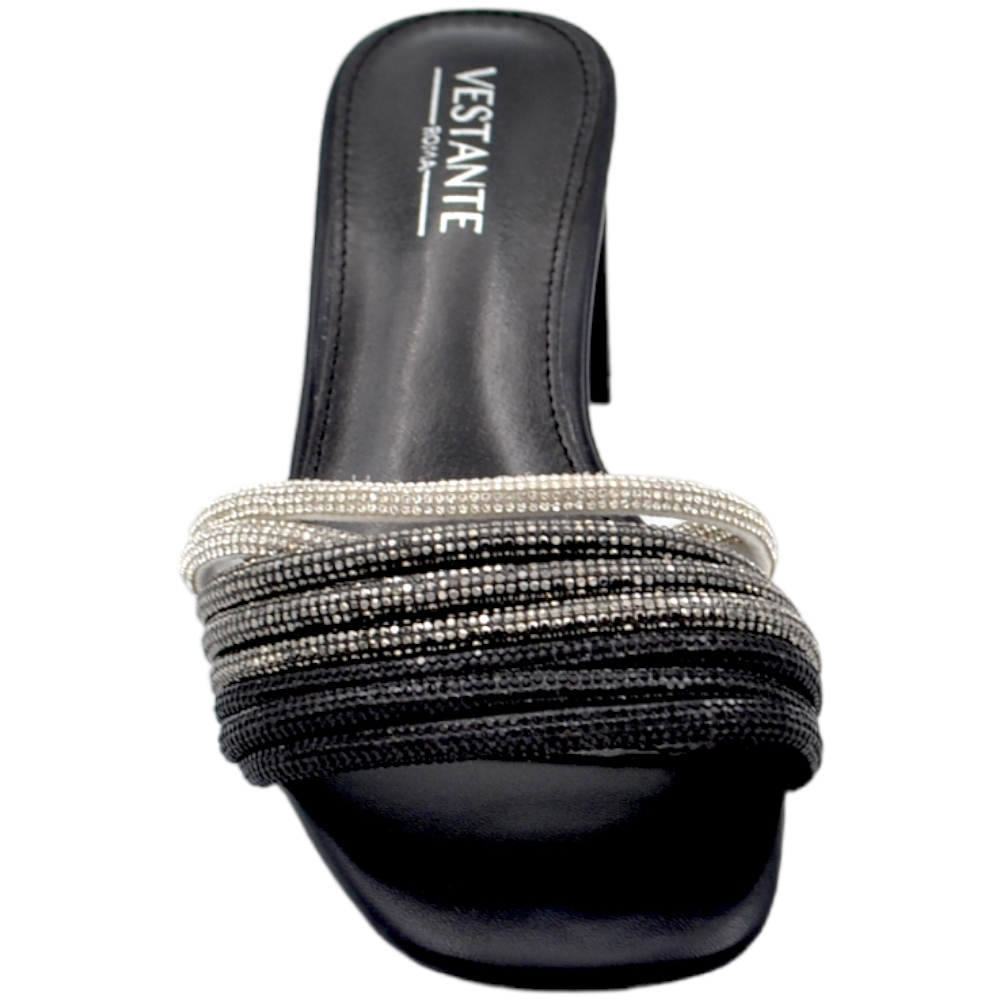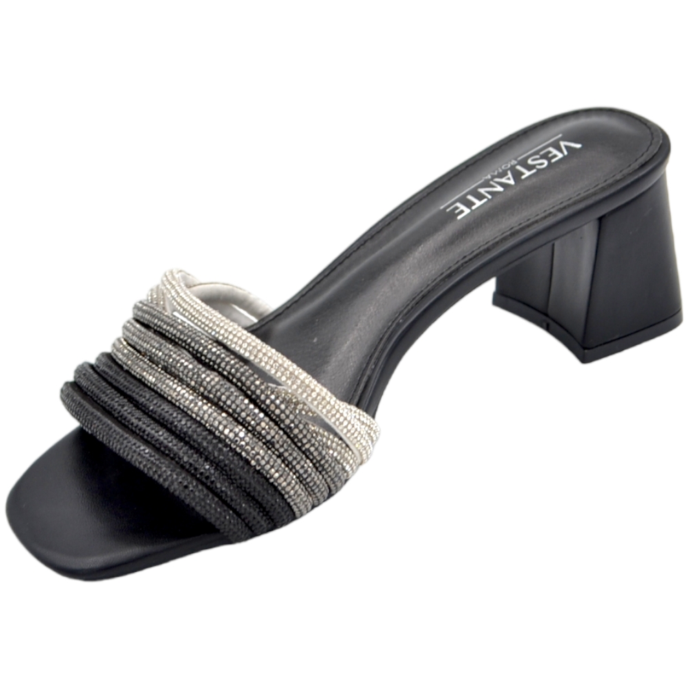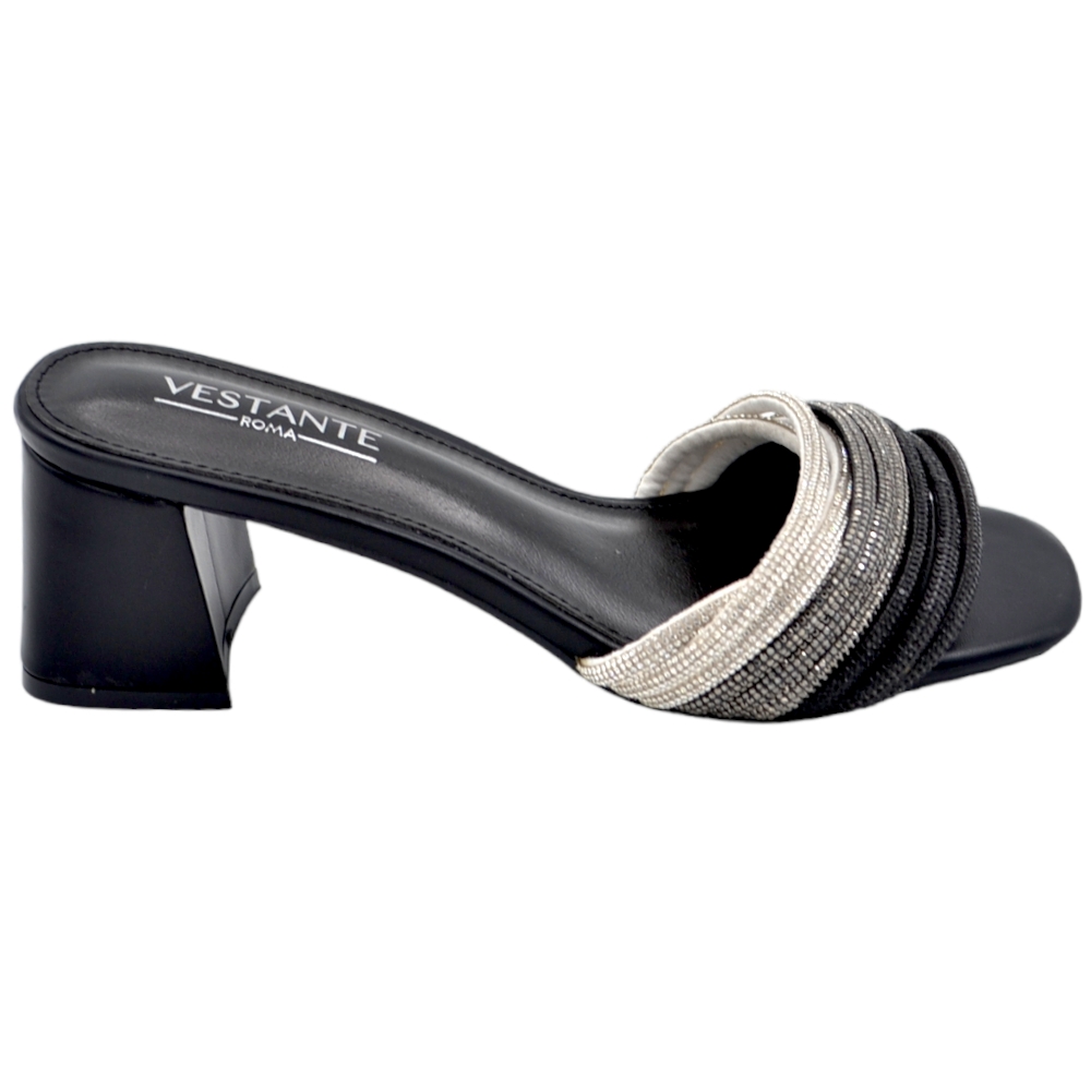 Sandalo gioiello donna nero mule aperto dietro con gradiente di brillantini sfumato tacco largo 5 cm