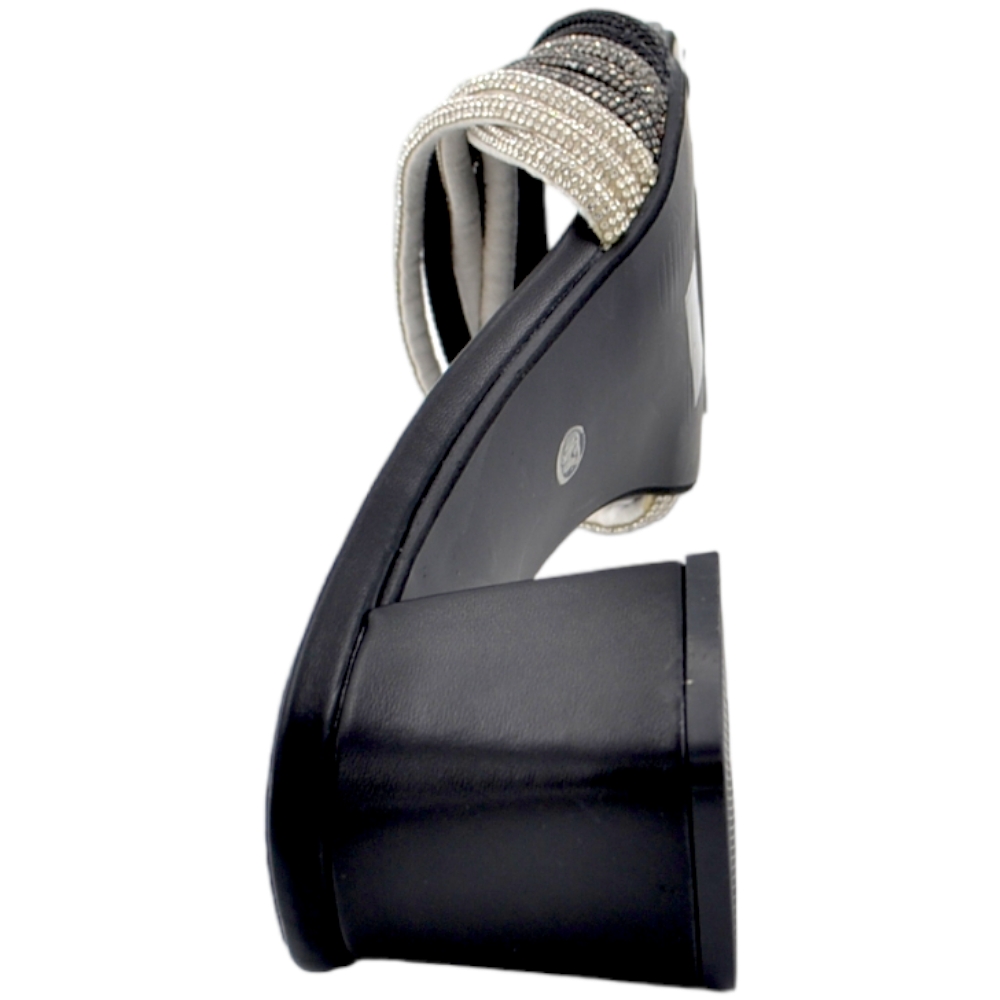 Sandalo gioiello nero donna tacco sottile 8 cm fascia larga con strass pendenti luccicanti cerimonia evento open toe.