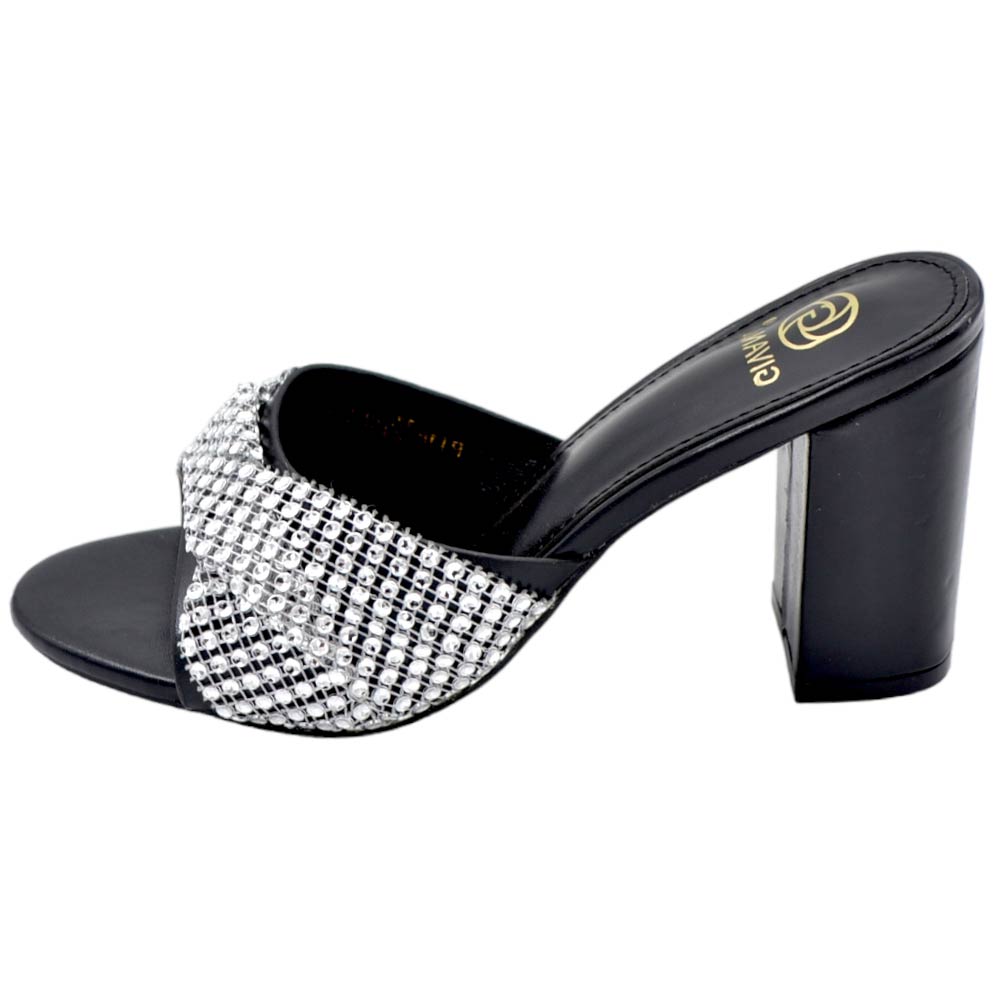 Sandalo gioiello donna nedro mule aperto dietro con fiocco di brillantini tacco largo 8 cm