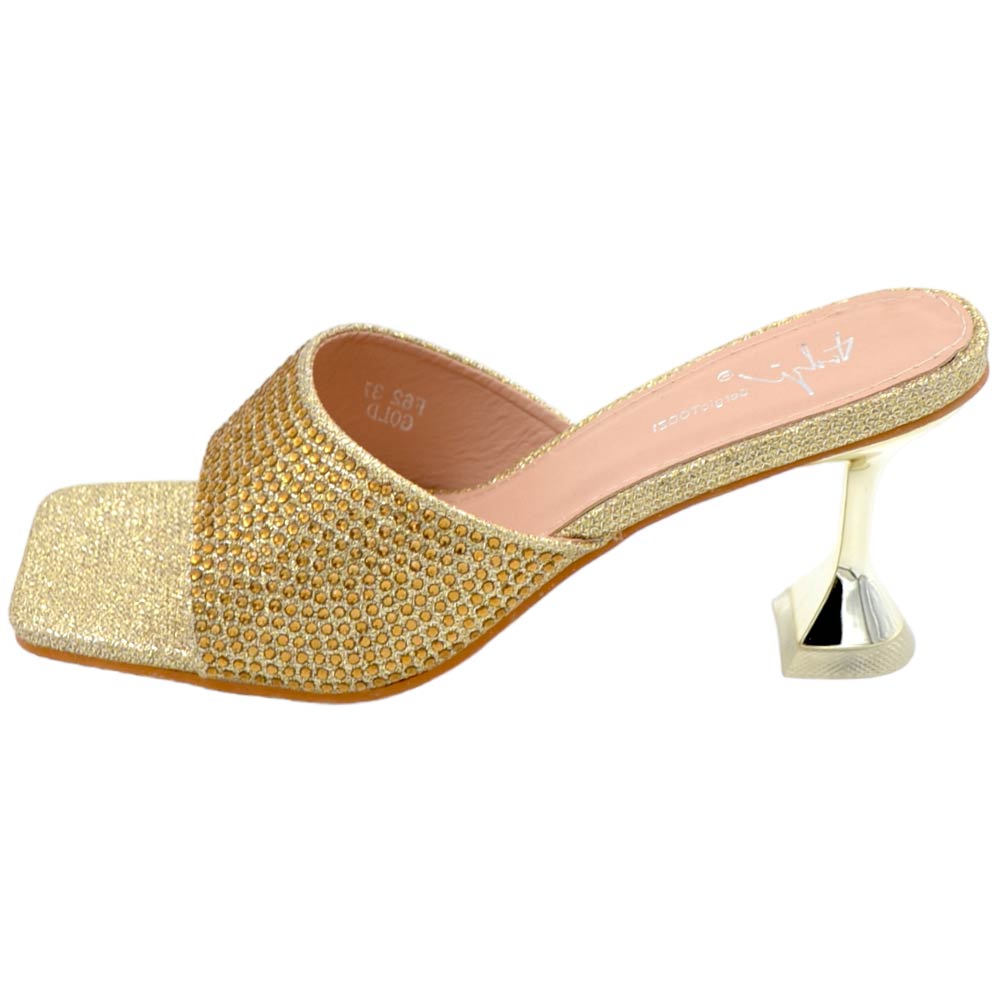 Sandali oro donna mule aperti dietro unica fascetta brillantini tacco martini lucido 5 cm