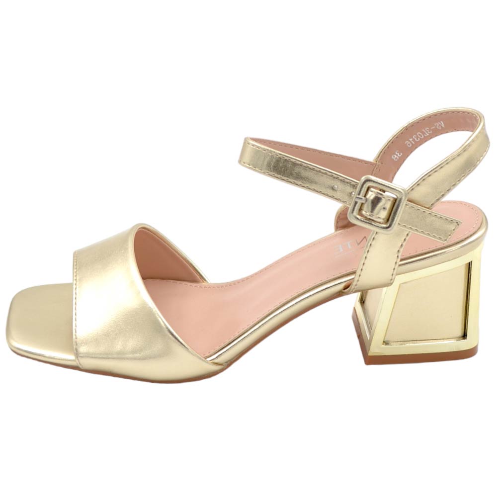 Sandalo donna dorato satinato unica fascia larga tacco gioiello largo 4 cm comodo