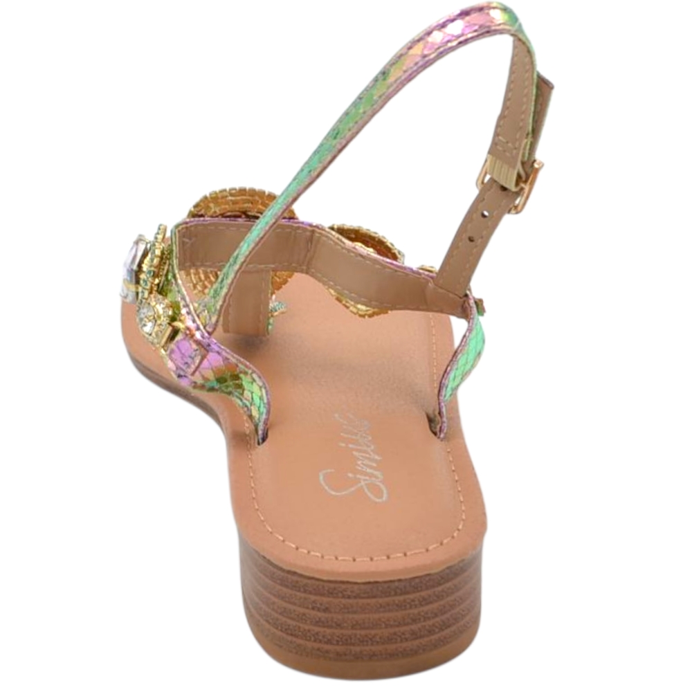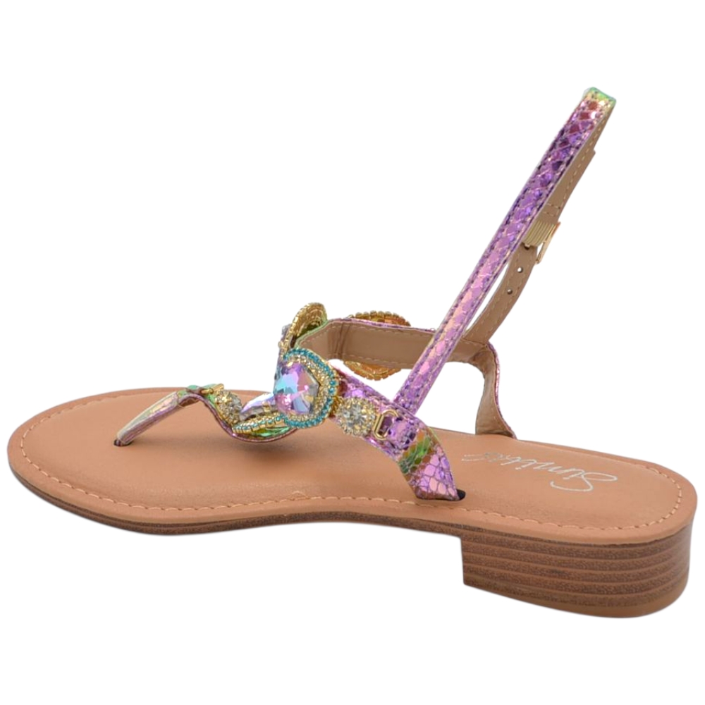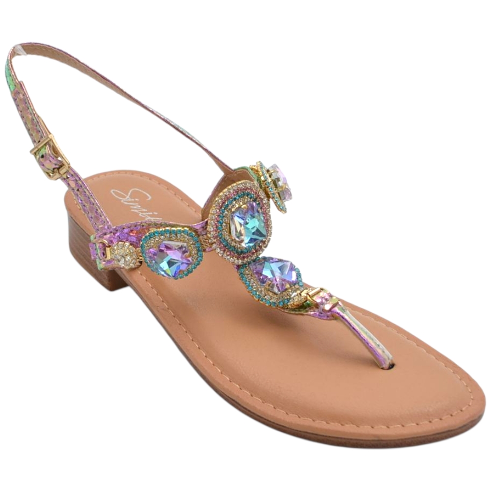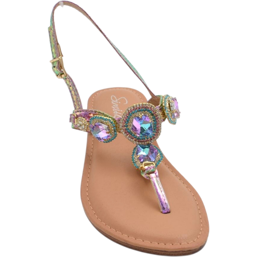 Il sandalo gioiello è una scarpa da donna di qualità, femminile e trendy. Il piede è elegantemente vestito da fascette decorate con brillantini e cinturino regolabile al tallone. Un sandalo piatto di tendenza pratico e comodo senza tacco ideale per le donne glamour che amano vestire accessori confortevoli capaci di esaltare la loro femminilità senza rinunciare a seguire i dettami della moda.