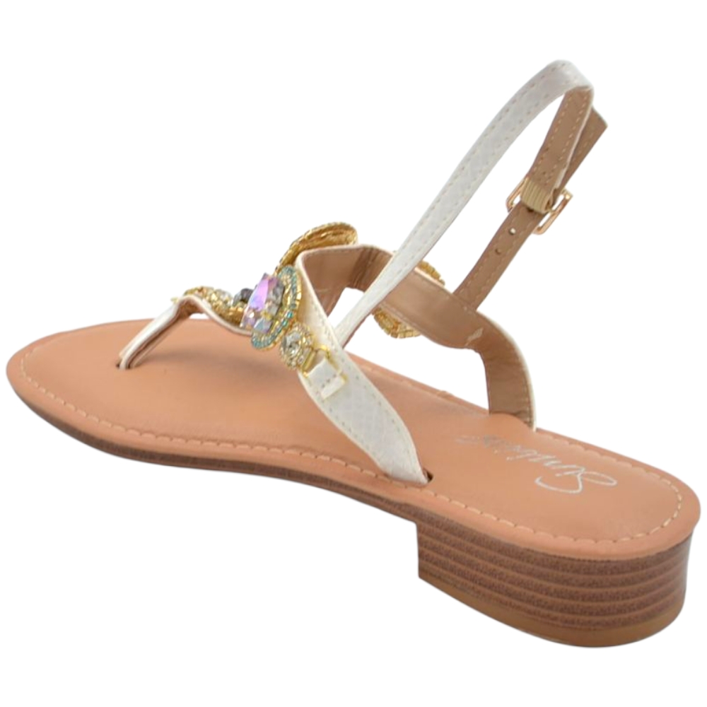 Il sandalo gioiello è una scarpa da donna di qualità, femminile e trendy. Il piede è elegantemente vestito da fascette decorate con brillantini e cinturino regolabile al tallone. Un sandalo piatto di tendenza pratico e comodo senza tacco ideale per le donne glamour che amano vestire accessori confortevoli capaci di esaltare la loro femminilità senza rinunciare a seguire i dettami della moda.