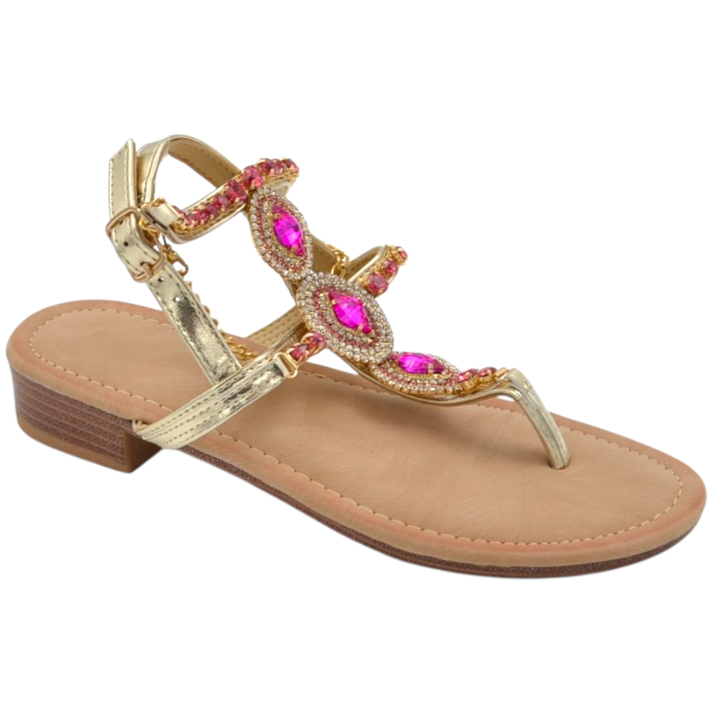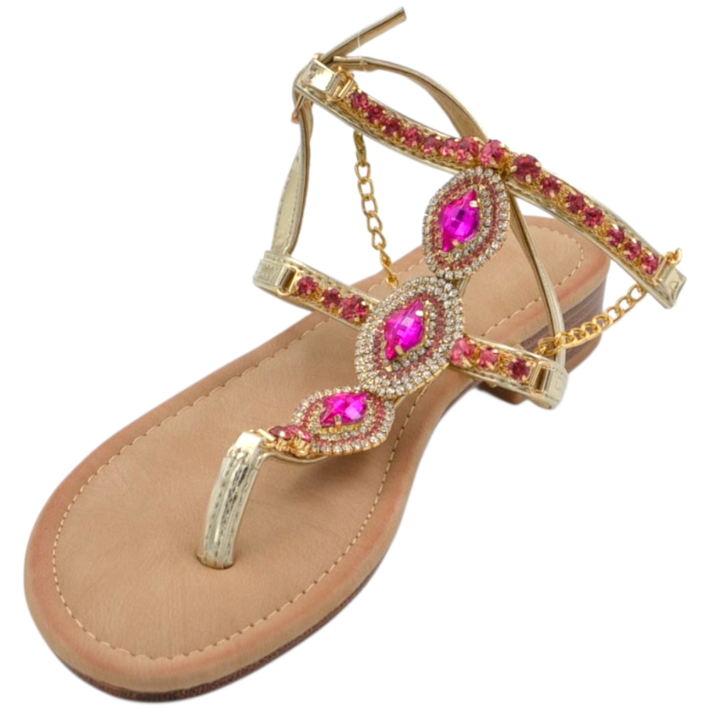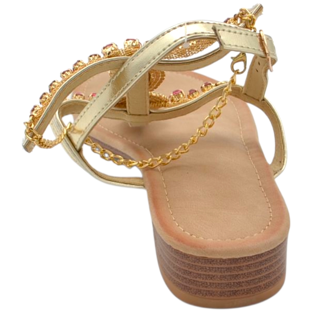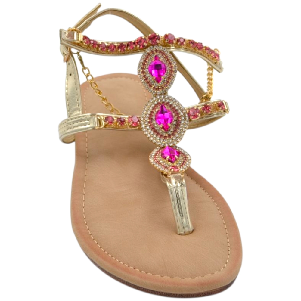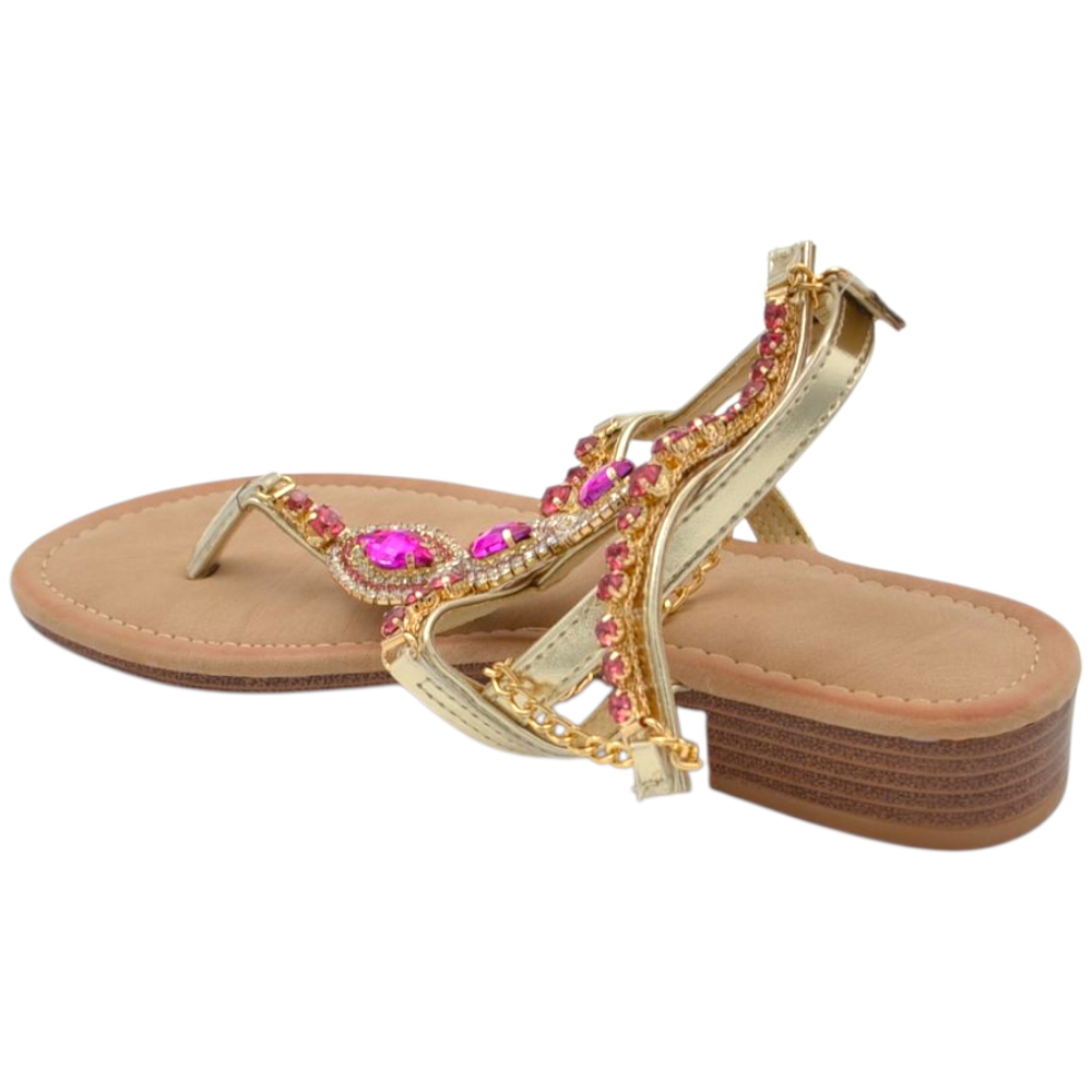Sandalo basso donna infradito con cavigliera gioiello oro pietre colorate fucsia interno morbido tacco 2 cm