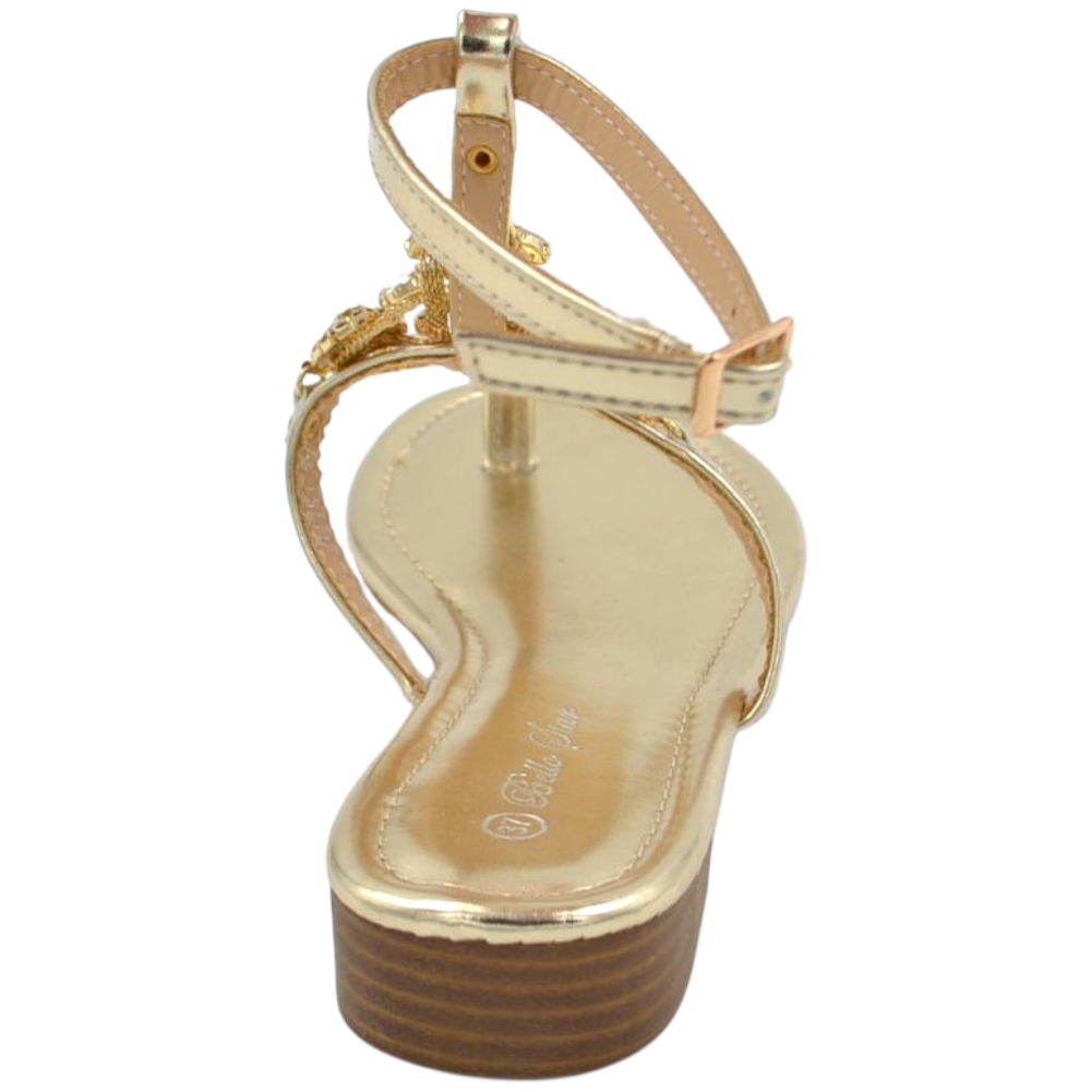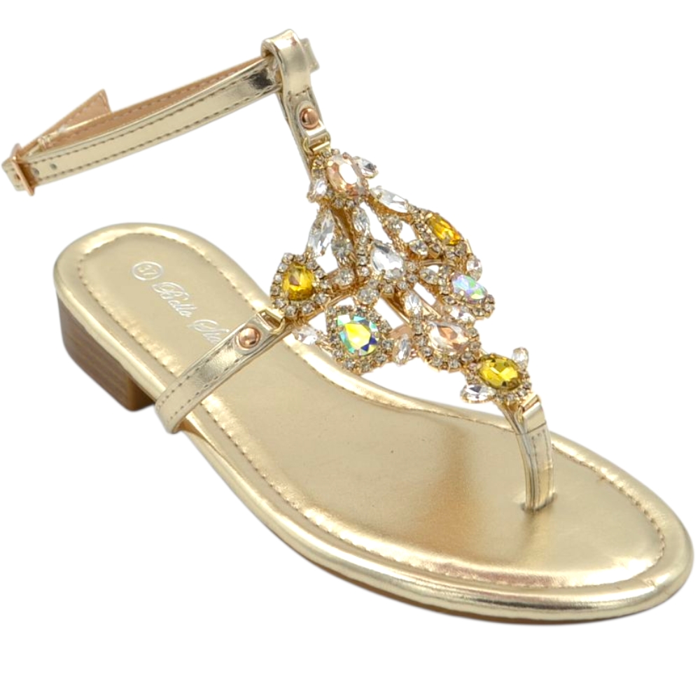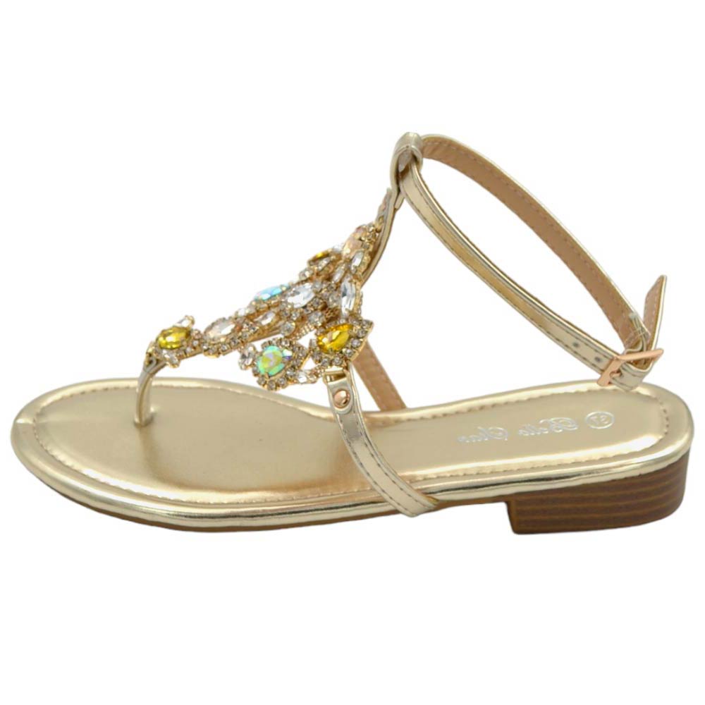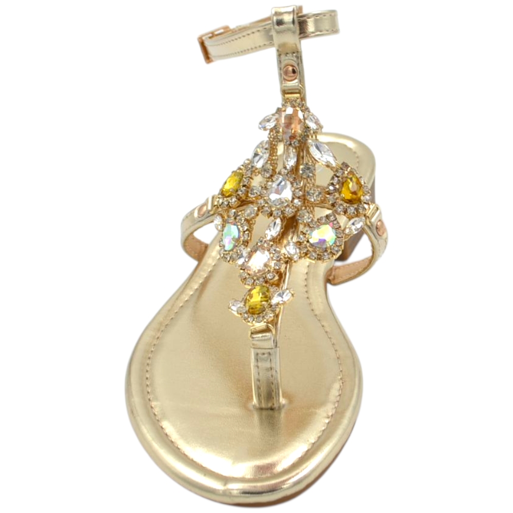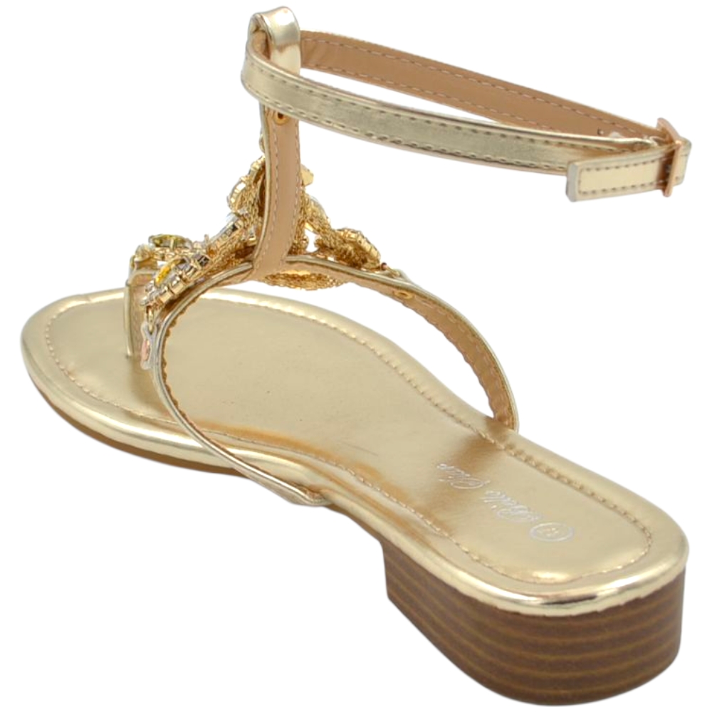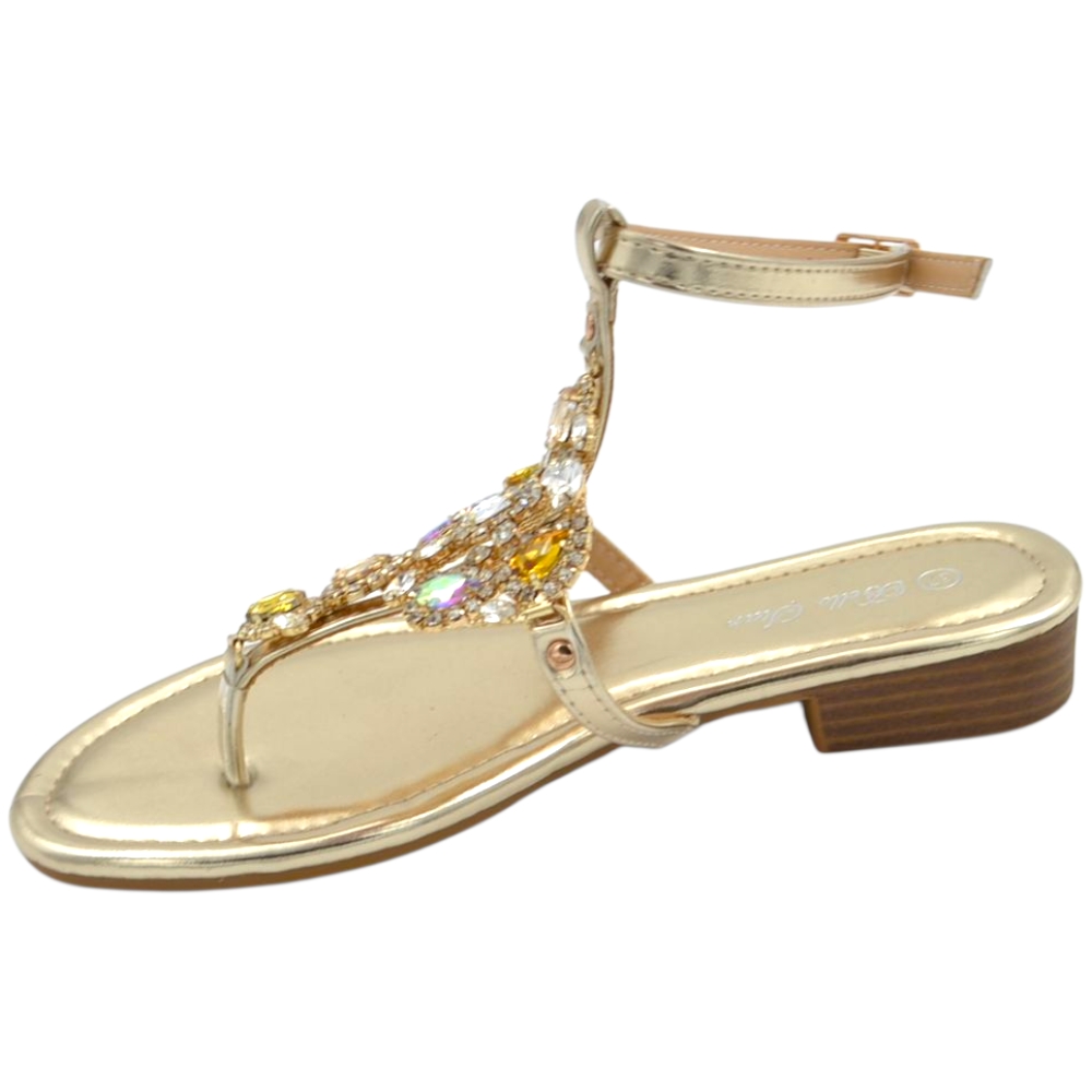Sandalo basso donna infradito con cavigliera gioiello oro pietre colorate interno morbido tacco 2 cm
