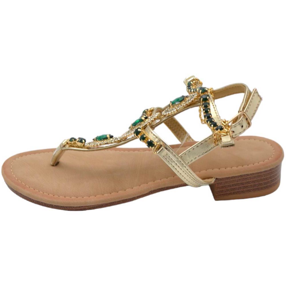 Sandalo basso donna infradito con cavigliera gioiello oro pietre colorate verdi interno morbido tacco 2 cm
