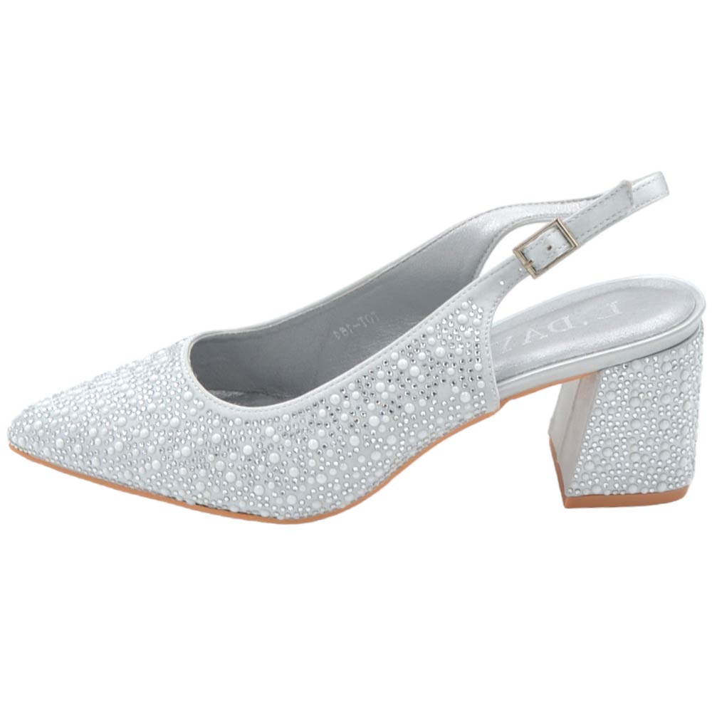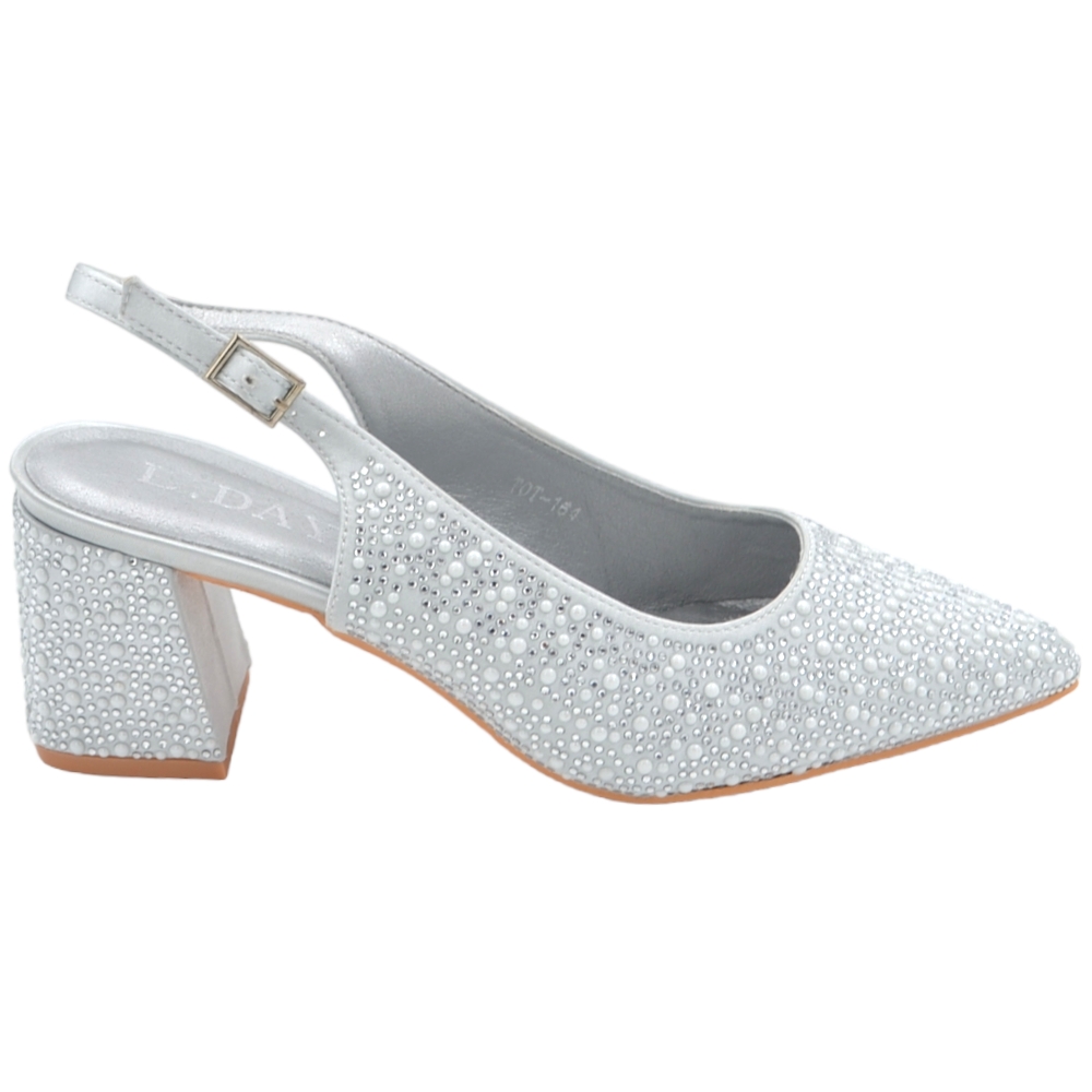 Scarpe donna decollete slingback argento con microperle e brillantini cinturino regolabile alla caviglia tacco 6cm