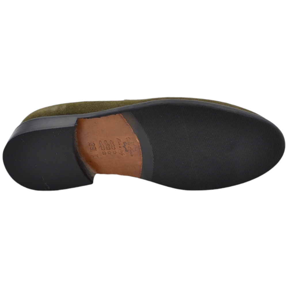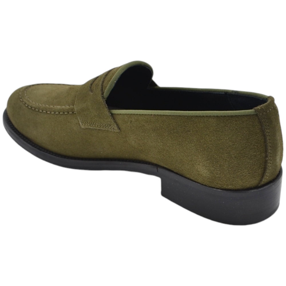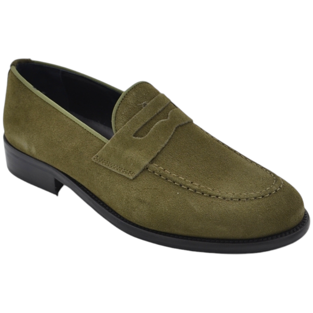 Mocassino uomo in vera pelle scamosciato verde con bendina fatte a mano con cuciture college in rilievo made in italy